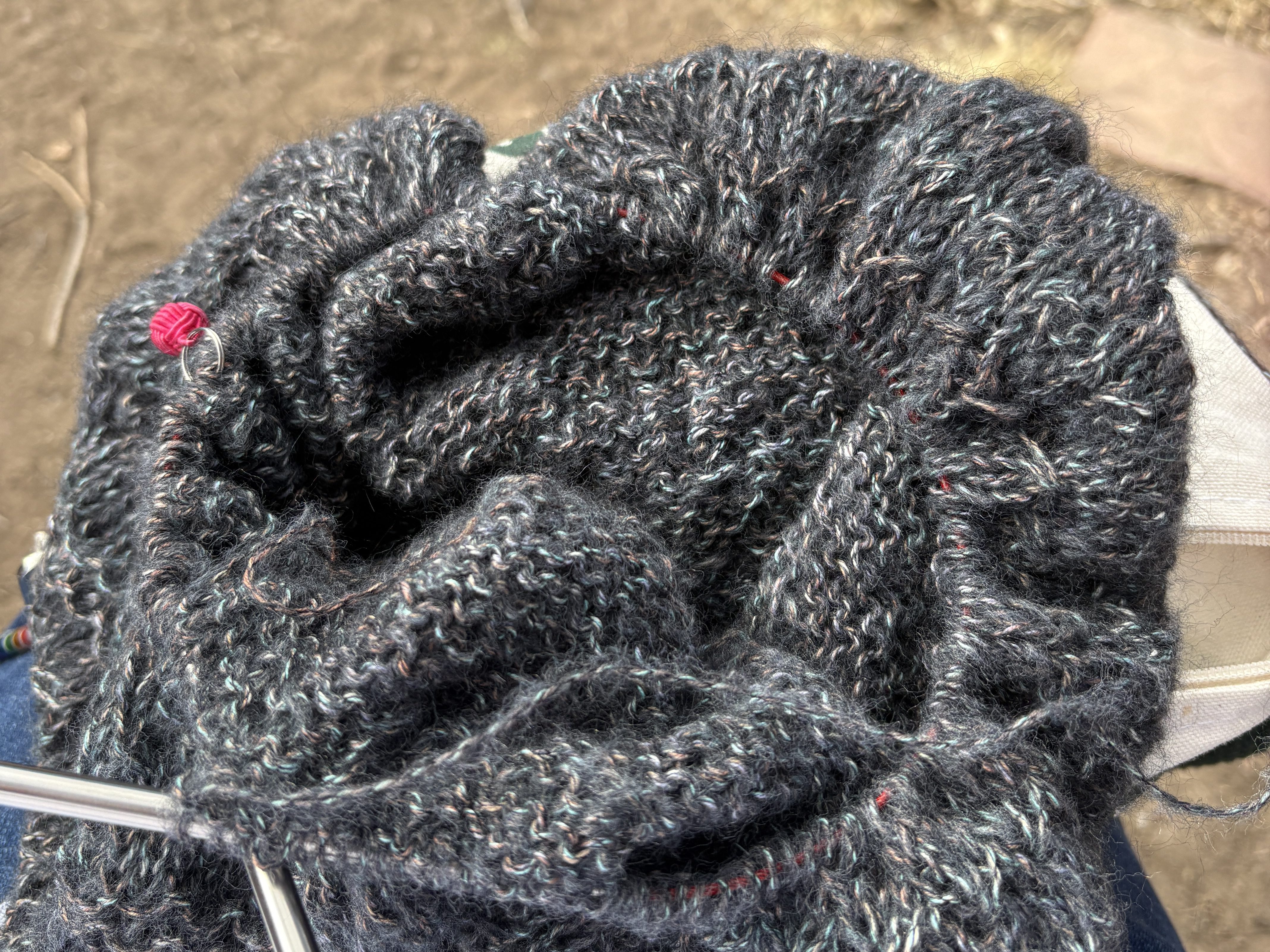I haven’t taken any photos of my knitting other than this one … taken while the baby was at his 6-month check up (getting four vaccines!) and the old folks and the dog enjoyed some time in the fresh air and sunshine. The weather was glorious but there’s no snow in Denver. I’m concerned for what that means for the summertime … this has been the least snowy winter in the last 40 years.