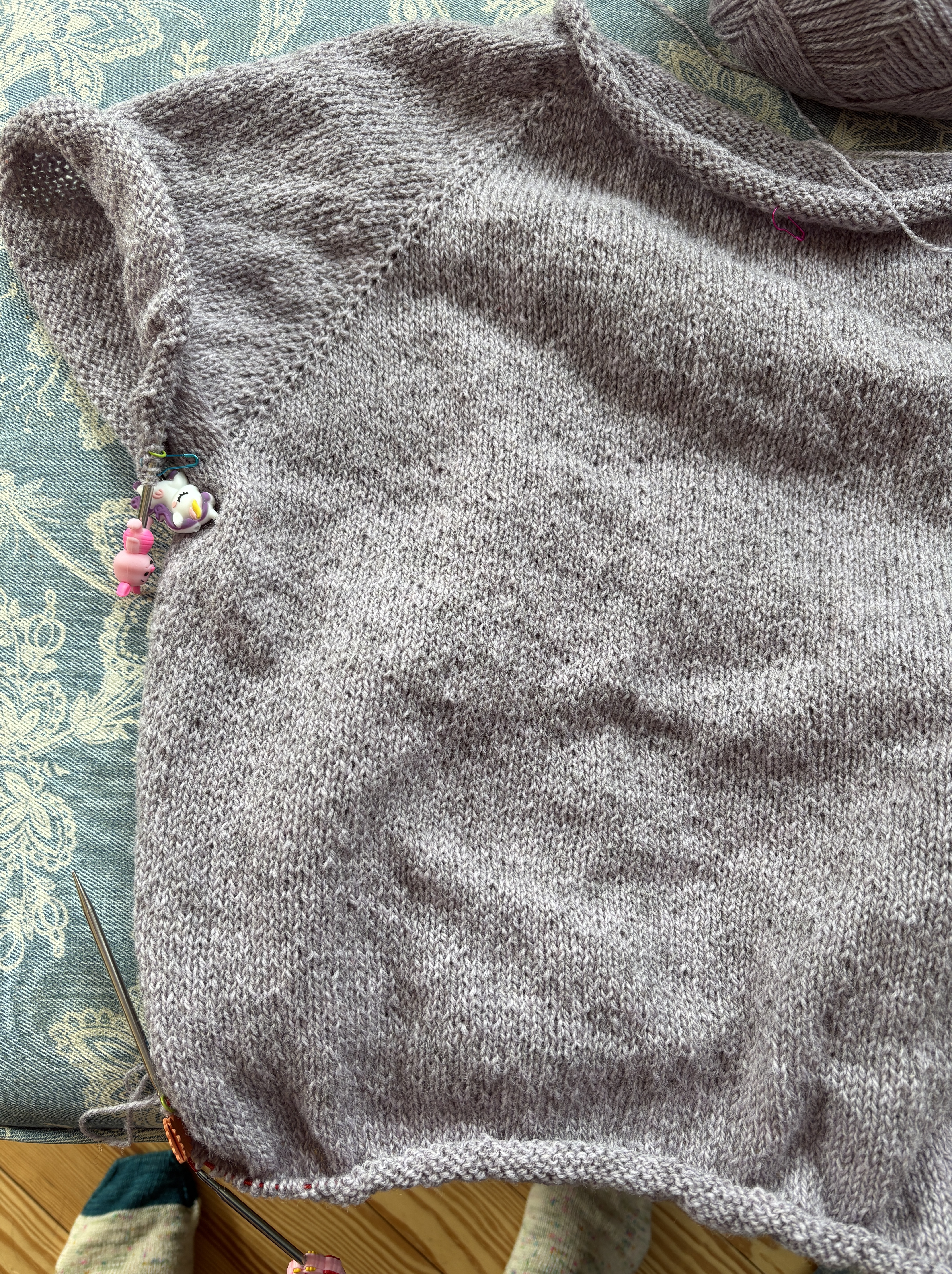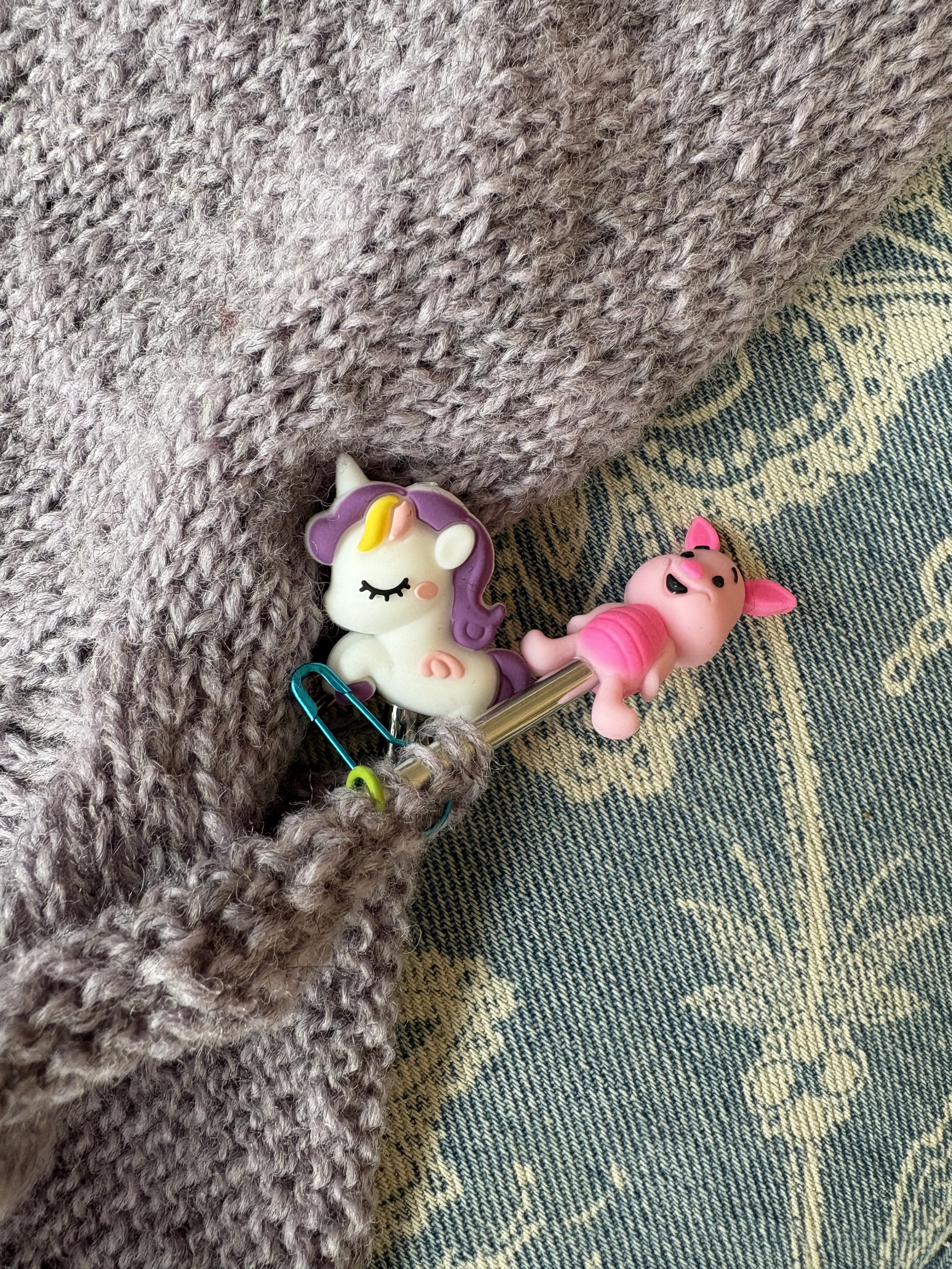 Yesterday I really worked away at my Vanilla Sweater for my college roommate. I believe I am close to being able to split the hem and finish the body. We chatted last night about lengths and she has measured a couple of sweaters she loves and I’ll knit a total of 13 inches for the length including the hem. Sleeves will be 15-16″. Now I can finish! It’s exciting when I get to this point and this sweater is so great for knitting while socializing because there’s really nothing to count. It’s just knit, knit, knit. Wonderful. And don’t you love the newest point protectors/stitch stoppers that I found at Les Laines Biscotte in Quebec City? A unicorn and Piglet! I’ve officially flipped for these little tools.
