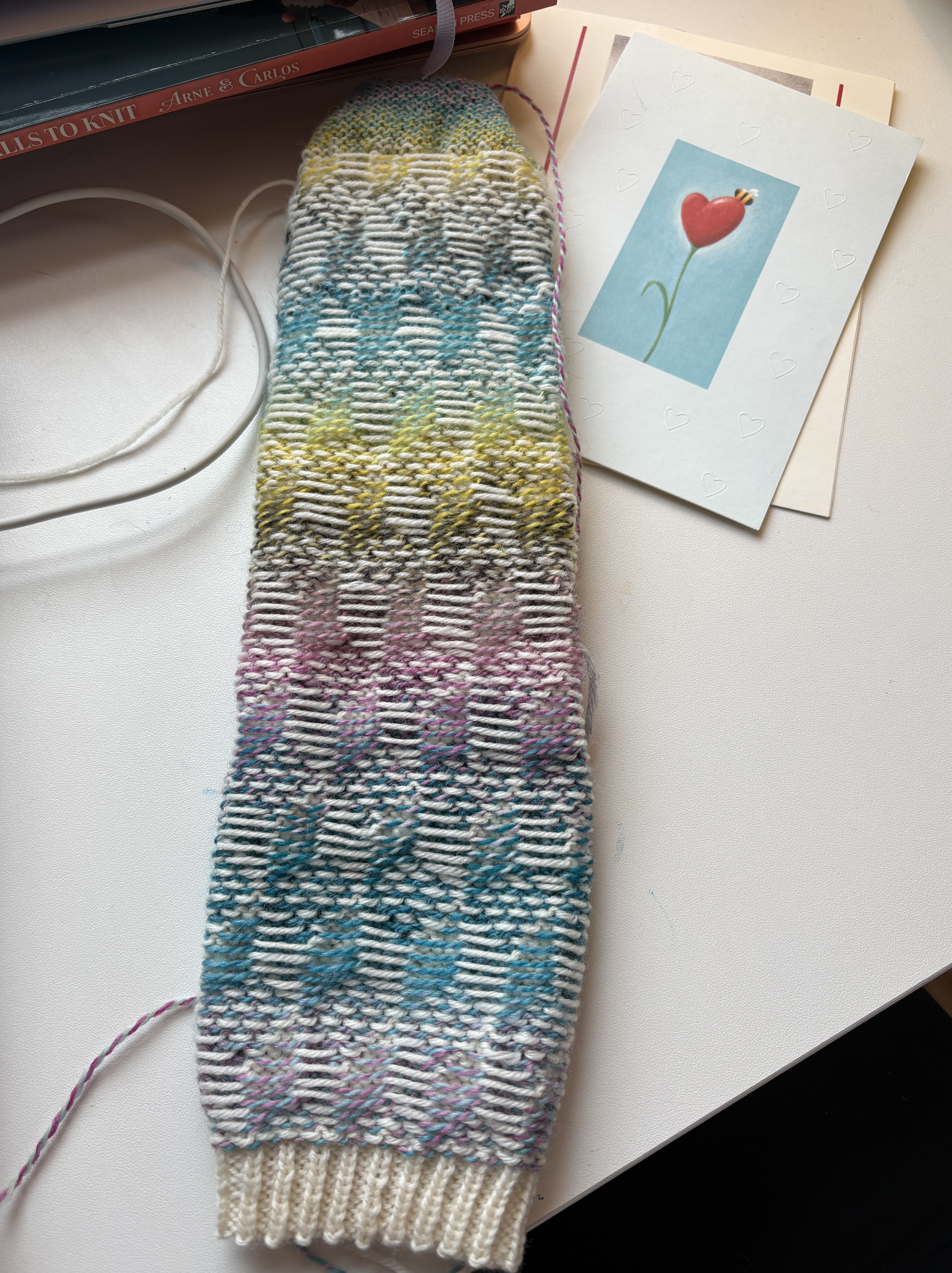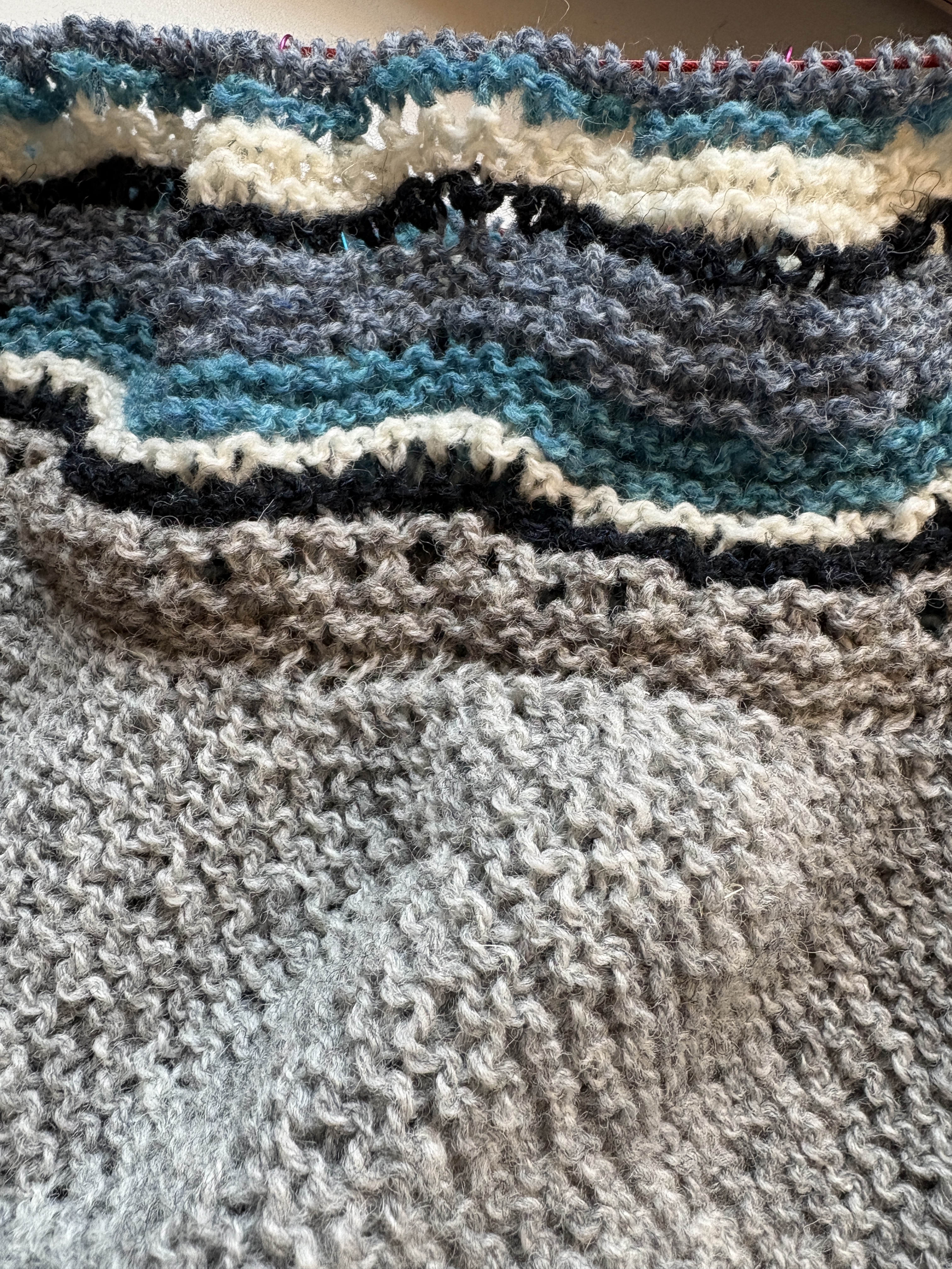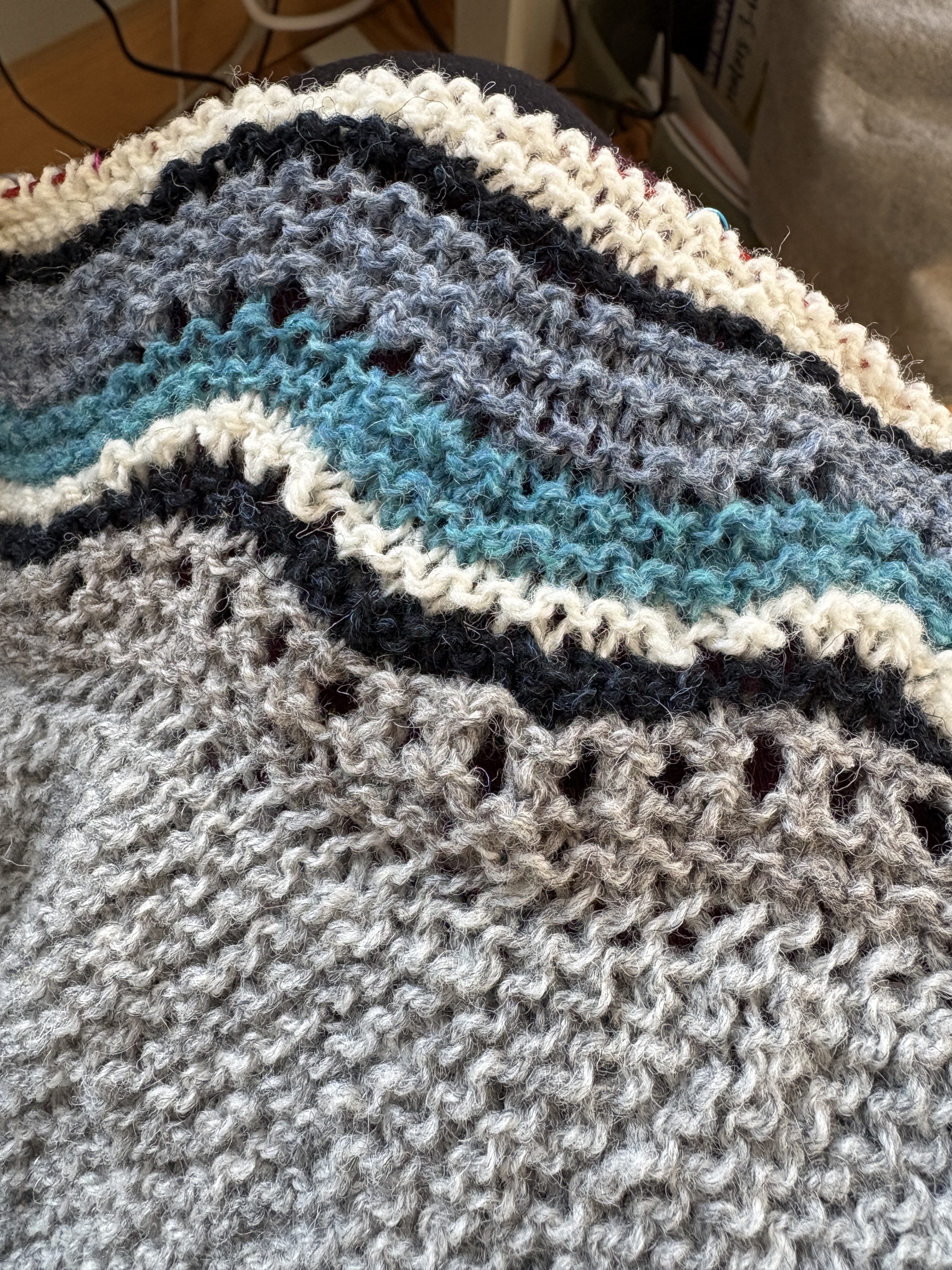 I also worked on my Hansel Hap Half and I have to say I am loving this pattern, It uses just enough brain power to pull me in completely and yet it’s not difficult. I’ve used all of the tools available for me – stitch markers at each lace pattern repeat on the border and spit splicing ten or so stitches before the end of the row before the color change (although I seldom remember this before I finish the row!) I am very happy with my color palette, too. If I had my druthers, I’d probably just work on this because it’s very satisfying right now. BUT …