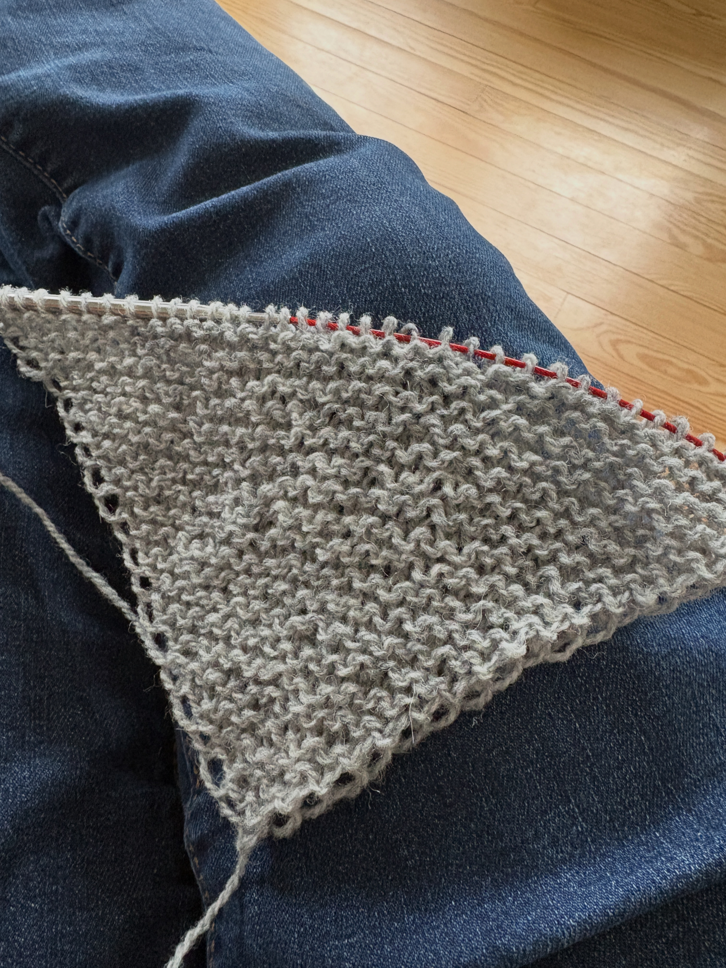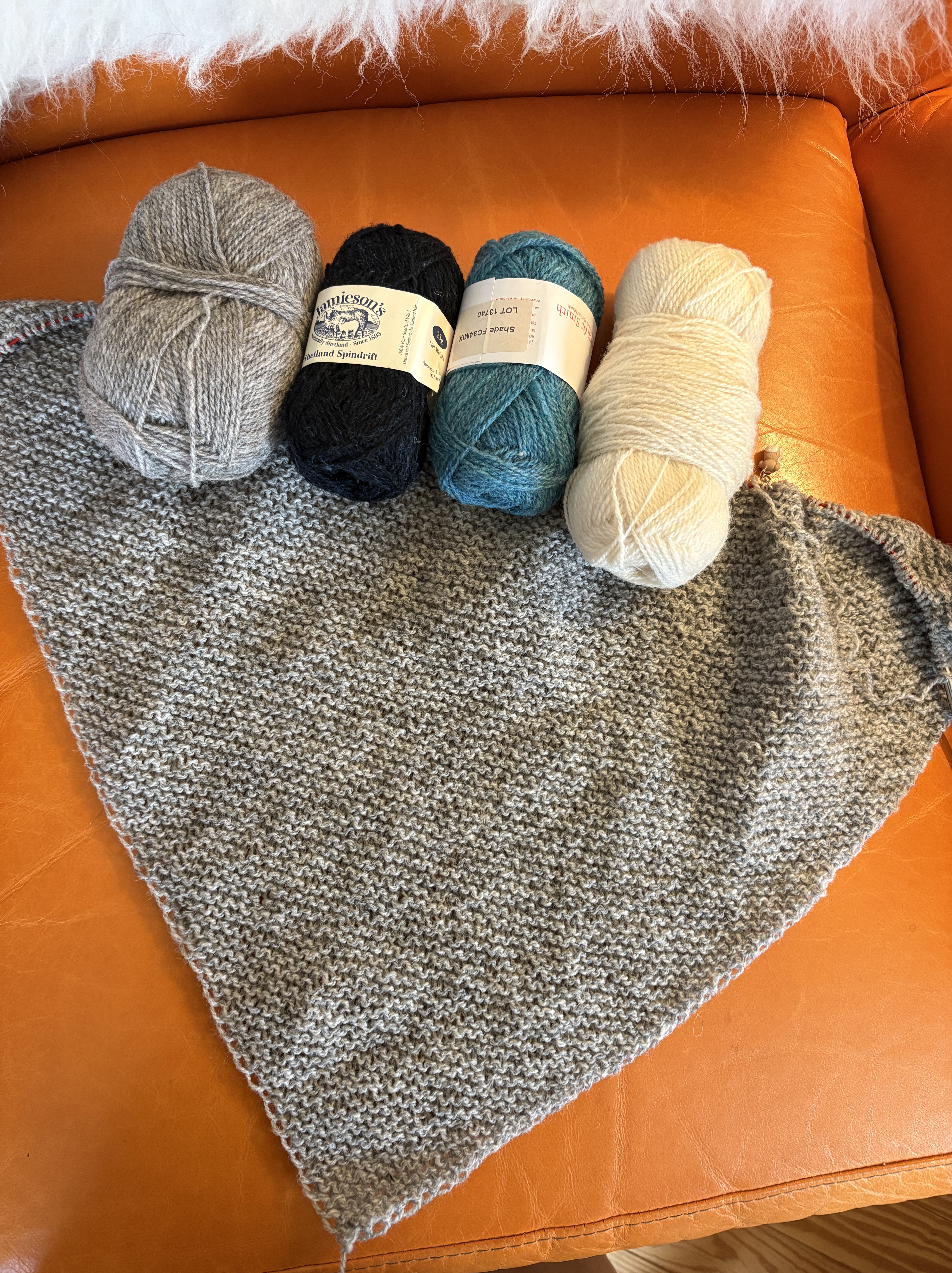 I’ve cast on a new shawl project for the Wooly Thistle’s Shawl KAL. I decided to knit the Hansel Hap Half mostly because I have the wool in my stash and I’m really working on using up some of what I have (and so I can order more?) I’m working this shawl in Jamieson & Smith and Jamieson’s jumper weight 100% Shetland wool. I’m loving it! The shawl is a simple garter stitch triangle and then the fun starts with the addition of a border in more of the main color (or in my case, slightly different color but close enough) and a super dark blue, a teal for a pop of color and a white. I’m really excited to get to the border and I’m about two thirds of the way there.