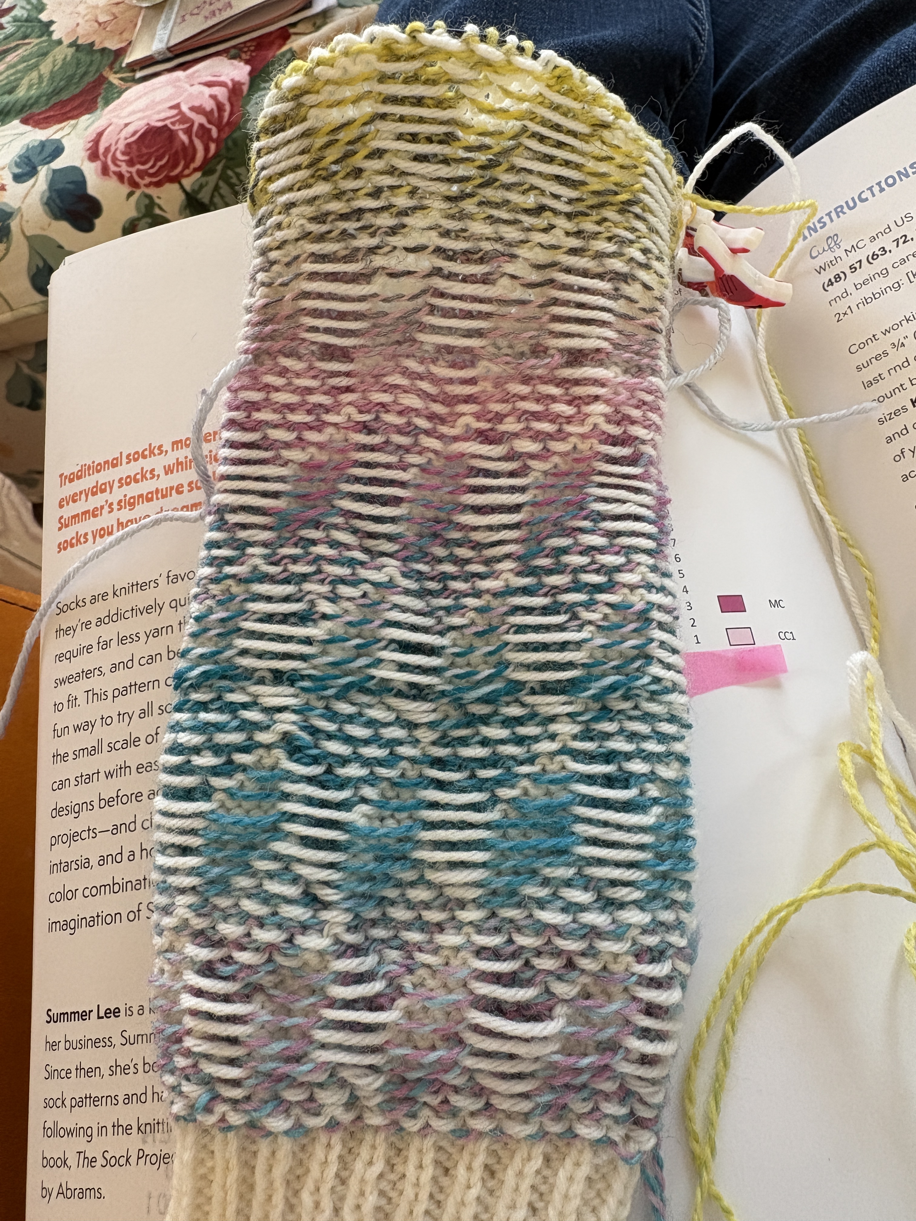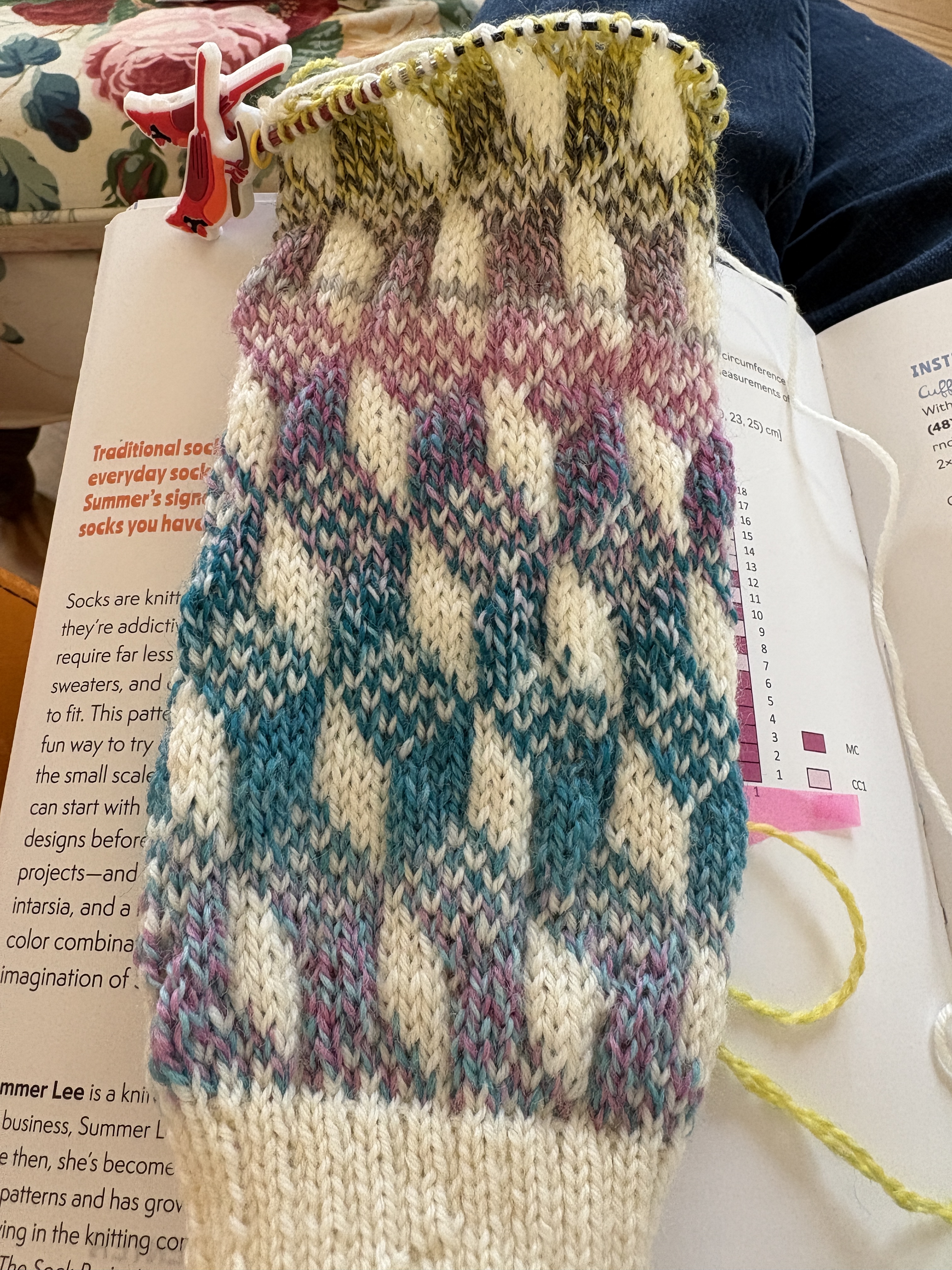 I’ve made it past the heel (it’s a forethought heel on my Escher socks which means a strand of yarn is knitted into the spot where the heel will go and then you knit over those in pattern and down to the toe.) I’m working my way down the foot now. I do enjoy the colorwork pattern! I’ve changed over to a 9″ circular needle by Knit Pro (formerly Knitters Pride) and I’m not a huge fan although I do like that I don’t have to switch needles like with DPNs. We didn’t have any Chiao Goo 9″ needles in a US 2 at the shop but I’ll try them when they’re restocked. Hopefully soon.