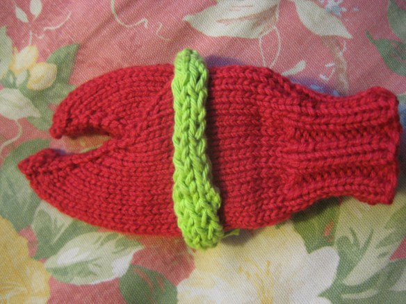 First one to be leaving the fold is the “Cooked Lobster” mittens for children. This is one that I wrote after having bought a pattern that didn’t look like lobster claws at all! I love my pattern, though – complete with the knitted band … looks like it’s just out of the pot! And if it was just out of the pot, it would be steaming hot!