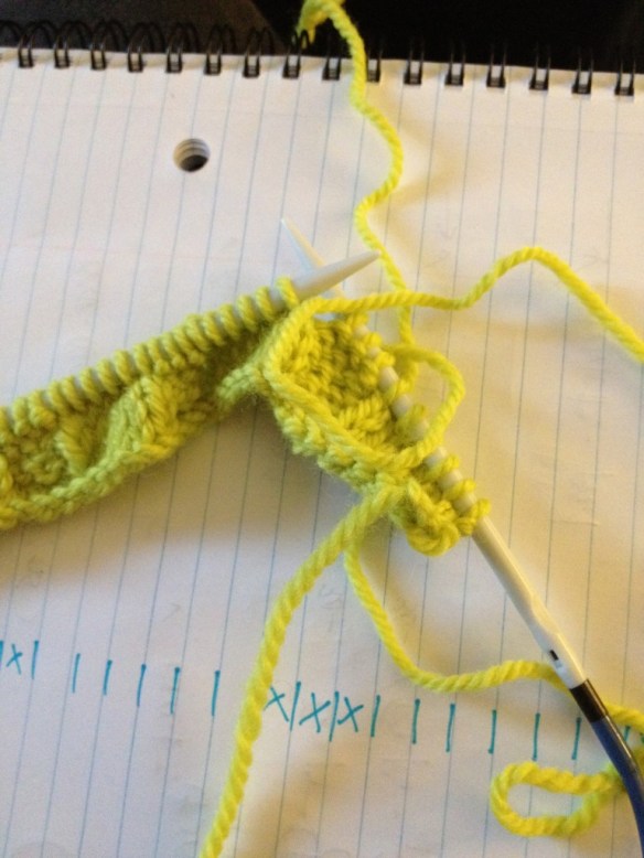 So, there you have it! The cables are going to be three stripes of wonderful in this rectangular piece of fabric. I’ve completed two twists as I write this and I think it’s going to be a very simple and yet pleasing pattern … perfect to show off the art of knitting and also to highlight the color of the yarn. The Pantone color.