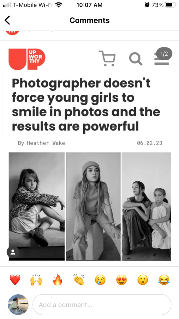 I recently commented on an Instagram Post about a photographer who took portraits of girls and let them just be themselves (didn’t tell them to smile or pose a certain way, etc.) I thought the photographs, taken for an art exhibit, were beautiful and revelatory. The comments in the post were also revealing.