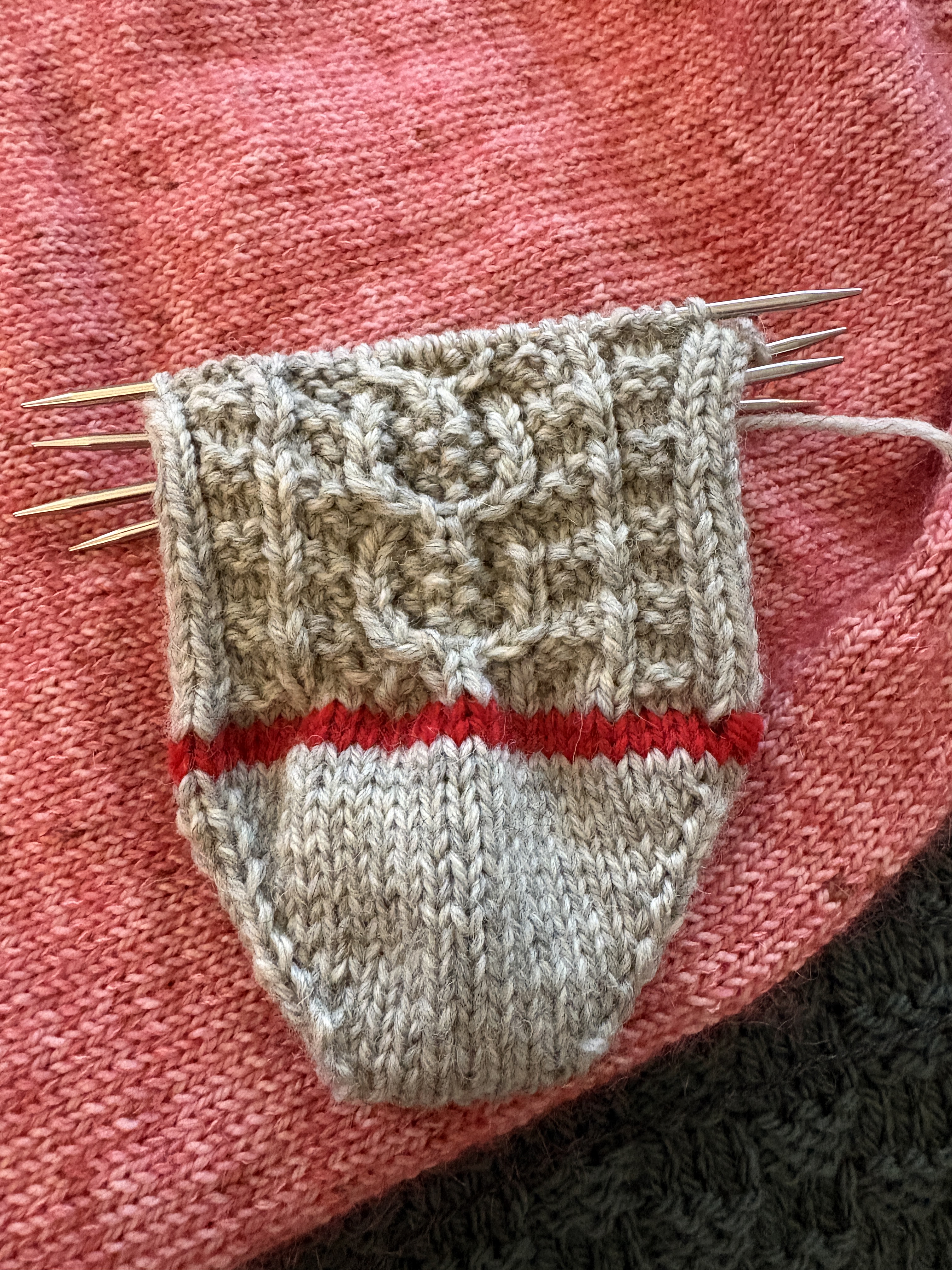 Yesterday I finished my pink Musselburgh. I really think it’s too big. I should probably have made the large rather that the extra-large. But it’s too late now. I like it better when I wear it with the gray side out because I can fold it over more and make the hat sit on my head rather than being slouchy. But if I’m honest, I’m not in love with it. Boo.