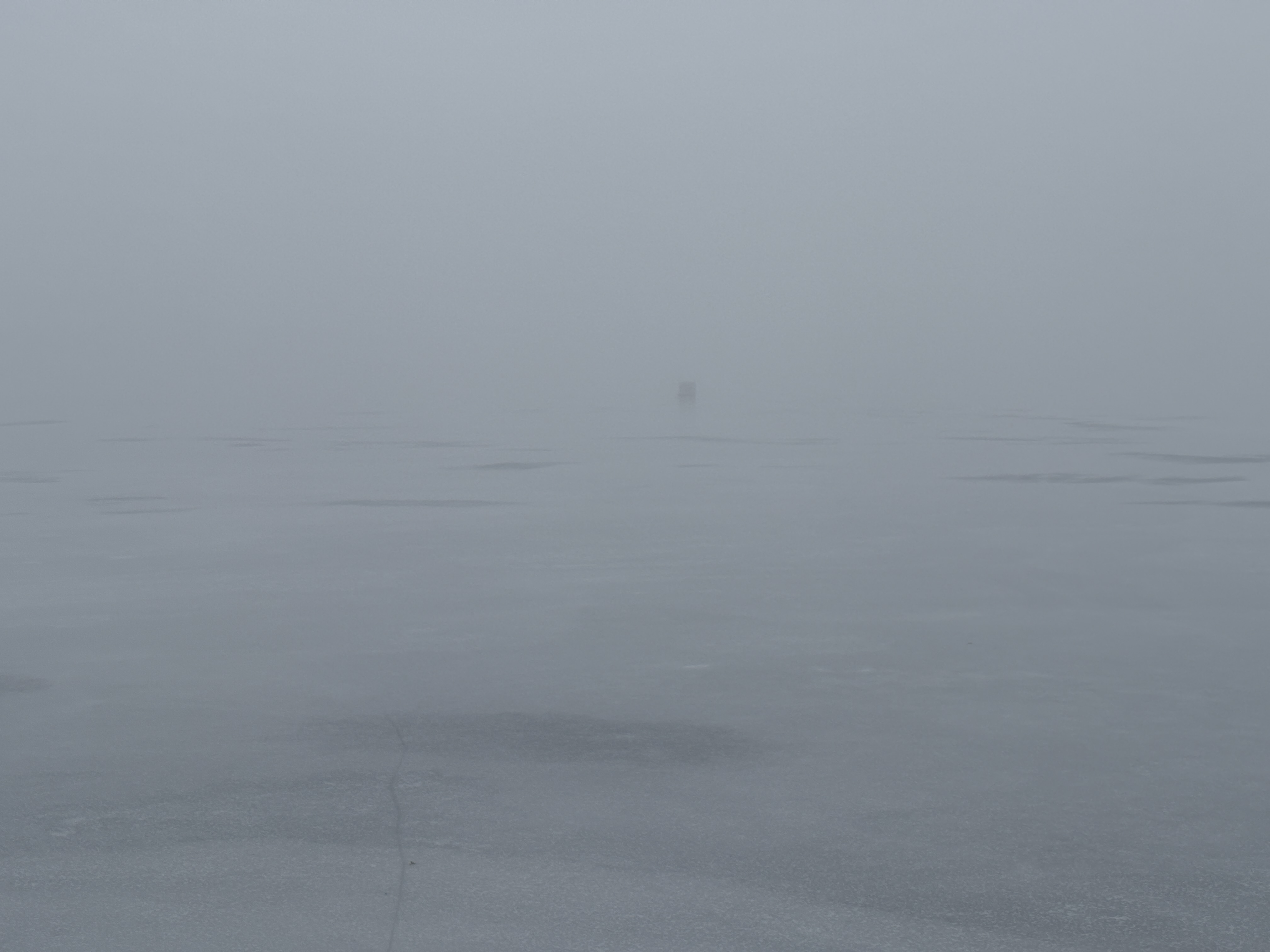 It’s foggy today! You can just see the ice fishing shack that was left out on the ice yesterday. I doubt there are any fishermen out today. The ice in front of our house, at the shoreline, is scary today and I imagine there are other spots, too. But yesterday there were cars and pickup trucks on the ice. What a difference a day makes.