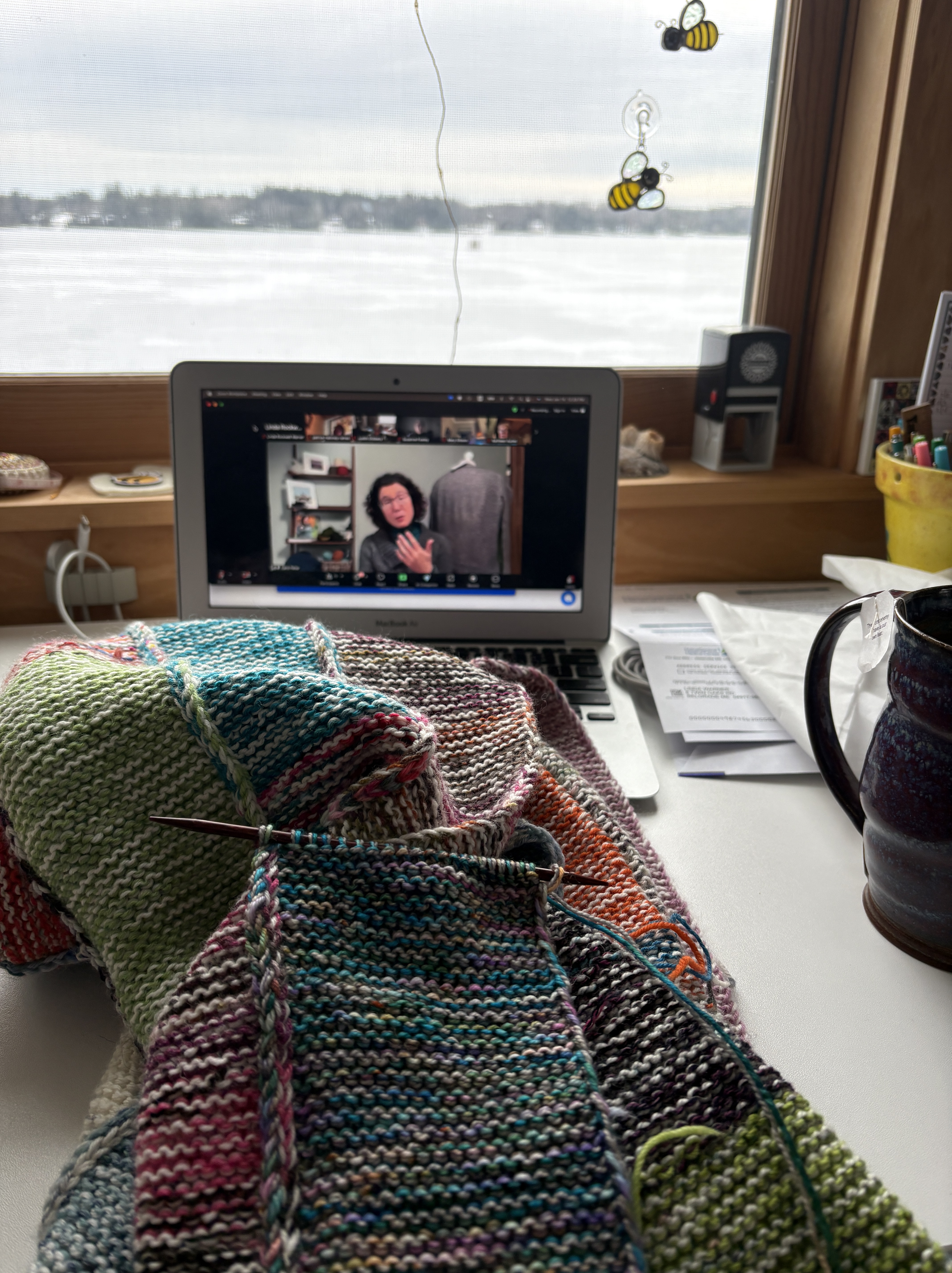 Meanwhile, I picked up my Jelly Roll blanket yesterday for the first time in ages. It had been enough time that I had to go back to my notes to see how I had done it. But once checked, I knitted along through a sweater class with Carol Feller (a year-long class on sweater construction) and a Maine Charter Schools Commission business meeting. I have decided I love the virtual option for meetings and classes. There’s so much you can learn without ever leaving your chair!