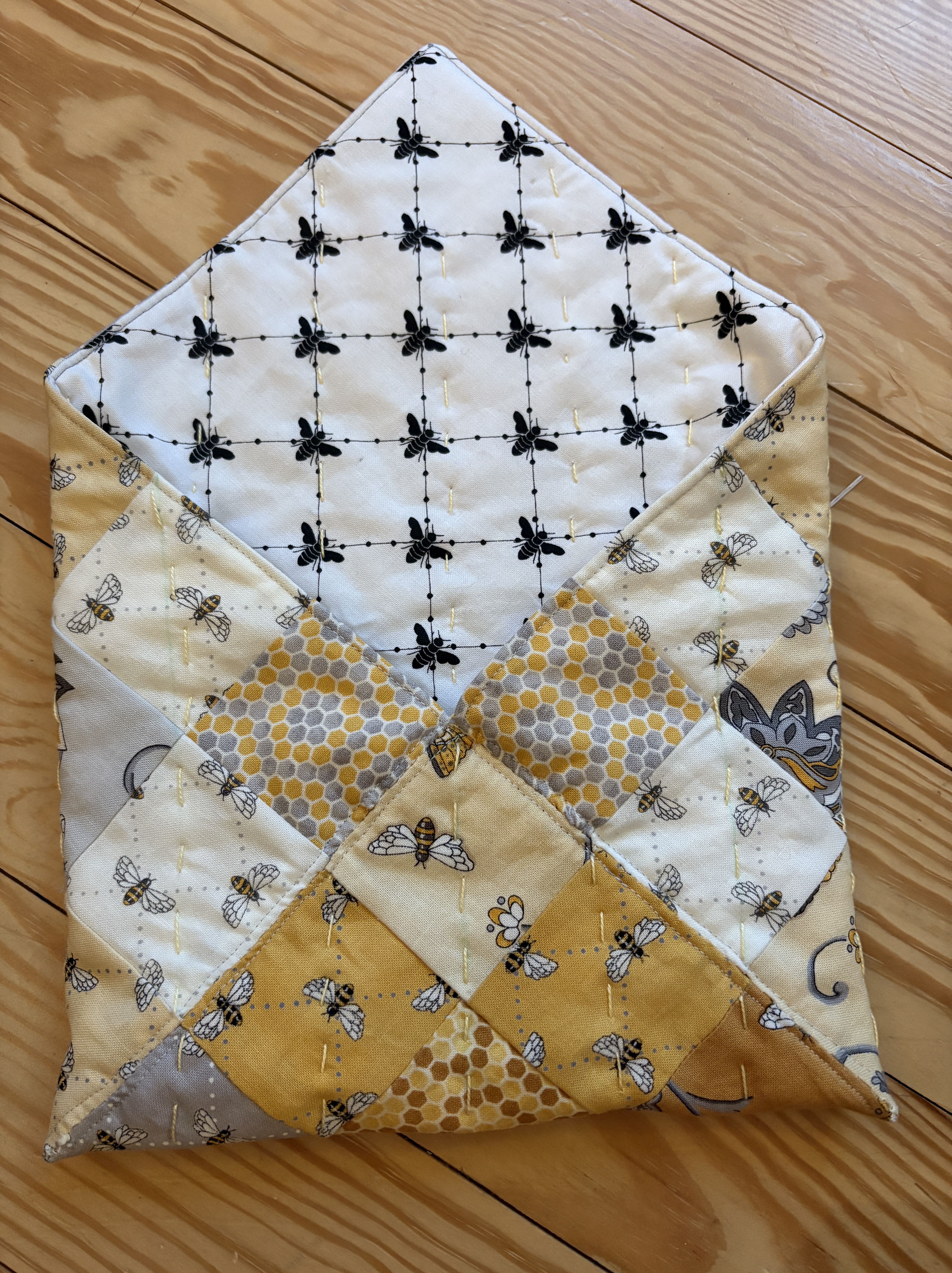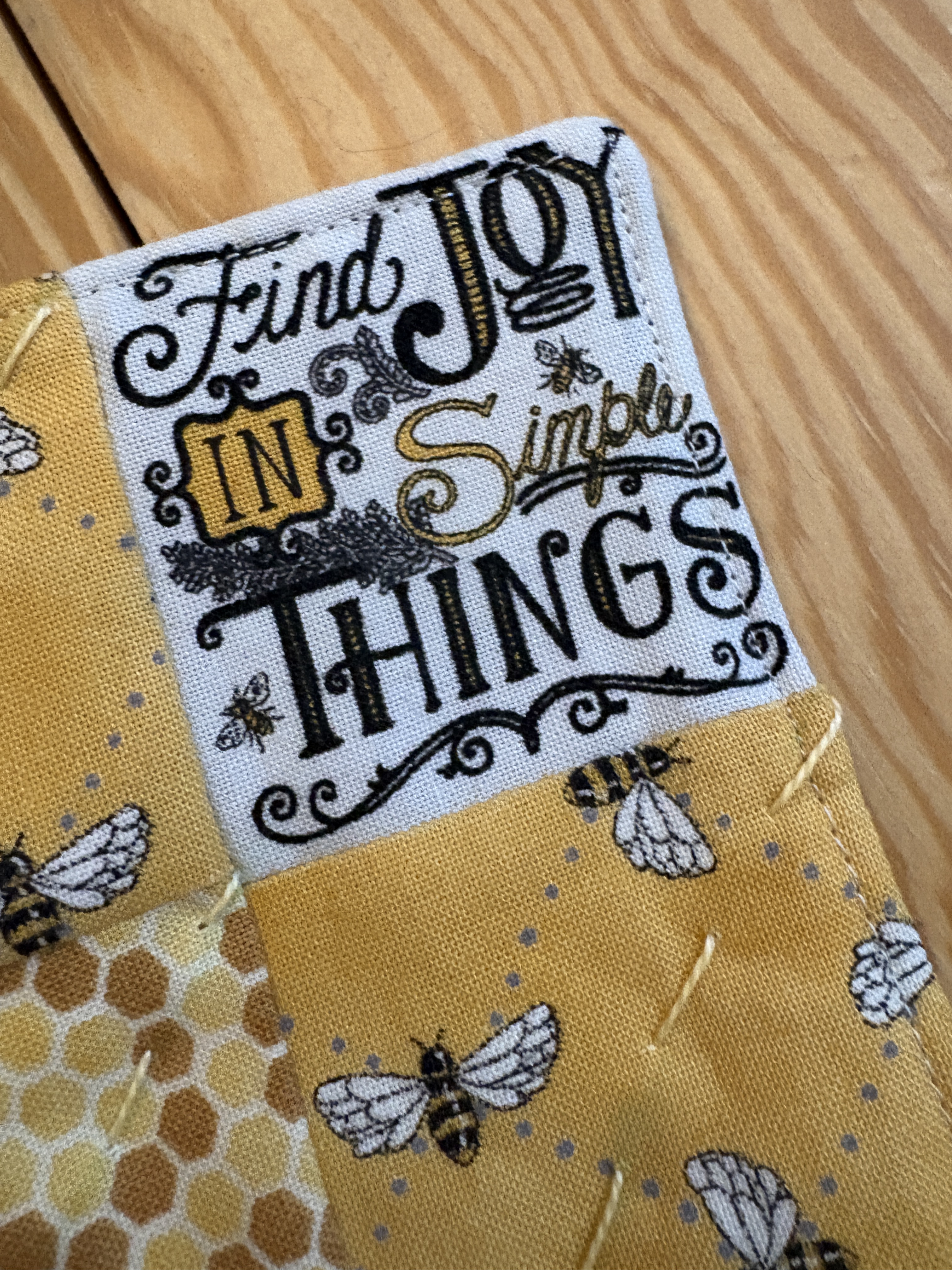I was up on the later side last night recording a lullaby for my granddaughter and knitting, of course, after a day of sewing. I decided to uncover my sewing machine after several months of inactivity and I’m glad I did. The spongey/foam disc on the thread spindle had completely disintegrated and I had a little mess to clean up. While cleaning that little mess, I cleaned the whole cabinet/table, too. Good to go for another bit. I was inspired by Kate at the Last Homely House YouTube channel and then, also, by one of my Friday afternoon knitters, to make a patchwork pouch. I have lots of fabric and thought I could cut up some bee-themed fabric pre-cuts that I have and make said pouch. And that I did.