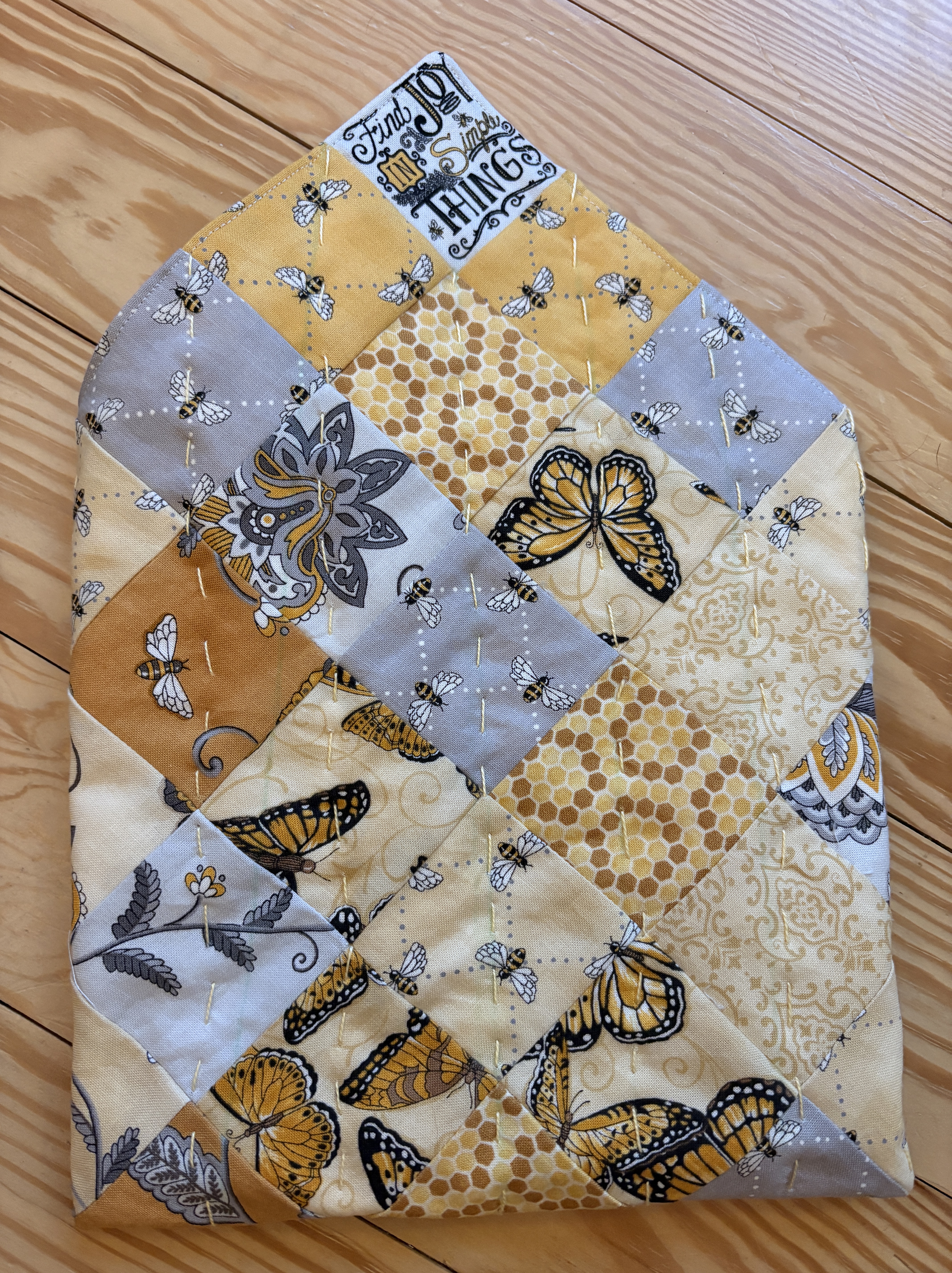 I find sewing fun but way more brain power is used when sewing because it’s not intuitive to me. I made a bunch of mistakes along the way but I am completely satisfied with the end result. I have since added a bee-utiful ribbon to the top so I can tie it closed. But suffice it to say that the better part of the day was spent cutting squares (I cut the 5×5 inch pre-cuts into four) and then arranging and rearranging them into a pattern that I liked, sewing them together in strips and then sewing the strips together to make a 12×12 inch square of fabric. I sandwiched them together with a 12″ square of lining fabric and turned it right side out before stitching all the way around. (Kate didn’t do this and I don’t know if I would the next time but it’s good.) I hand quilted it next … and remembered how I like to stitch by hand. I have another project that’s been sitting in time out and maybe it’s time to resurrect it, too. I am so happy with the result and now I just have to figure out how I want to use it.