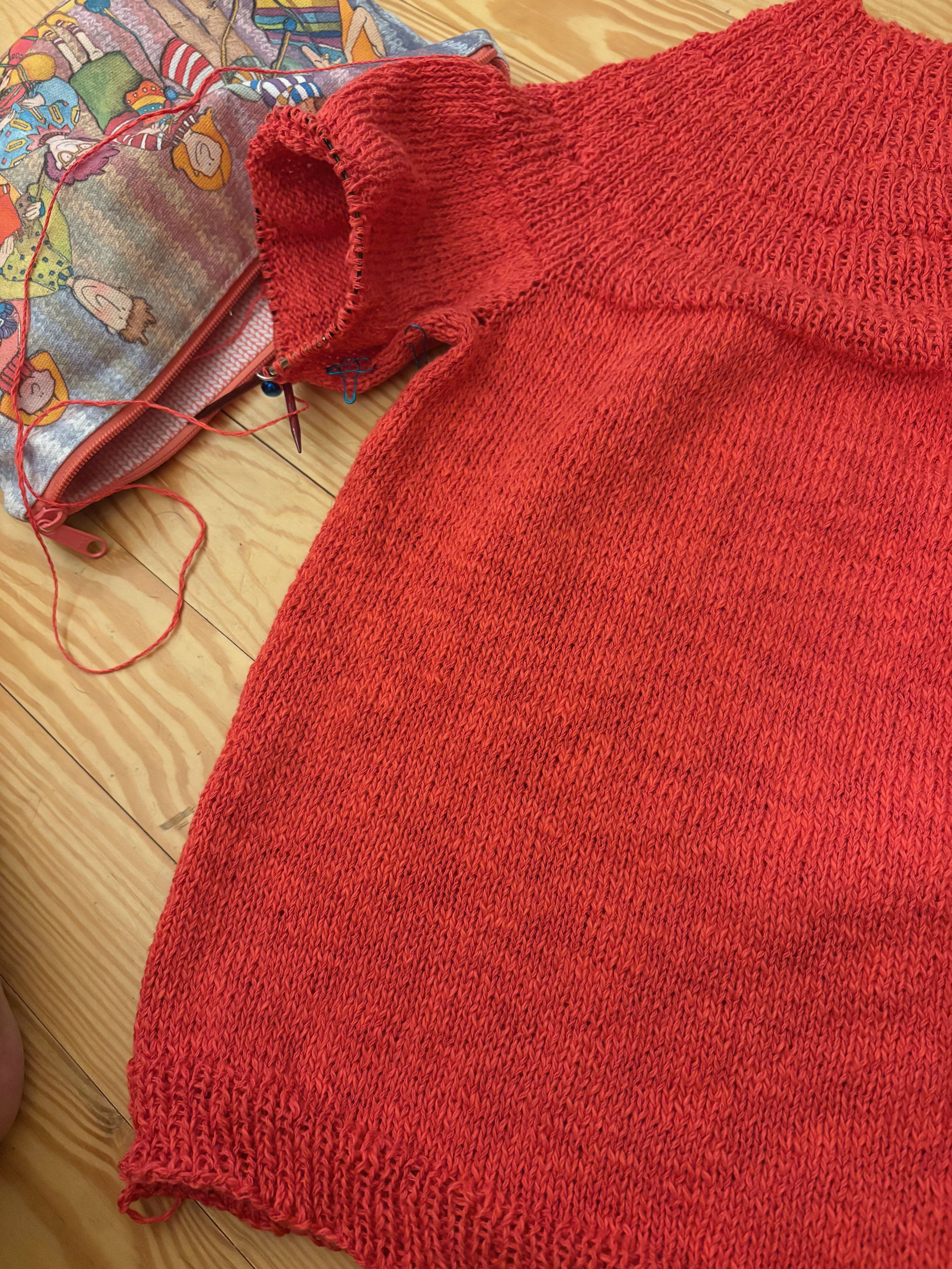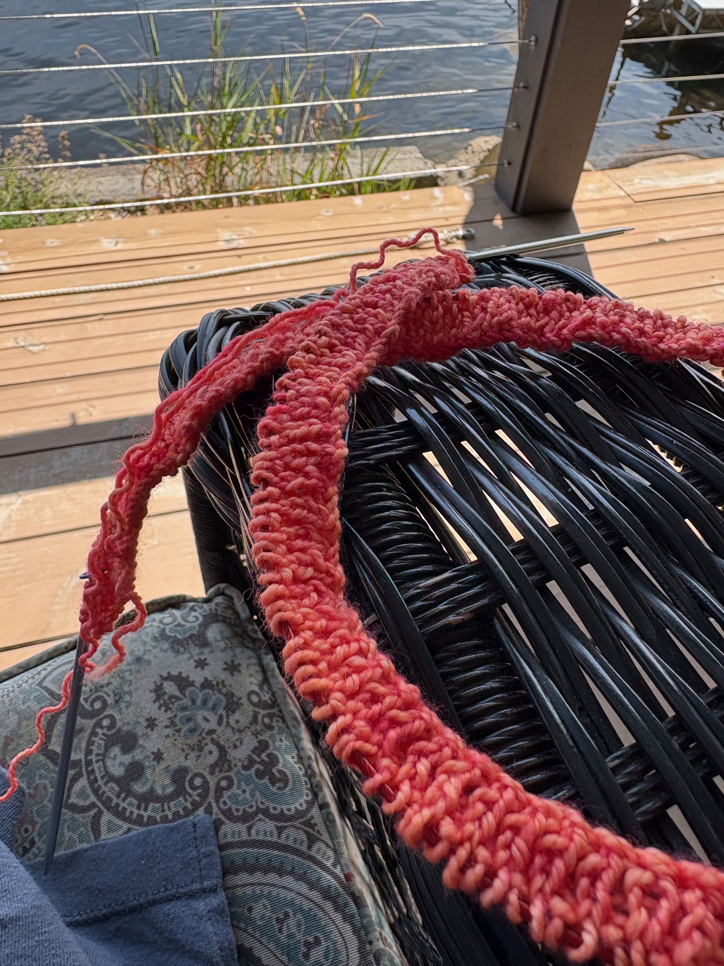 I’ve been knitting every day. On my needles, I have a Stockholm Slipover in stashed yarn. I am really happy with the way it’s knitting up and I am almost down to the ribbing which means there is a bit of stockinette and some ribbing at the bottom, around the sleeves and neck and then I can wear it. I’ve also cast on a Musselburgh hat in a pink HuMade yarn that I got a Knitty City when I was in the city a while ago. I’m holding it with a strand of Berroco Aerial mohair/silk. I think I’m near the end of the increases and ready to hit the round and round of stockinette stitch.