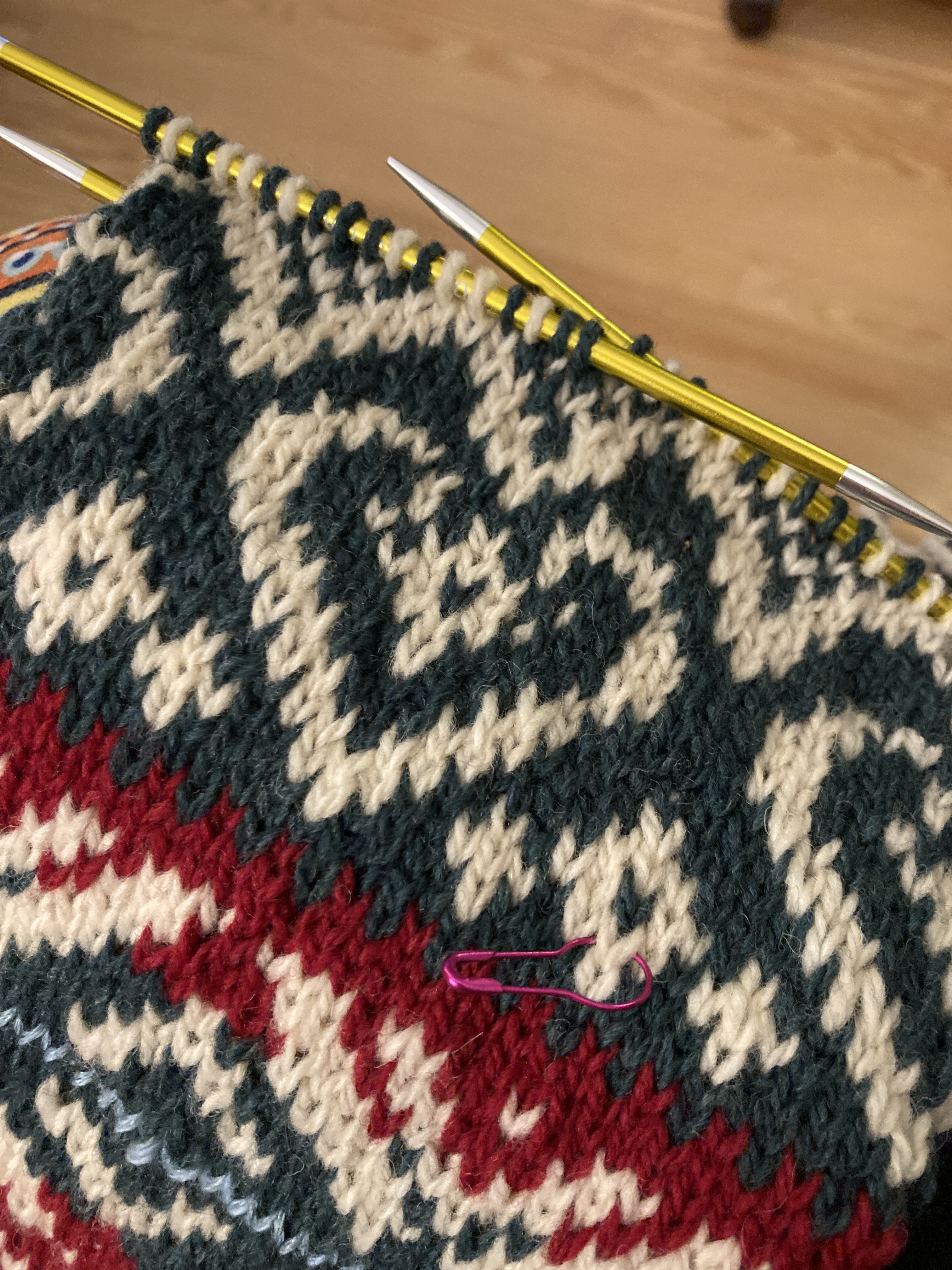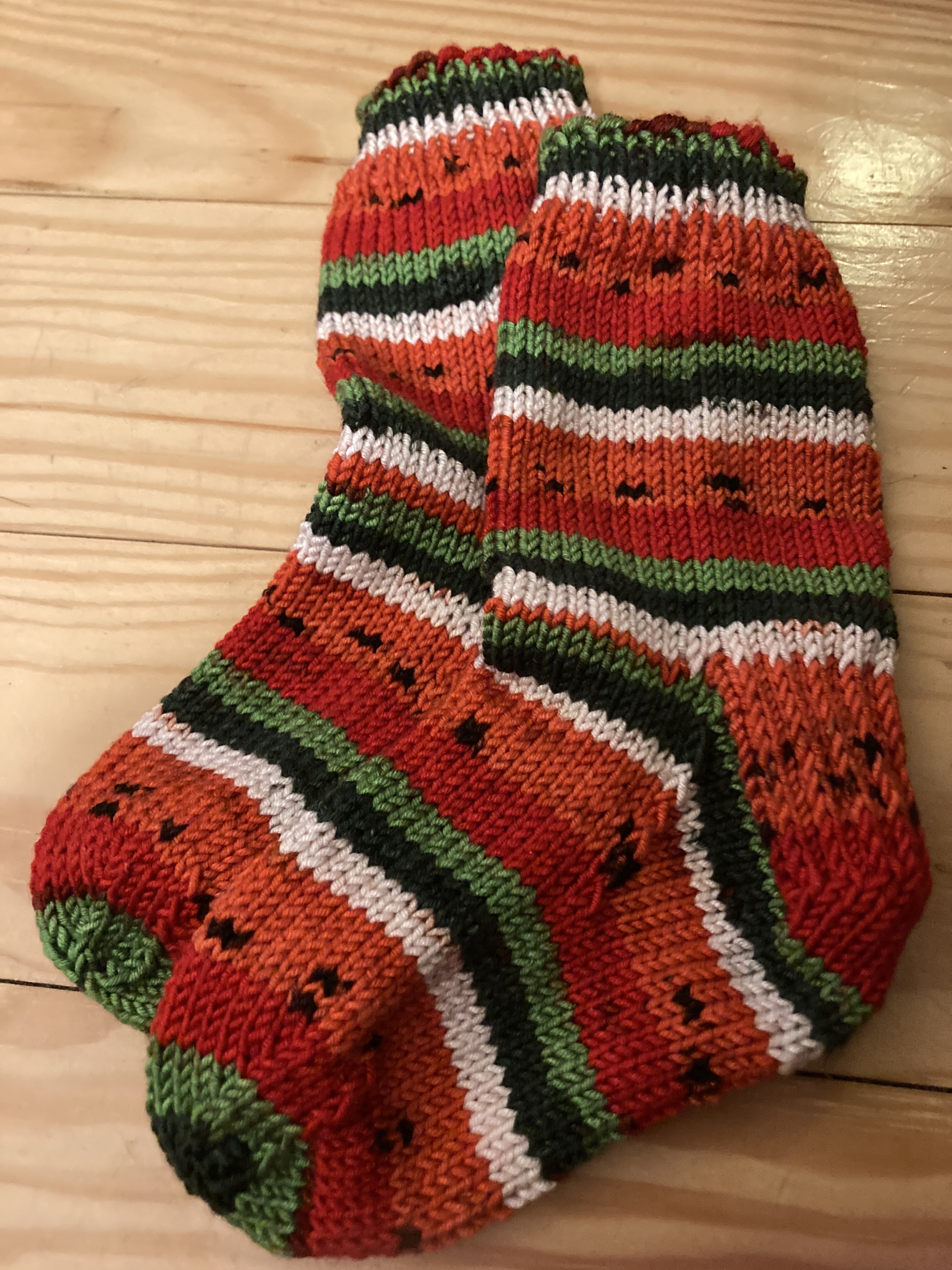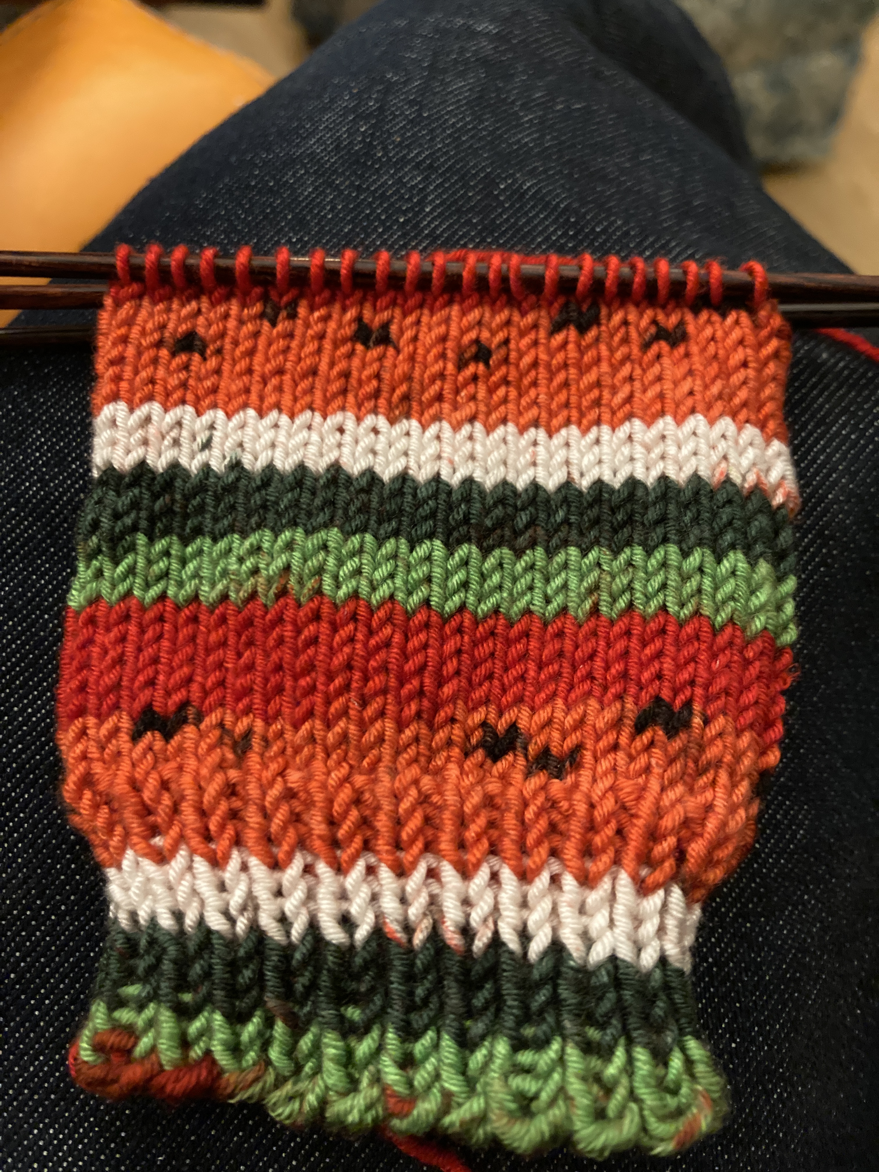 I’ve not felt like doing any other knitting, and particularly not knitting that takes brain power. The projects that I have in progress are the fair isle bag from the class that I took, and a couple of pairs of socks. I really want to cast on a new project but I “should” knit a couple of sweaters to reduce my stash but I am not feeling motivated to do any of them. What’s a knitter to do?! I would also think about knitting a new shawl or another Musselburgh hat … but I can’t decide on yarn. Ha! Ha! So, I’ve been working on my Jelly Roll blanket and the watermelon shorties … both really simple projects. No pressure, right?