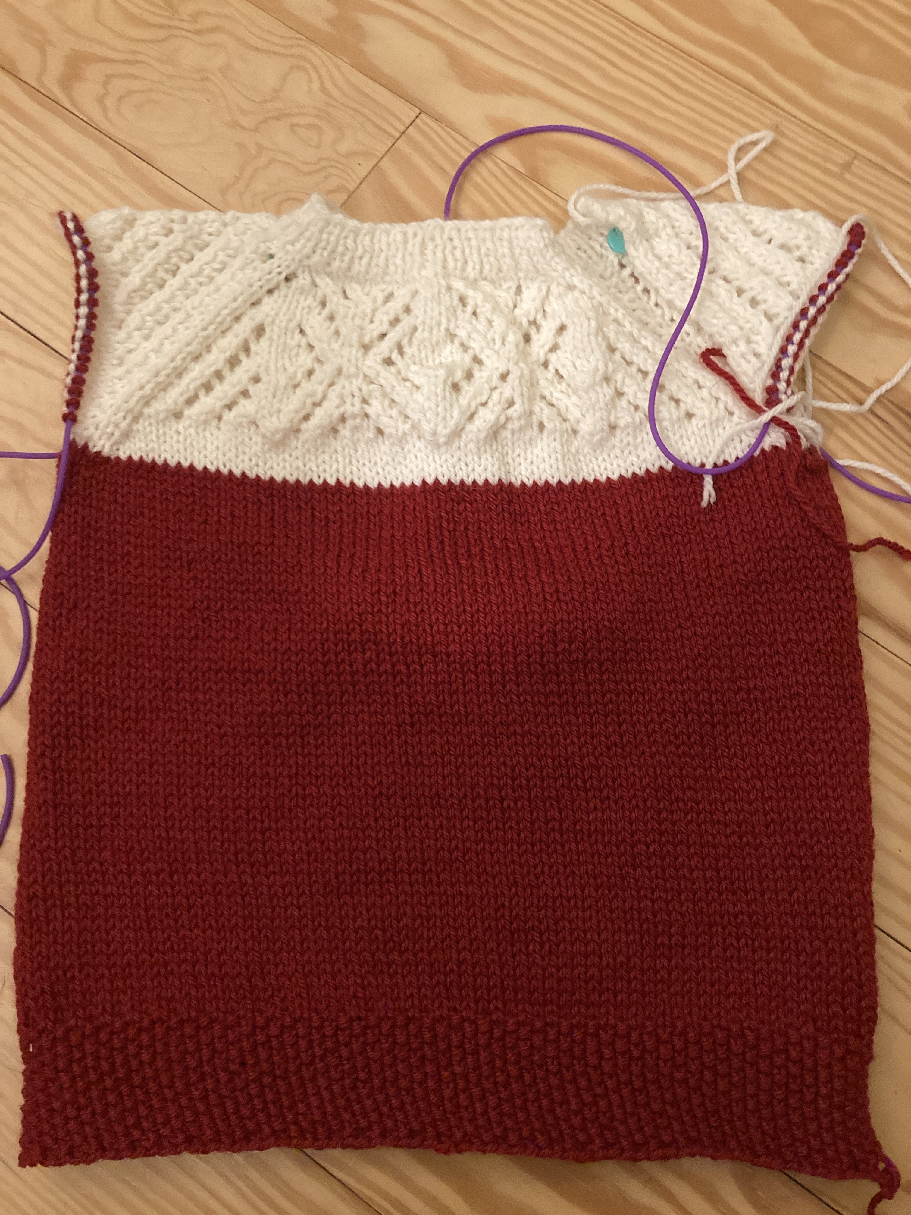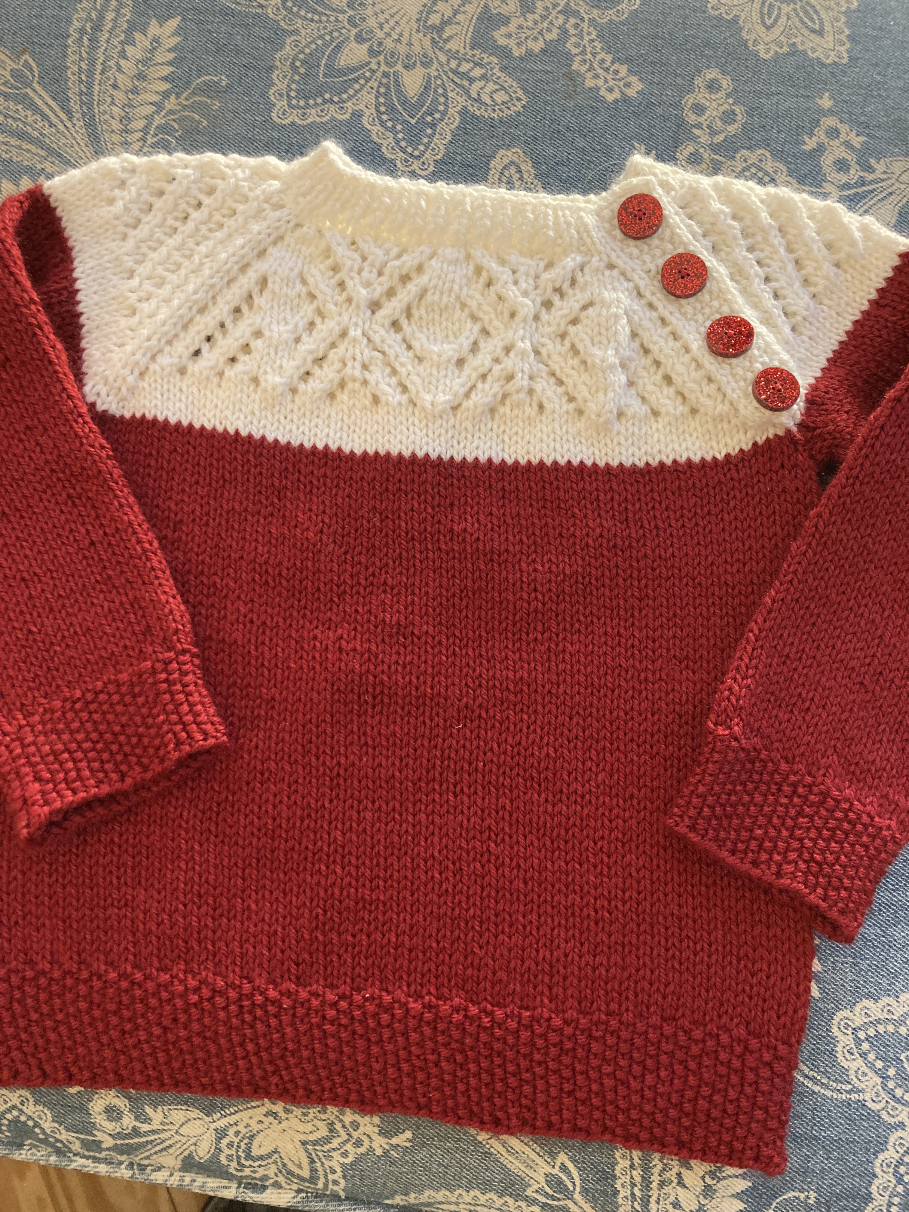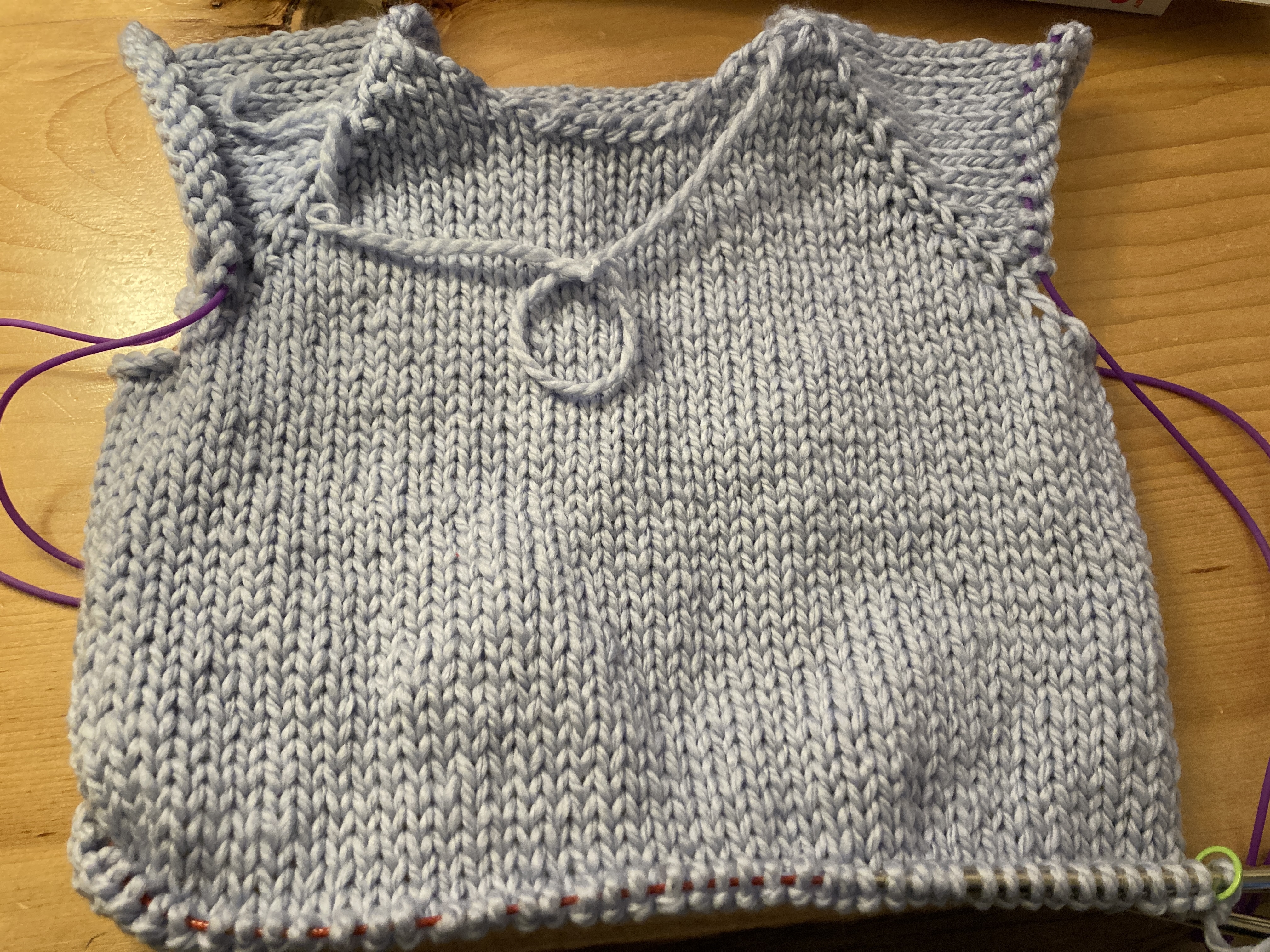 I’ve been thinking of ways to use up some of my stash and this was, I thought, an easy one. I have three hanks of Cascade 128 in this pretty almost periwinkle blue and I thought I’d make a larger sweater for my granddaughter. BUT when I knit the pattern according to the instructions, I didn’t like the fabric. It was too open. So I frogged back and started again on a US10 needle (seen here) and while I like the fabric better, the gauge is way off so the size is one that will fit her now – and she doesn’t need any more sweaters right now. SO … back to the drawing board. I am going to do this the right way next time and actually knit a swatch. I don’t often knit with bulky weight yarn so I’m not sure of my gauge and I need to figure out what the largest size I can make – I am aiming for a 3-5 year size – in a fabric that I like. I think I’ll try a US10 1/2 and see how the gauge matches up. On the US10 I got 3 stitches to the inch and the 4-5 size should be 28″ around the chest. Mine is more like 19 1/2 … not even the 26″ that the 2-3 size should be. Doing the math, I don’t think I can get 28″ even if I knit the largest size so I need to try a bigger needle. Good grief!