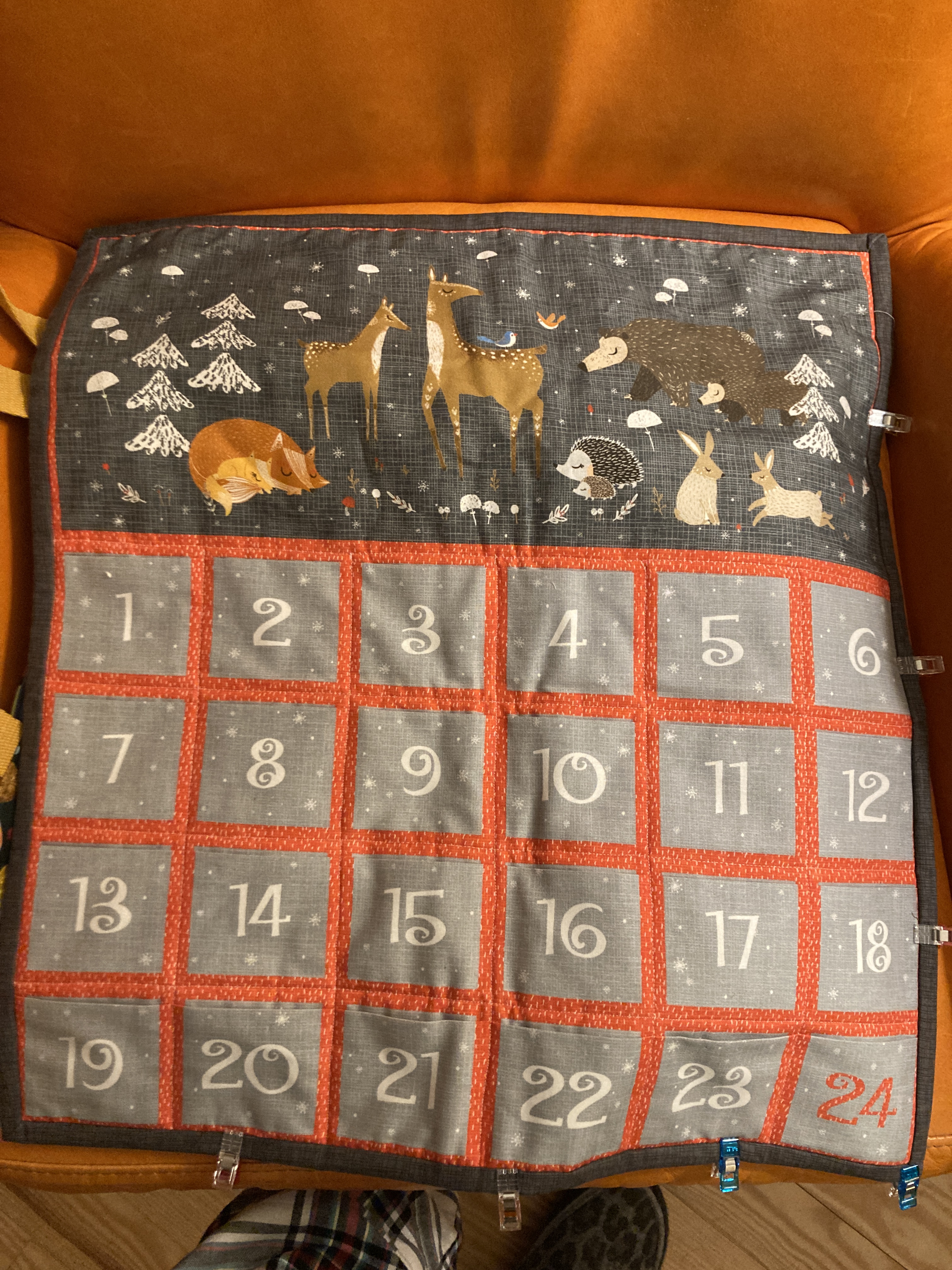 I finally remembered to ask my sweet hubby to cut a dowel for me so I can hang the Advent calendar that I made for Sylvie. I have a few things to fill the pockets (a little gift a day) and I guess I’m about 15 short of a complete calendar. I’ve got my work cut out for me between now and Thanksgiving … maybe several packets of organic gummy snacks of some kind will suffice in a pinch. Meanwhile, I’ll check Target this week. I wish we still had the Christmas Tree Shops.