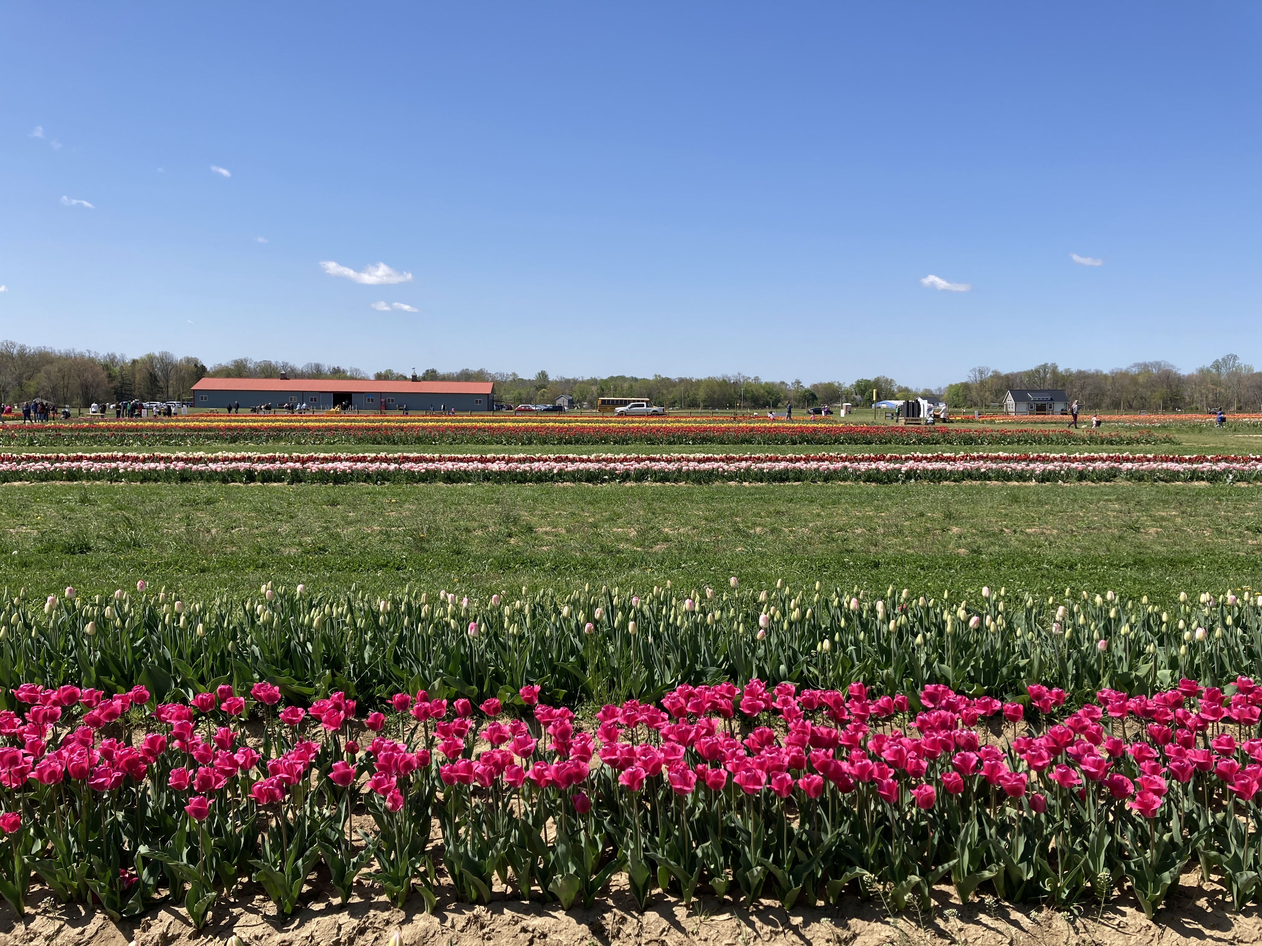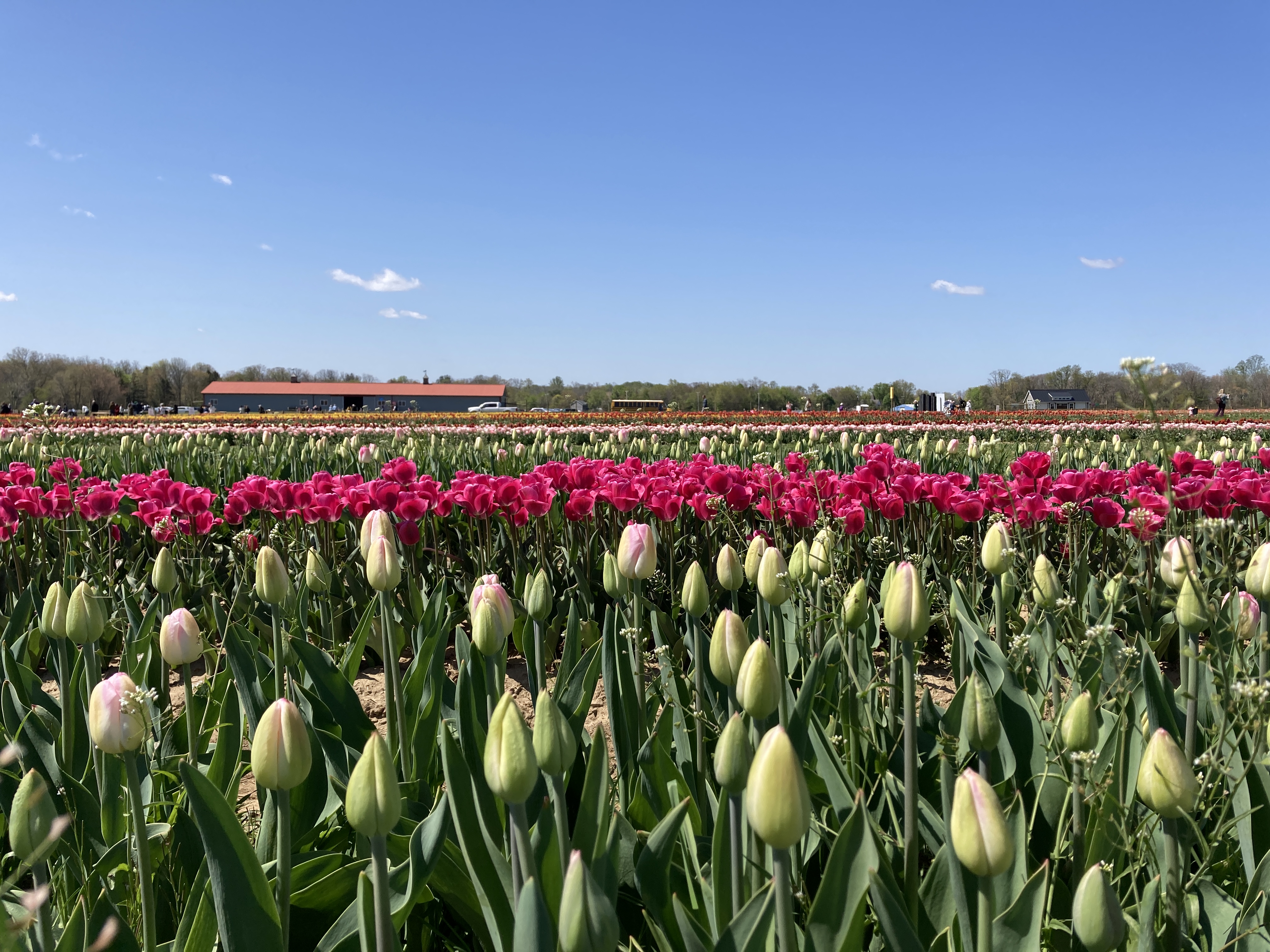 Thursday we visited Holland Ridge Farms in New Jersey. Acres and acres of tulips that you can pick and pick we did. My daughters each picked more than 70 and I controlled myself because I knew I had to transport my flowers to Maine. Suffice it to say that there was every imaginable color and type of tulip. They were gorgeous and the scent was mind boggling. I never realized that tulips had a scent. (We chose to pick mostly closed flowers, hoping they’d bloom more slowly and last longer. Note: mine are just about done as of today.) We walked and walked and walked and practically got blown away in the wind. It was sunny but very windy and we were dust-covered from tip to toe. We found a fun pick up spot and bought some subs (shrimp parm and steak pizza subs. Yum!) and root beer for lunch before heading back to the city. We happened upon a special sight on the way back to the highway – young horses in a big field, running and playing.