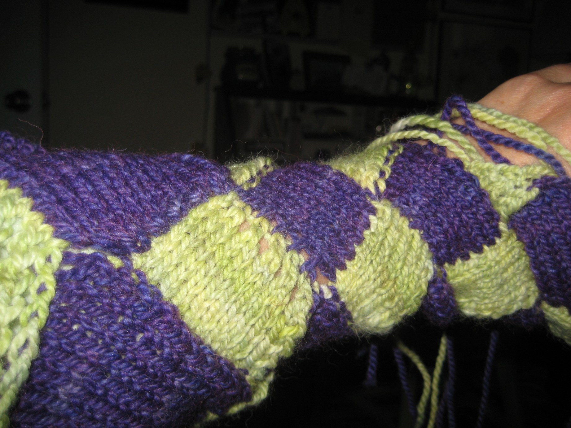 My other socks are on my Signature Needle Arts 6-inch US1 DPNs. (One of which I seem to have lost already. I am hoping that I left it at the office on Friday and that I will find it when I return tomorrow. You’ll understand why one would worry about the loss of one needle when you are told that I paid $48 for a set of four needles. Thus, one needle is valued at $12 which, by the way, is more than a set of 5 Dreamz needles.) The yarn that I am using is Gale’s Art Wonder Sock in the Graffiti colorway. I love this yarn’s color and it was one that I fell in love with and went to buy immediately after casting my eyes upon it. That doesn’t happen often. The Signature needles, while pricey, are worth every cent. I love the stiletto points and the yarn slips easily over them without slipping off them. I’d say that these are my favorites and I will collect more as my pocketbook allows.