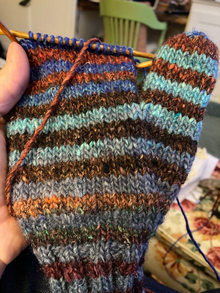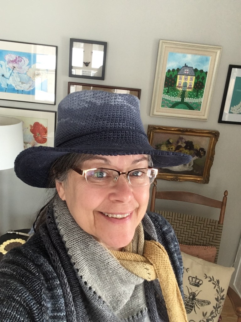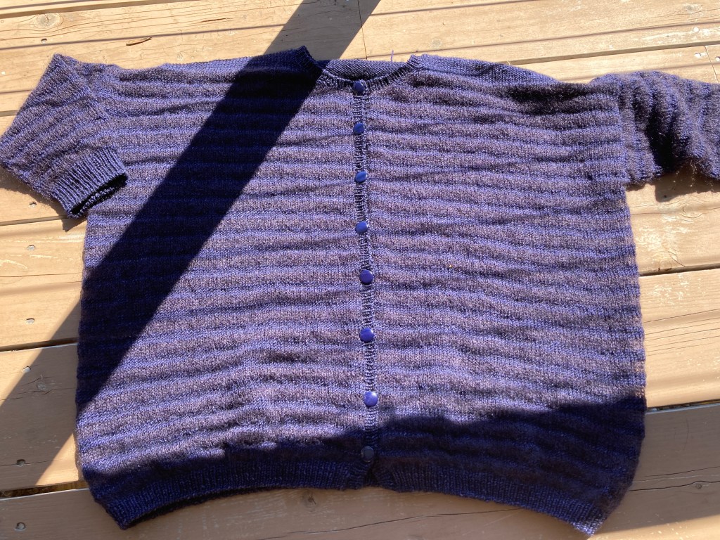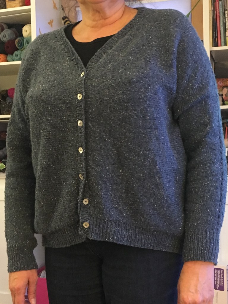 I’ll be excited to wear this by itself in the fall and with a tee or blouse in the winter. It will go with everything because it’s just a light neutral. Remix is a recycled yarn with nylon, cotton, acrylic, silk and linen in it so it’s quite soft and a little bit nubby. I like the texture, frankly. And I adore the pockets. I also love the fit – boxy and cropped a little but not too much. I didn’t even bother to block it, I just put it on. I’ll wash it after I wear it a couple of times. haha.