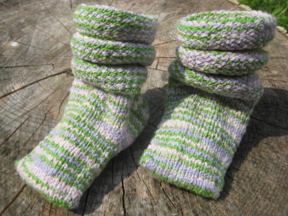 I bought a pattern earlier this summer to make a pair of slipper socks for a former student to whom I had become very attached. I knitted them up and sent them off to Florida. A few days later I got a picture on Facebook with her wearing them. Mom reports that she loves them. I’m so glad. Recently I made a pair of baby booties for my new niece Lilah Wise and I wanted to make something for my niece Faye Carleton, the big sister. When her mom told me that her feet were pretty big, I decided that these mukluks were a good idea. And I had the yarn in my stash in the cabin. (I totally miss my yarn stash that is in storage and I can’t wait to get it back and organized in my new studio in our new house. But I digress.)
