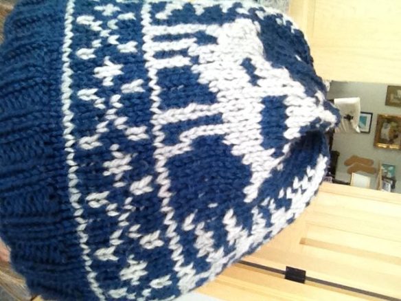 Speaking of Valentine’s Day, I made my handsome and bald hubby a hat for Valentine’s Day this year. I used a navy and a gray worsted wool by Lamb’s Pride. A long time ago, I saw a chart on Pinterest and I saved it. It made me laugh and it is totally my husband’s sense of humor. It’s called the Fornicating Deer chart by Ann Rutten. It’s on Ravelry. Needless to say, I didn’t have a pattern to go with the chart but I looked at my expected gauge and decided to knit three repeats of the chart. I also decided that once the deer were finished that I would do my decreases and not finish the entire chart. He likes caps that fit tightly but cover his ears. When he came home after work the first day he wore it, he said, “hey hon, now I really have sex on the brain!” Yup. I think he loves his hat.