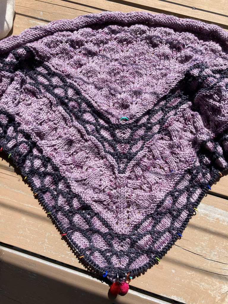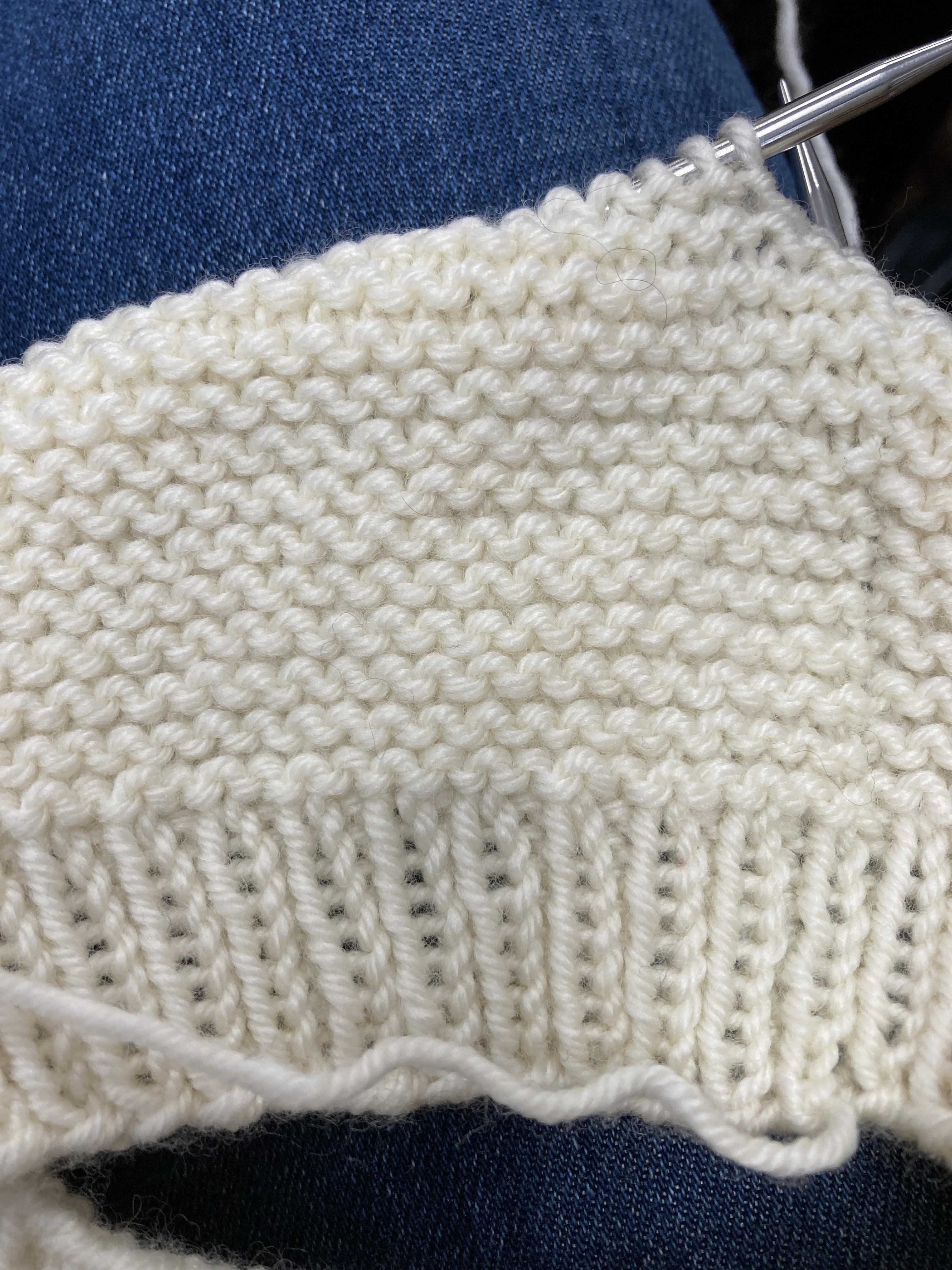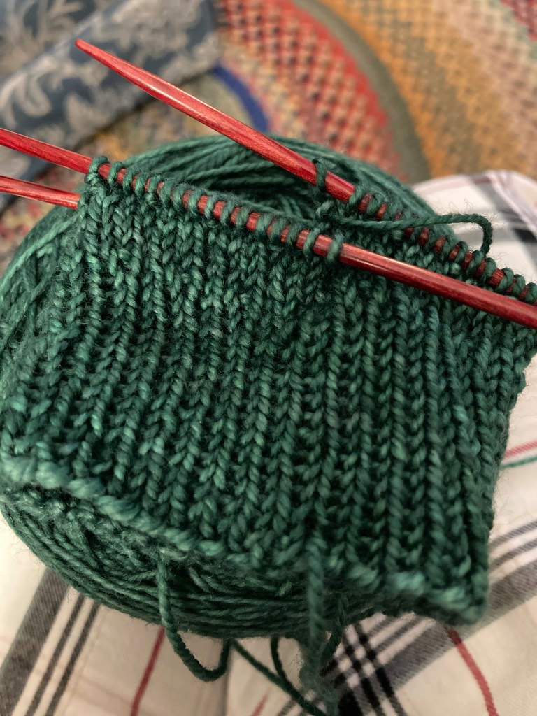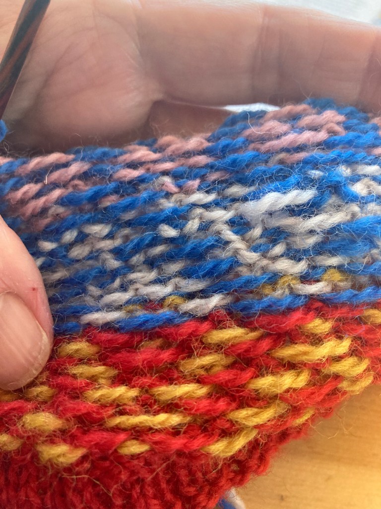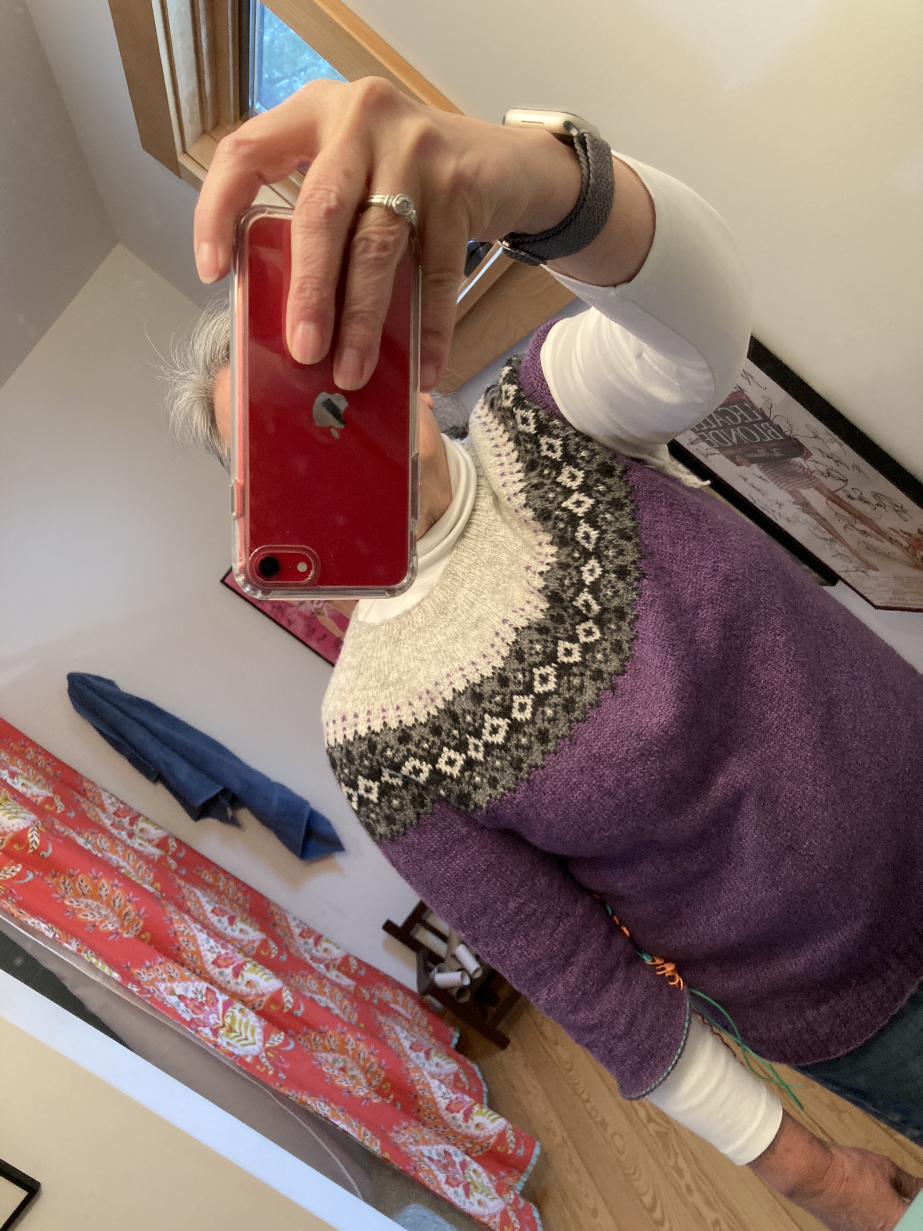I’m still working my way down the sleeve of my traditional Norwegian sweater. I’ve put the one sleeve on hold and am working down the second one. I hope that I can then do both sleeves’ colorwork and cuff. I’m not sure why this is such a challenge to knit but I am going to believe that the old pattern from another country where knitting is a part of the fabric of the culture assumes that the knitter knows certain traditional techniques. I will master this bit but it sure does intimidate me. I don’t want to get it wrong after all this knitting … and I sure hope I’m not allergic to this wool yarn! (I put on my “Patsy’s Traveling Sweater” the other day and had to take it off because it made me cough and my eyes were running. It’s made in Plymouth’s Gina, now discontinued. I’ll try to wear it once more and will give it away if I can’t wear it.)
