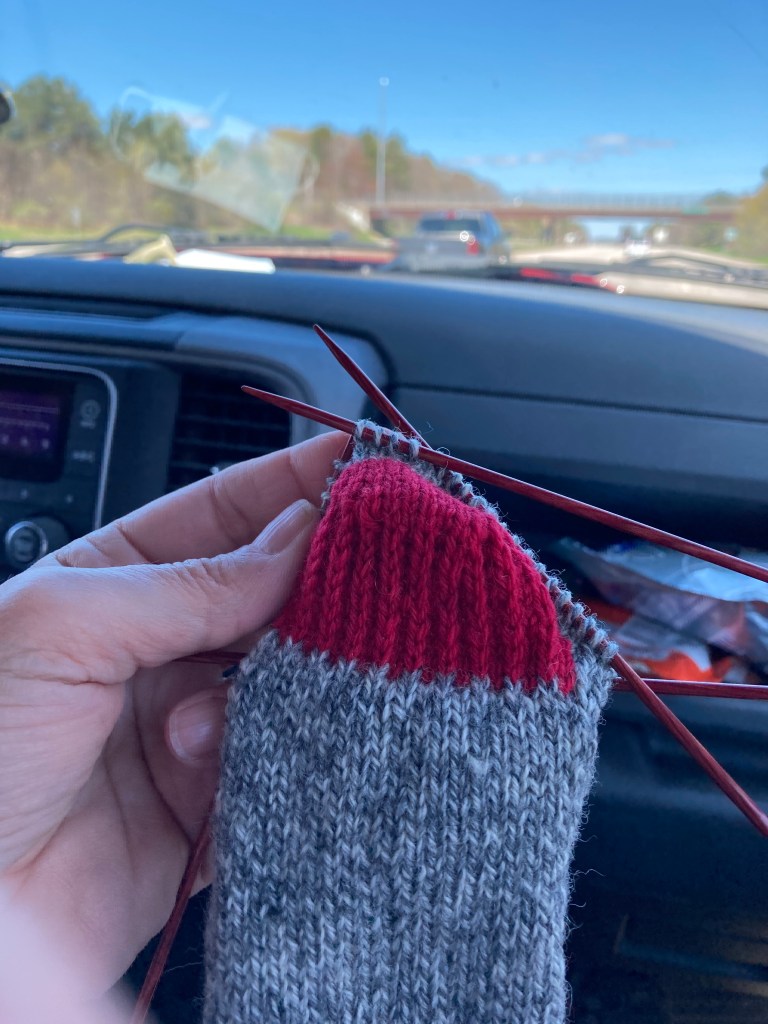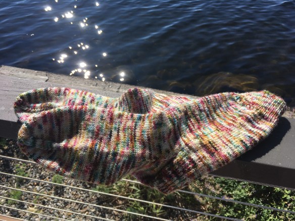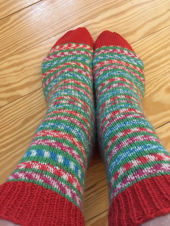 I’ve finished the socks for my daughter that I started on the way to Massachusetts for Thanksgiving. I love the yarn. They’re happy socks!