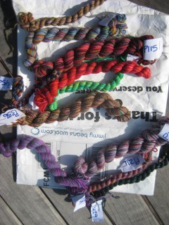 Three pairs of fingerless mittens that I’ve knit for my SIL, Annie, who will be gifting them to some lucky ladies! The grey pair on the left is knit with pure alpaca DK weight yarn from Maine. I bought it at an alpaca farm in Washington, Maine. It’s so soft and will be warm … but alpaca is well-known to also be very light weight. This one pair took approximately 8 hours to complete but I love the way they turned out. Needless to say, however, I had to find another pattern that didn’t take quite so long if I am going to get the rest of the 15 pairs finished and delivered before Christmas (or sometime next year!) The two pairs on the right are simpler construction and knitted in a DK weight wool from Maine, too. This is a hand-dyed wool from French Hill Farm in Solon, ME that I bought at a farmer’s market. I loved the rich ocean colors that go from purple to turquoise to limey green and then to yellow. I also love this pattern – it’s simple and lets the yarn be the focus.