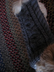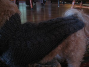 Lola was kind enough to model twice – she is not the dog who loves to wear clothing – and this is the “Boyfriend” sweater knit for Jan’s Japanese Chin. I love the colors of this sweater. I knit it with Cascade Yarns Baby Alpaca Chunky and it was a pleasure to knit. The yarn is so soft and will be so warm on those Northern California wintery days! This pattern is a seriously altered version of the sweater in “Dress Your Dog” by Sys Fredens. It’s designed to be bulky and loose like a boyfriend’s sweater would be. I think it looks adorable on Lola and can’t wait to see Jan’s photos.