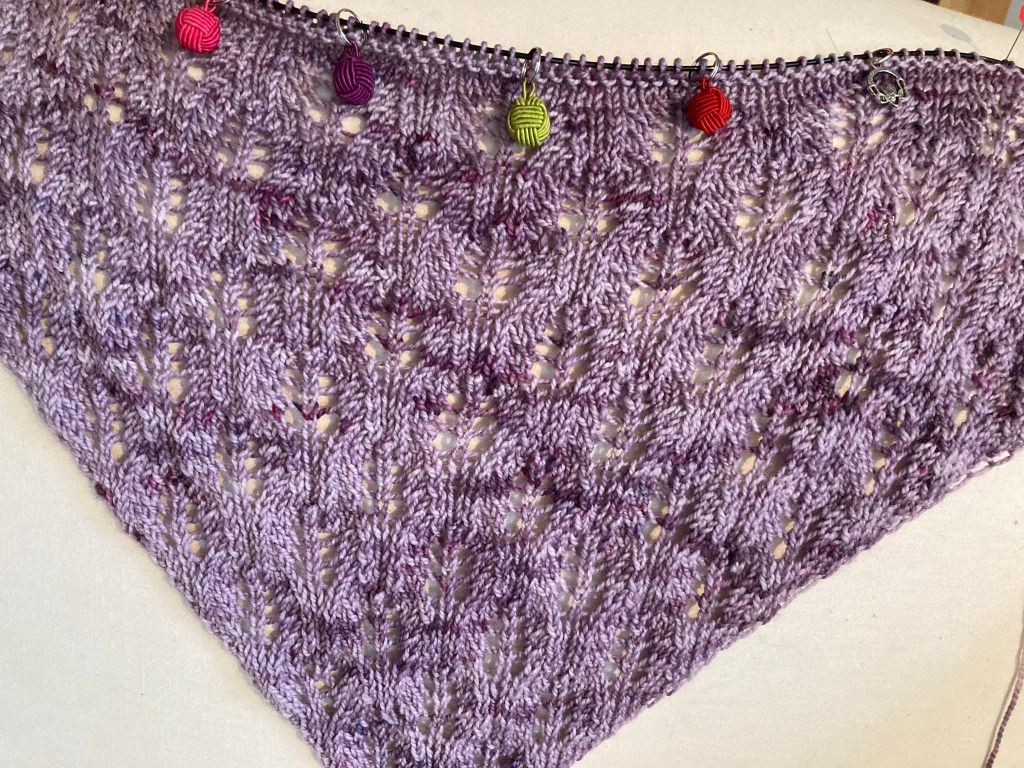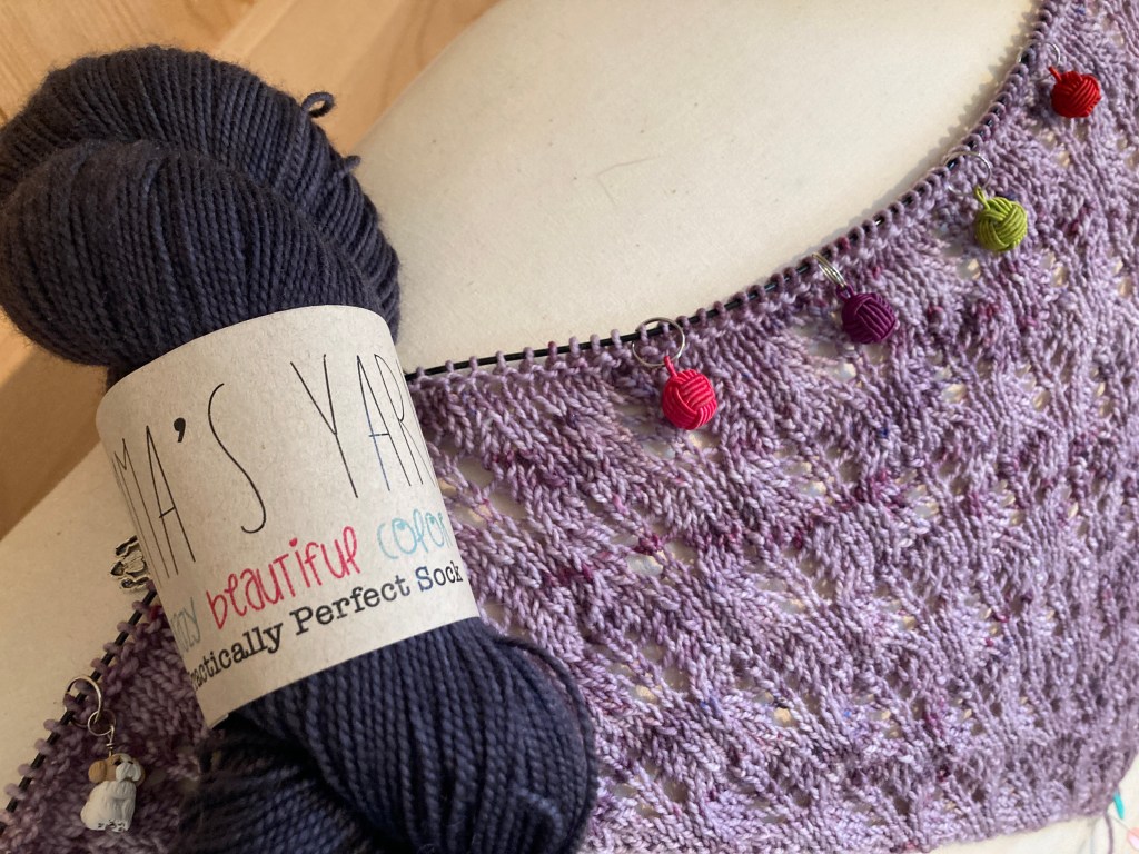 I chose two colors of Emma’s Yarn Practically Perfect sock yarn in a purple speckle and a deep purple-y gray. (Details are on my Ravelry project page.) Purple is not my “normal” color choice and I’m trying to live outside of my comfort zone a little bit. But I loved knitting this shawl, it was challenging but not too challenging and there were a few new techniques that I learned by watching the playback of the live sessions. It’s always fun to knit lace and then watch the magic happen when it’s blocked. I really didn’t know what it would look like until it was sopping wet and being stretched out on my guest room bed … and bonus, it dried yesterday when I was at work! It’s really dry here in Maine right now and that worked to my benefit!