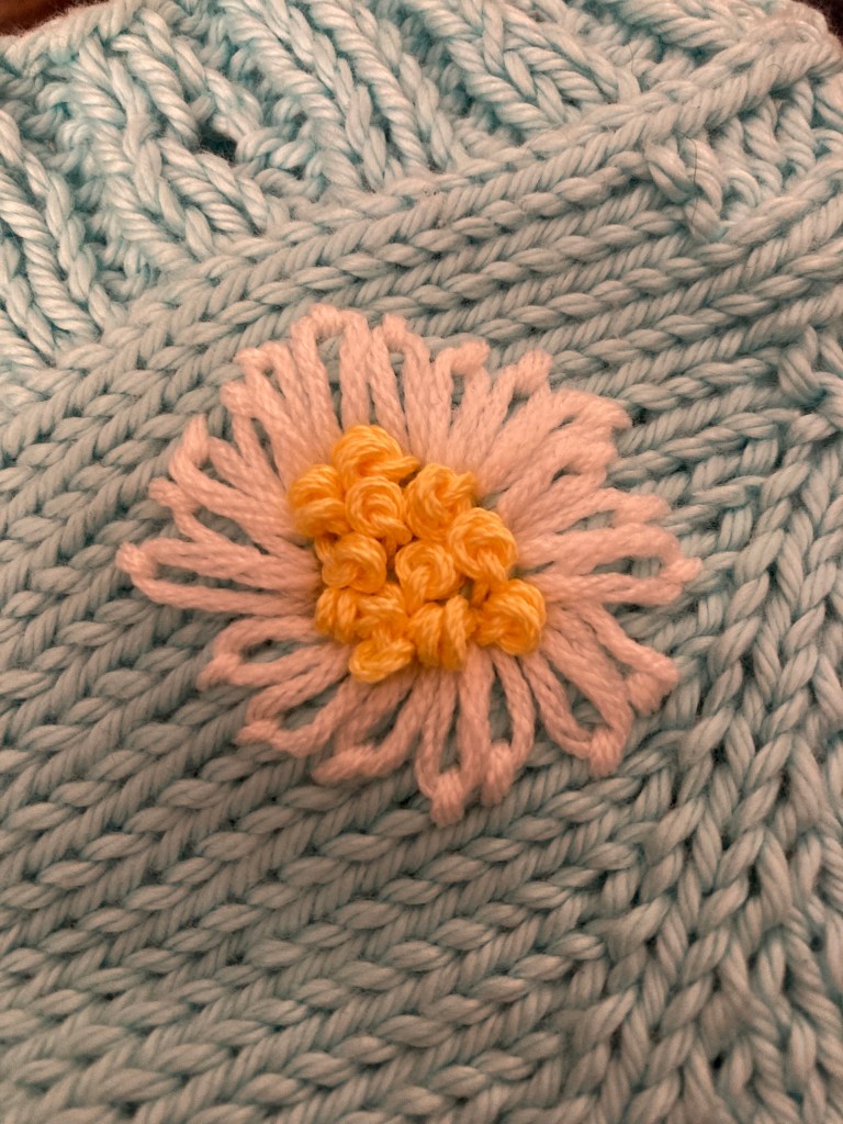 I have to say that knitting this shawl/scarf was fun enough. Not difficult for sure. But I didn’t love the way the colorway transitioned from the fall-like colors that it started with and then it transitioned into springy-y colors. I don’t love it but it’s ok. The most displeasing piece of this project was the knot in the yarn. It was early in the skein and it was a tiny knot. I am so glad that I found it and that I pulled on it (and it came apart). In my humble opinion there should not be knots in premium yarns. Yarn companies should do better. This knot had to have been tied by a human being and it should have been pulled and discounted immediately.