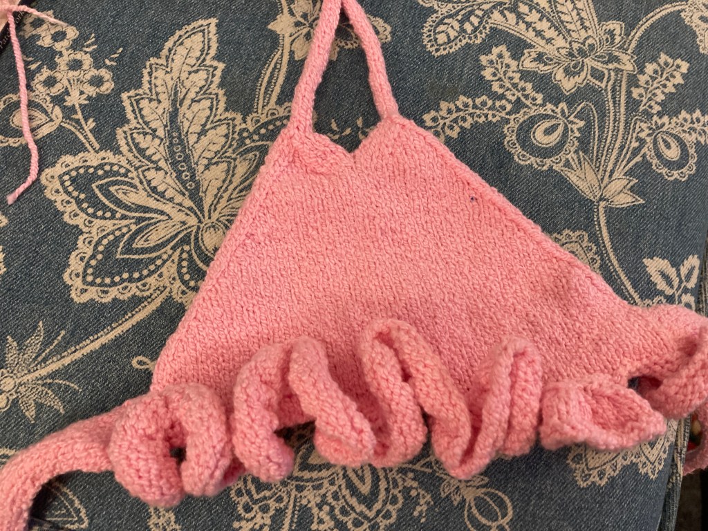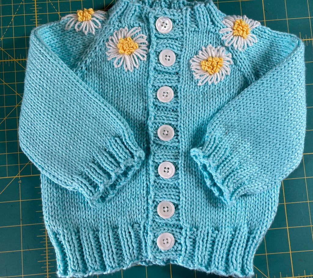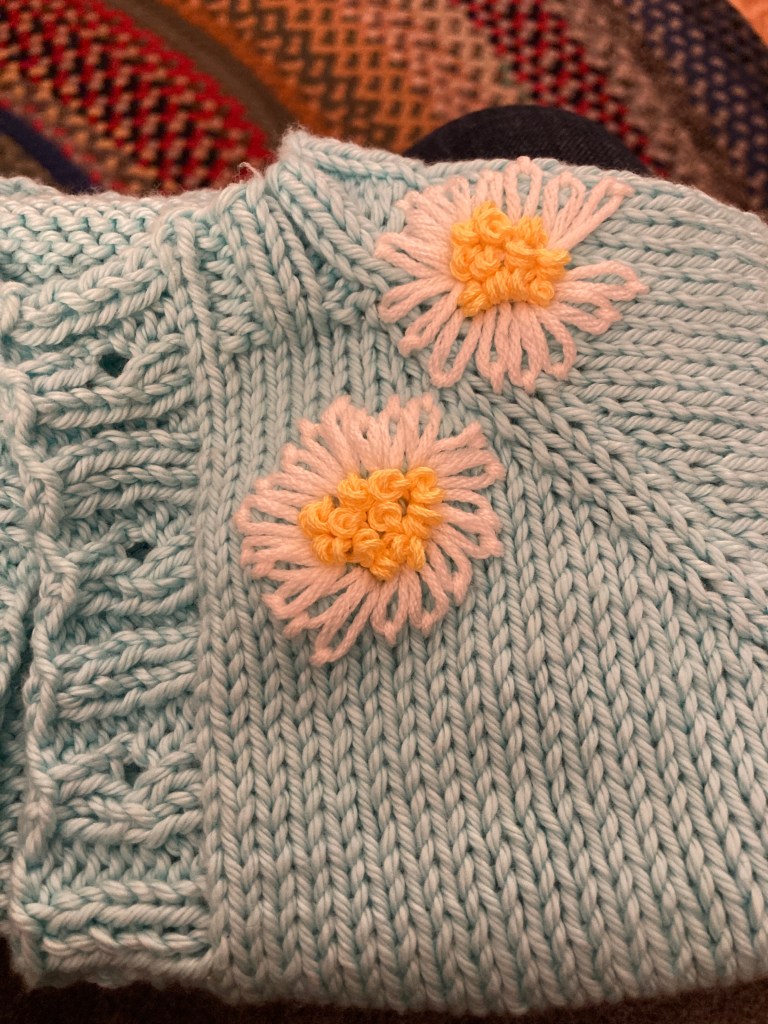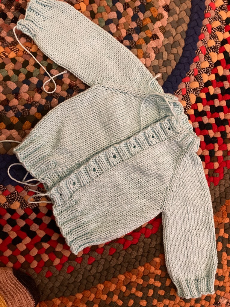 On the needles and hoping to be a FO soon (very soon!) is my Tybee cardigan for Sylvie. This is a free pattern from Berroco for a little cotton cardigan with a shawl collar. Raglan sleeves make it easy to finish up at the end. Bottom up construction with only a couple of short seams. I love the feel of the Vivo cotton yarn. It’s a thick and thin yarn so the sweater will be easy to care for (machine wash, dry flat). I love the colorful yarn that stripes randomly. It’ll be a cute sweater for cooler late summer days or evenings.