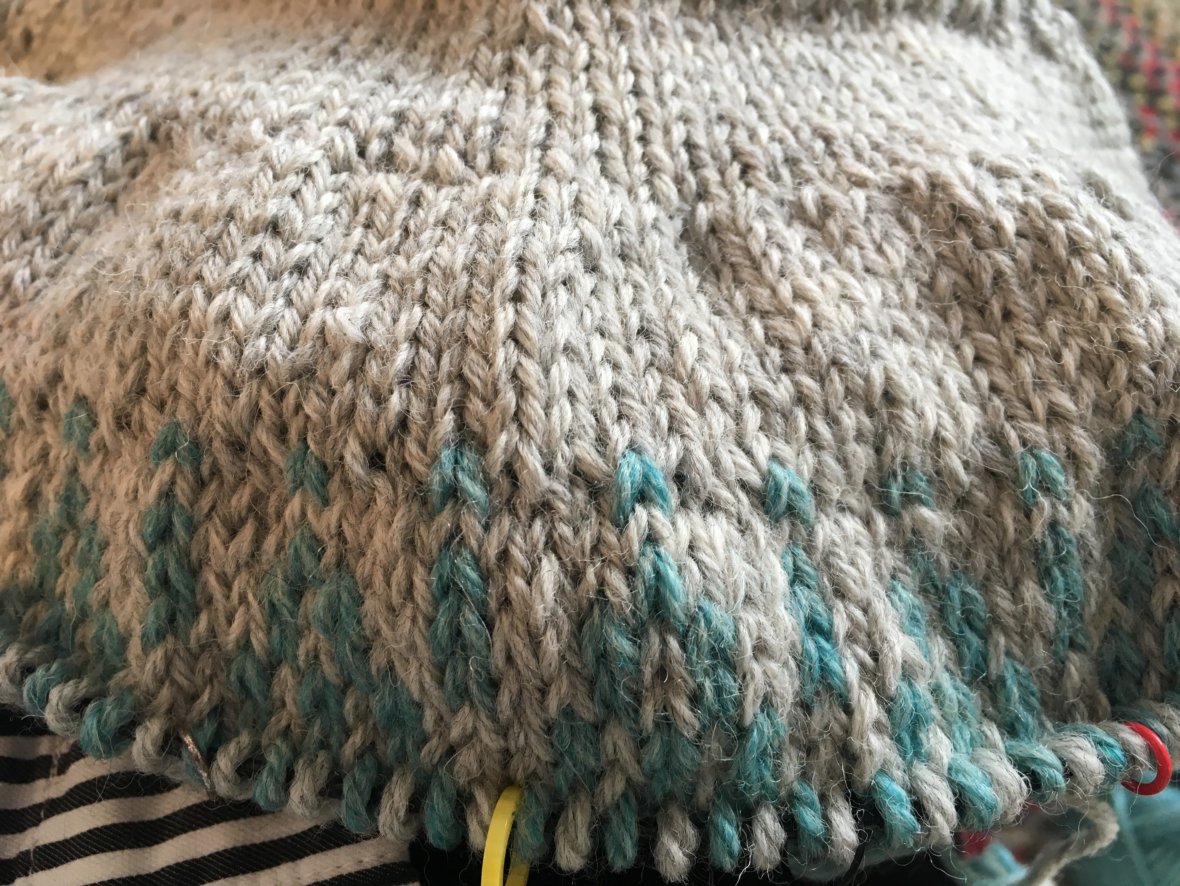 I”m to the bottom colorwork band on my Daytripper cardigan so the mindless rounds of stockinette stitch are done and I’ll have to concentrate again (and count). I love the colors that I chose and this will be a great addition to my sweater collection.