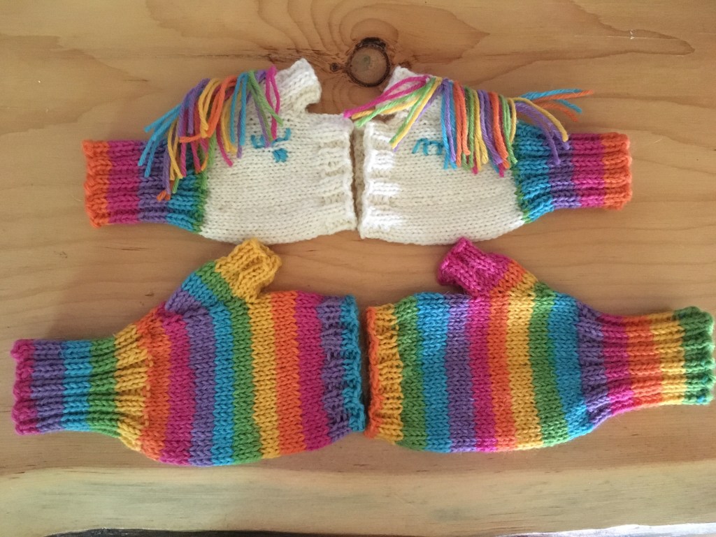 I fixed the neck of an anchor sweater that I made as a sample for a workshop that I taught that just happens to be the right size for Sylvie right now. It didn’t go over her head the way I’d made it so I pulled the neck ribbing out and re-knit it and used a stretchy bind off and now she can wear it.