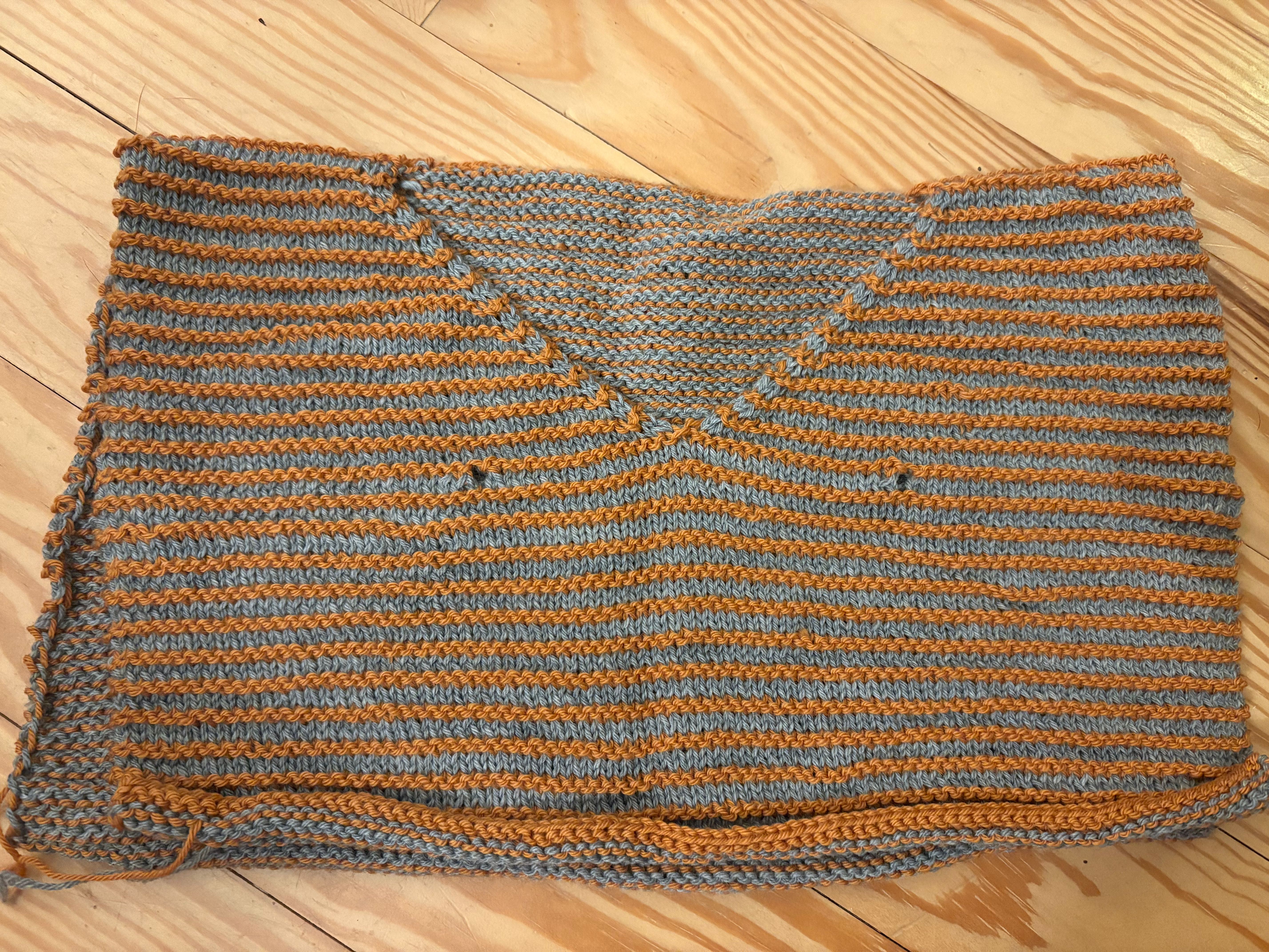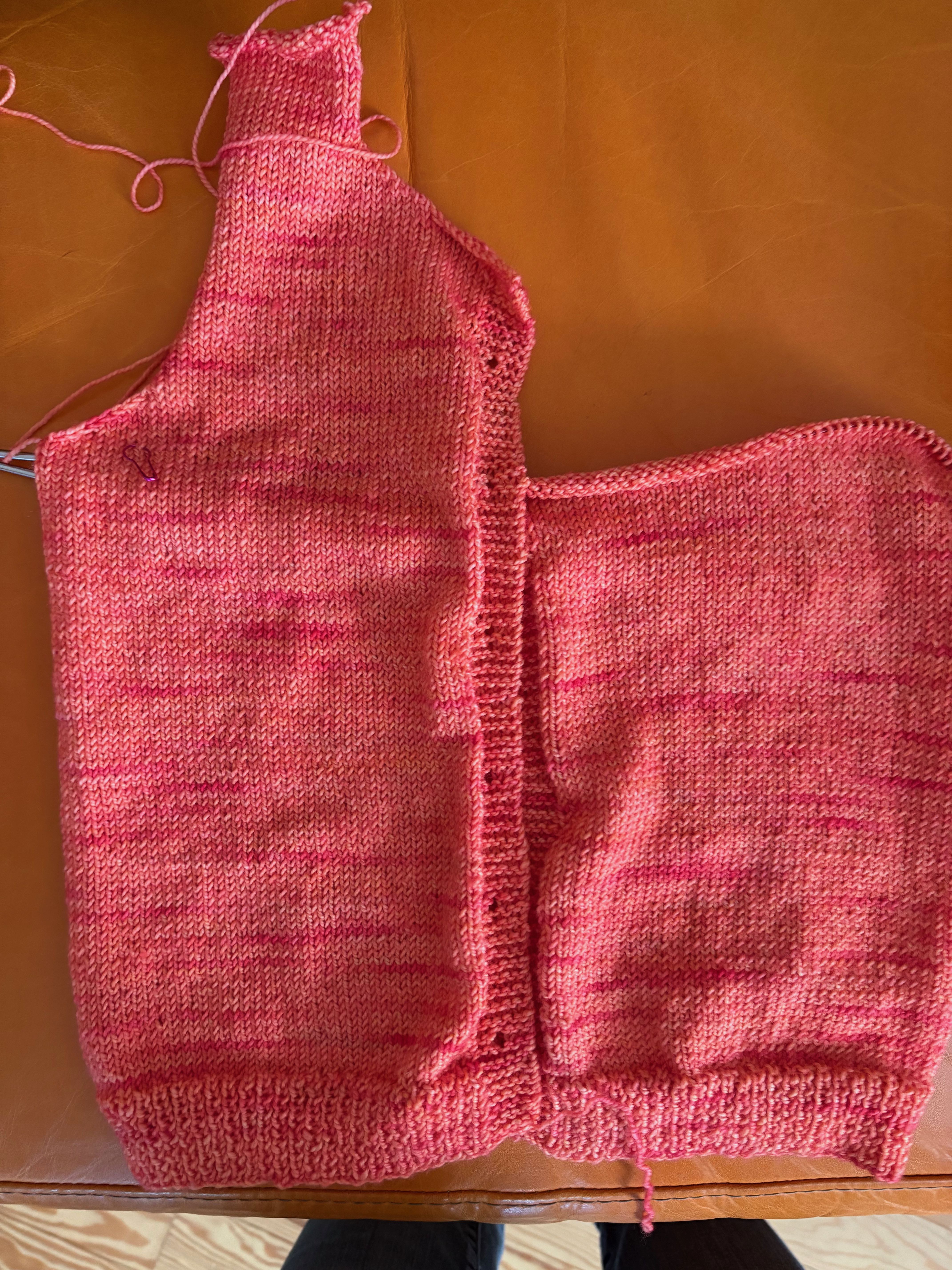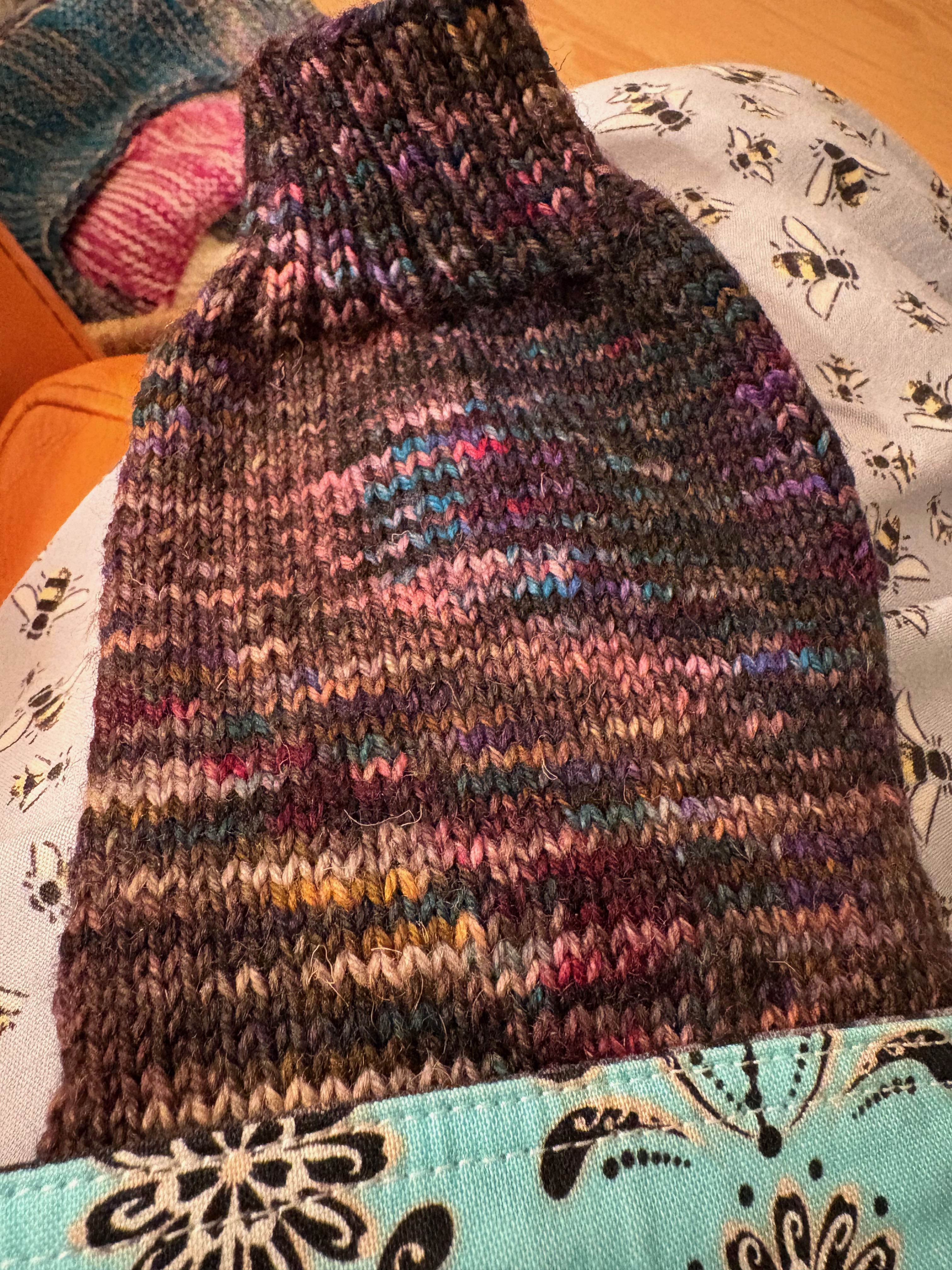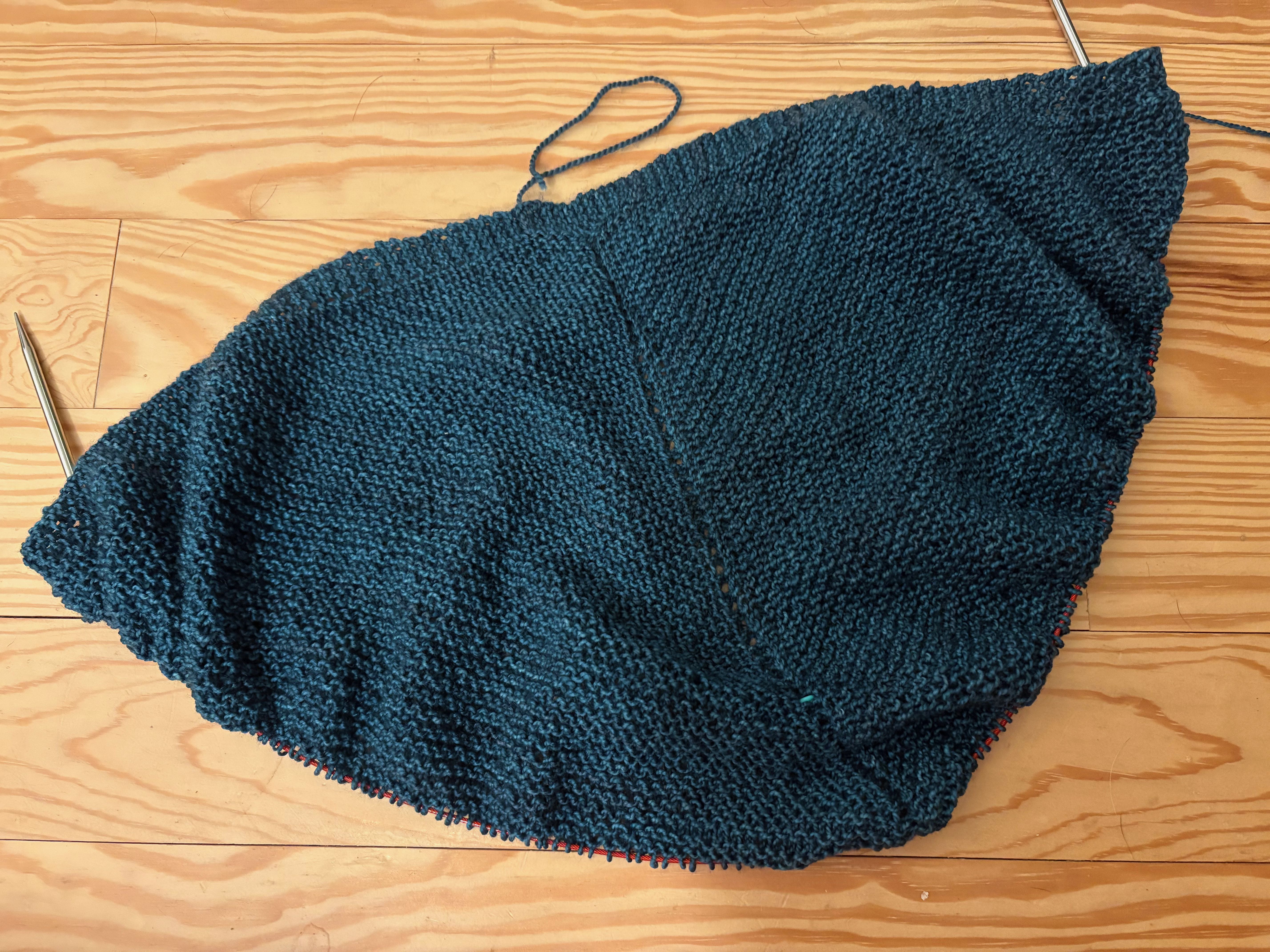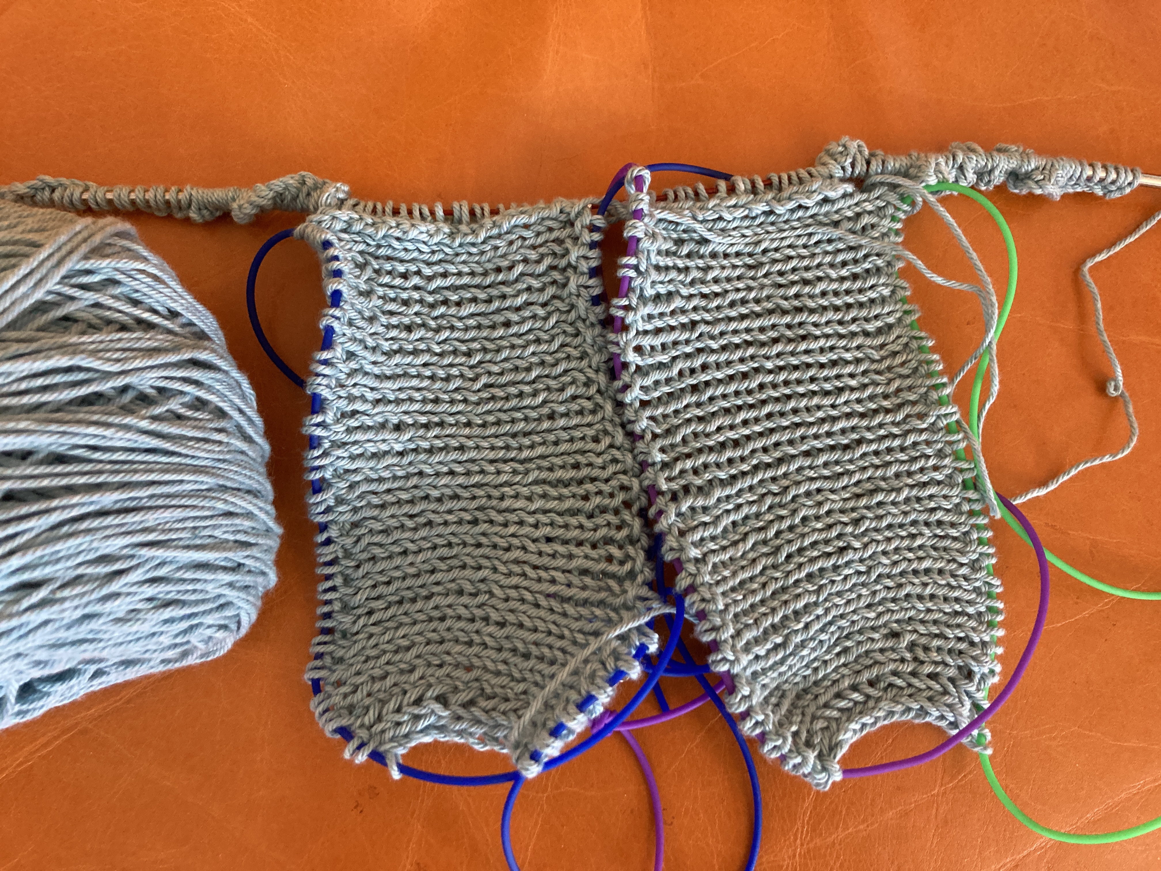 I cast on a Stockholm Slipover by Petite Knits since I have finished so many little projects. It seemed fitting. Her sizing is a bit difficult for my body. One size is just about an inch of positive ease and the next size is almost six inches of positive east. One too little and the other too much. I basically threw a dart at the sizes and cast on. My gauge is good and pretty soon I can try it on. Maybe even tomorrow. I am knitting it with deeply stashed yarn. Three hanks of a clearance yarn from the store held with an alpaca/silk lace. I really like the way it’s coming out and I like the color but I fear that I have all blue, purple and gray knits. SO … in the future I need to change it up more. This pattern is really fun – it starts with the back and one shoulder and goes on from there. I’ve gotten to the point where the body is connected and I’m working my way down the body. I love knitting a vest – no sleeves!