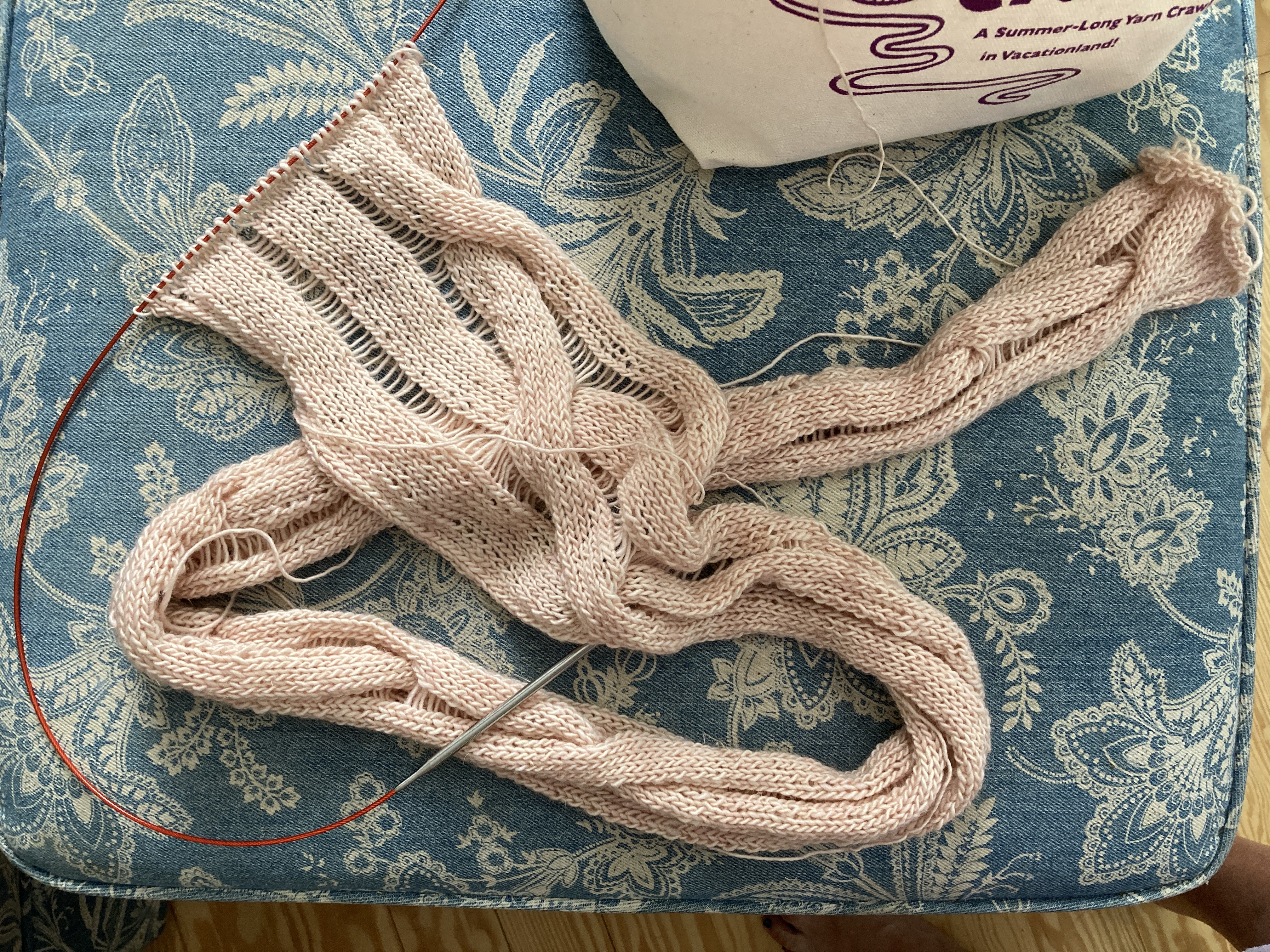 I’ve also be working on my River cowl by Yumiko Alexander. I am really loving working with the Sonder Yarn Company Muse yarn. It feels great in my hands and it’s a tiny bit thick and thin at times which makes it interesting. I think the drape, once blocked, will be gorgeous. I also love the color! The pattern is fun and easy enough to not take up too much of my brain’s band width (which hasn’t been great with my covid brain!) I’ve completed the five repeats of 66 rows of the “hard” work of cables and dropped stitches. There were a couple of places where I forgot to twist edge stitches so that when I dropped the purl stitches and unravelled, it wanted to go too far. Thankfully, I knew this was a problem and stopped the process. Grabbed the stitch and wove it in with a new piece of yarn so it will stay put. And it barely shows. Since this is for me, I’m good with that fix.