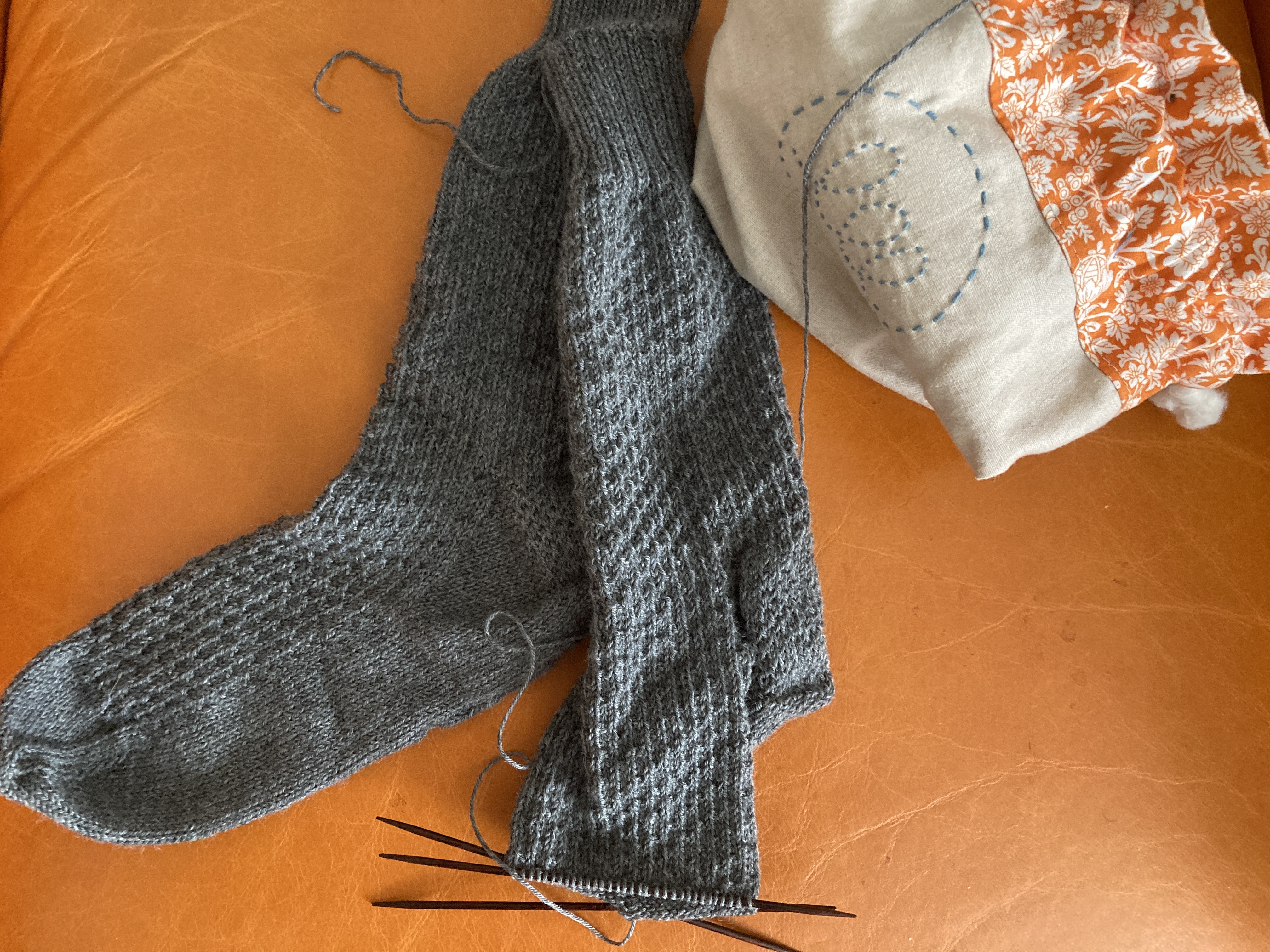 My second gray Hermione’s sock has turned the heel is well on its way out to the toe. I have to re-check my notes to see how long I knitted it before I started the toe because I’m that close. I do love the texture in this pattern and I love the Coop Knits SocksYeah! yarn. It’s soft and not at all splitty. It makes knitting socks a cinch. I hope my sister will like them. The next pair of socks will be for my brother-in-law. Two great couples will be gifted custom knit socks this fall/winter.