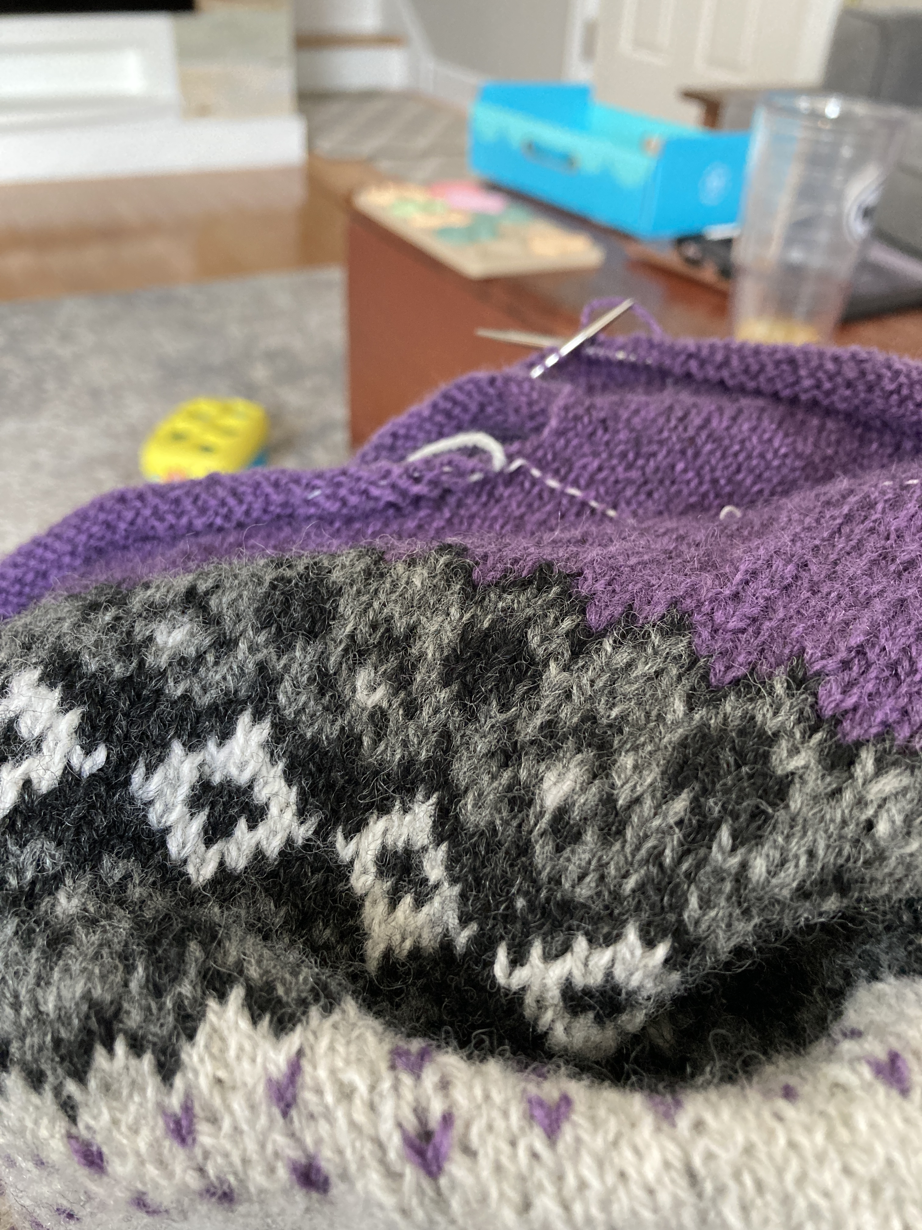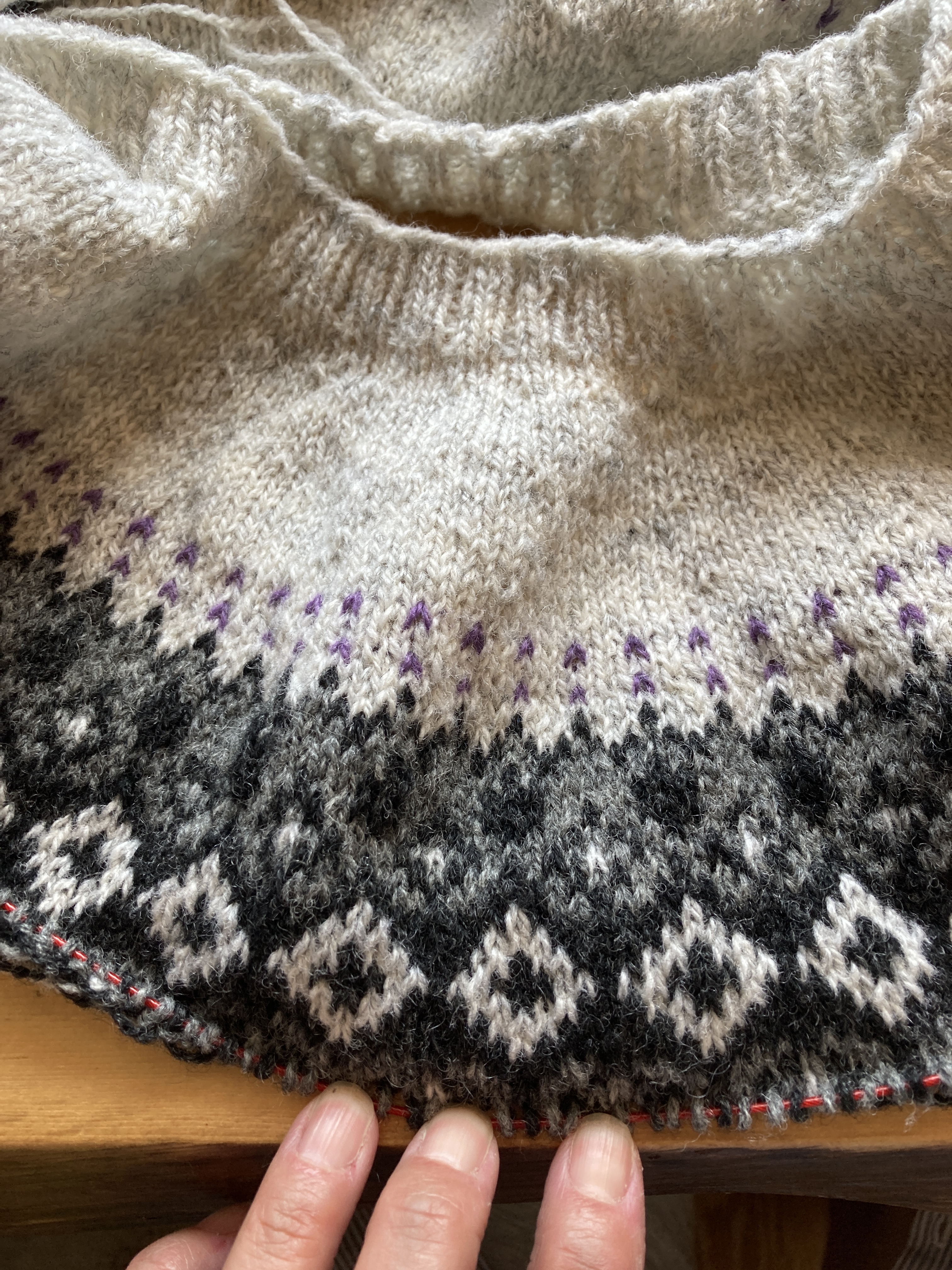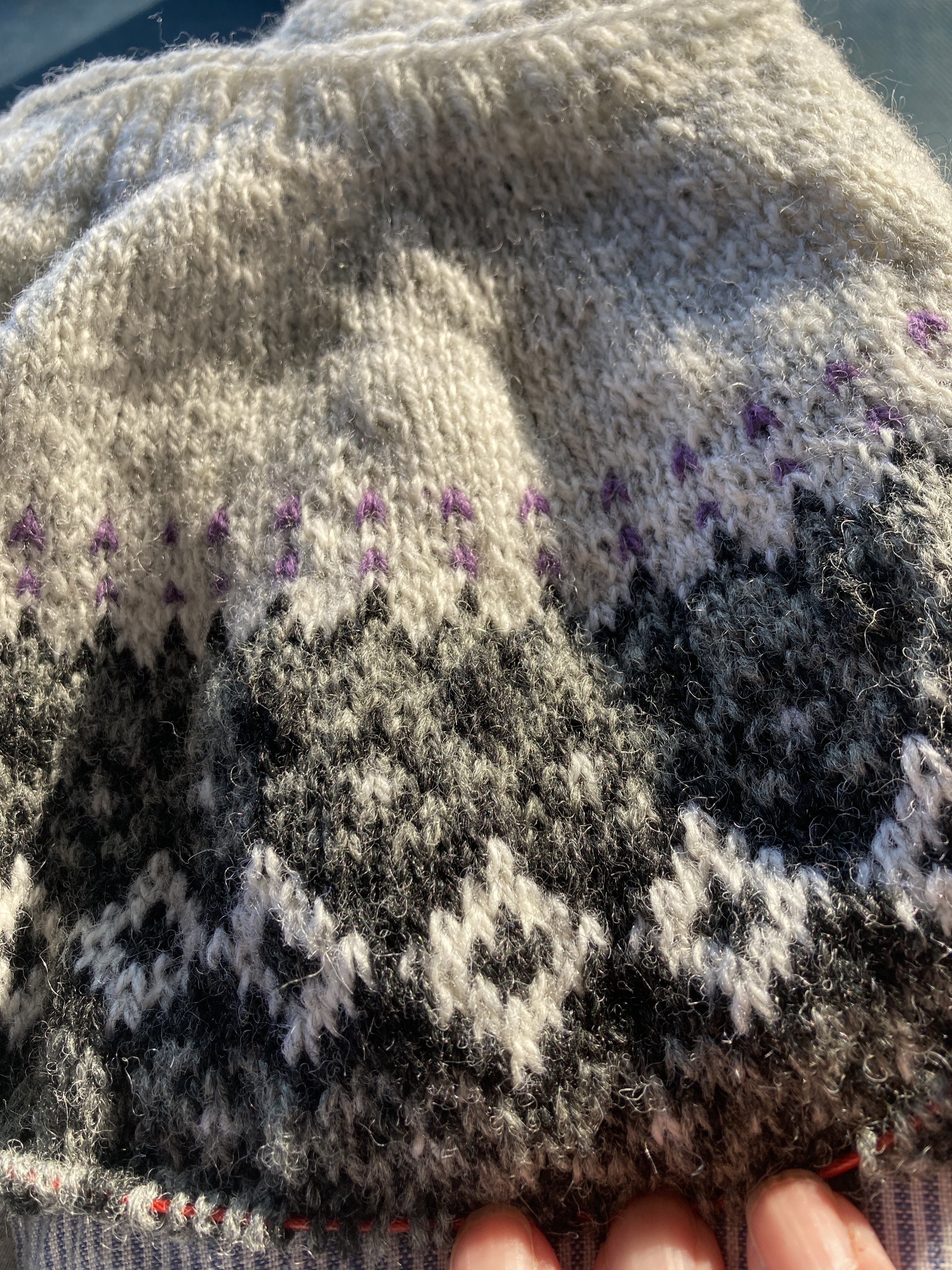 I ordered the yarn from Patricia at the farm. It is a Norwegian wool, Ask Norsk ullgarn, and it’s a bit sticky but squishy, too. Perfect for colorwork. The yarn is a sport weight that looks like fingering, frankly. I purchased 5 hanks of the main colorway and one each of the remaining colors. I chose to make it in the traditional colors as shown in the purple colorway in the middle of the photo above. I didn’t love the yellow color and have a sweater’s worth of a brick red-ish color but had nothing in purple which helped me make the choice. (I have one hank of the main color leftover and quite a bit of the darker grays, just a little of the light gray.)