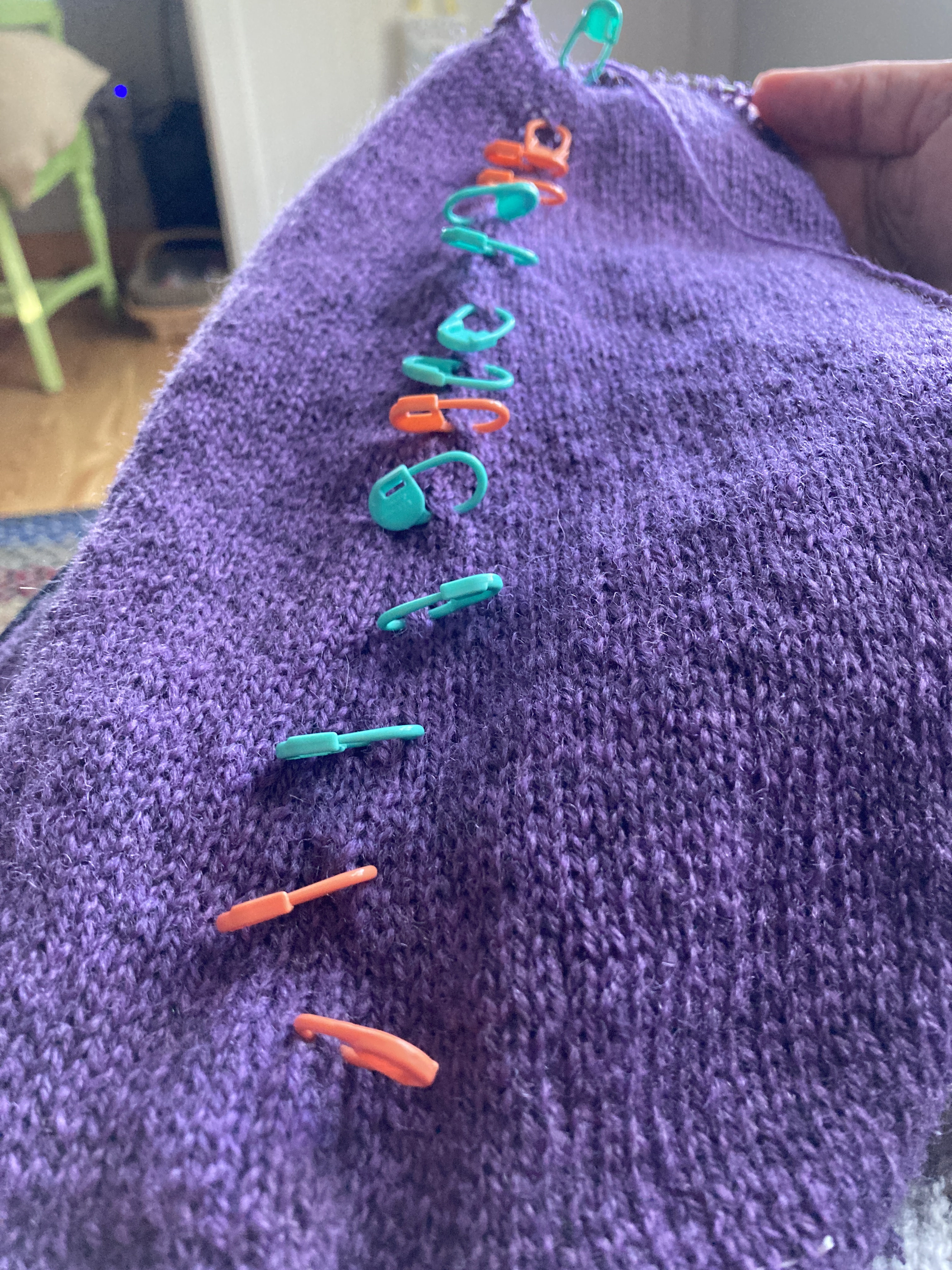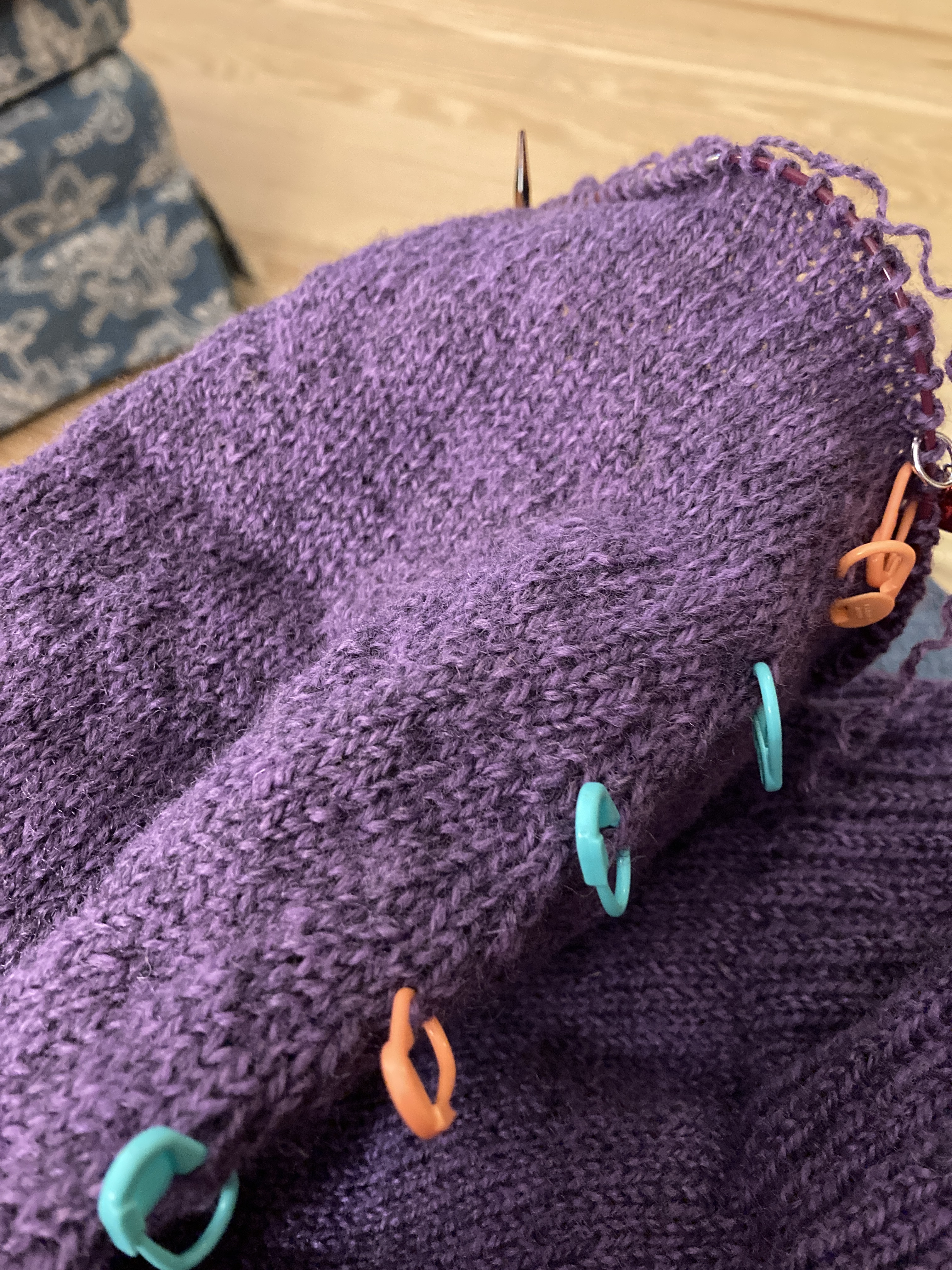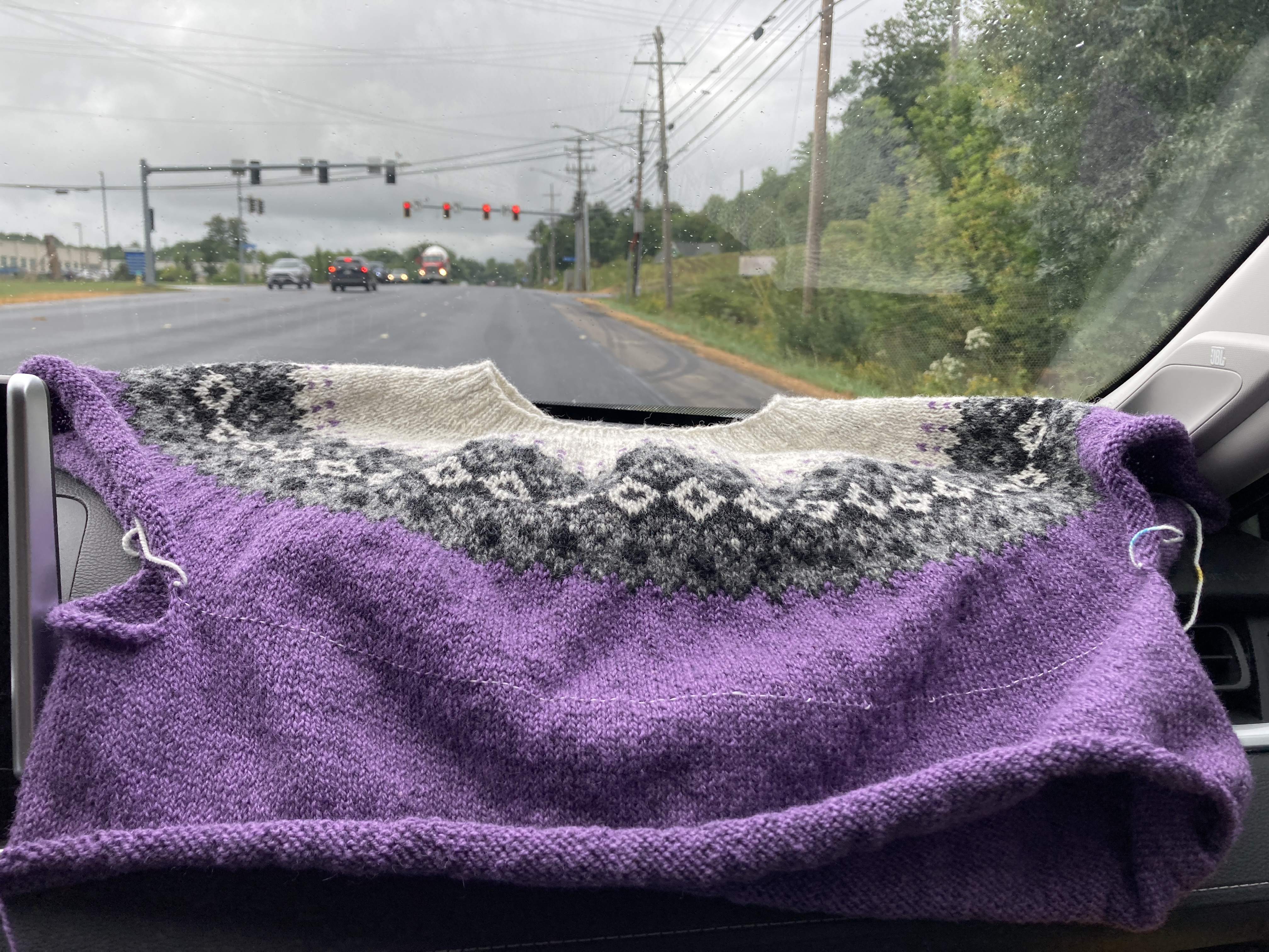 I ordered the yarn from Patricia at the farm. It is a Norwegian wool, Ask Norsk ullgarn, and it’s a bit sticky but squishy, too. Perfect for colorwork. The yarn is a sport weight that looks like fingering, frankly. I purchased 5 hanks of the main colorway and one each of the remaining colors. I chose to make it in the traditional colors as shown in the purple colorway in the middle of the photo above. I didn’t love the yellow color and have a sweater’s worth of a brick red-ish color but had nothing in purple which helped me make the choice. (I have one hank of the main color leftover and quite a bit of the darker grays, just a little of the light gray.)