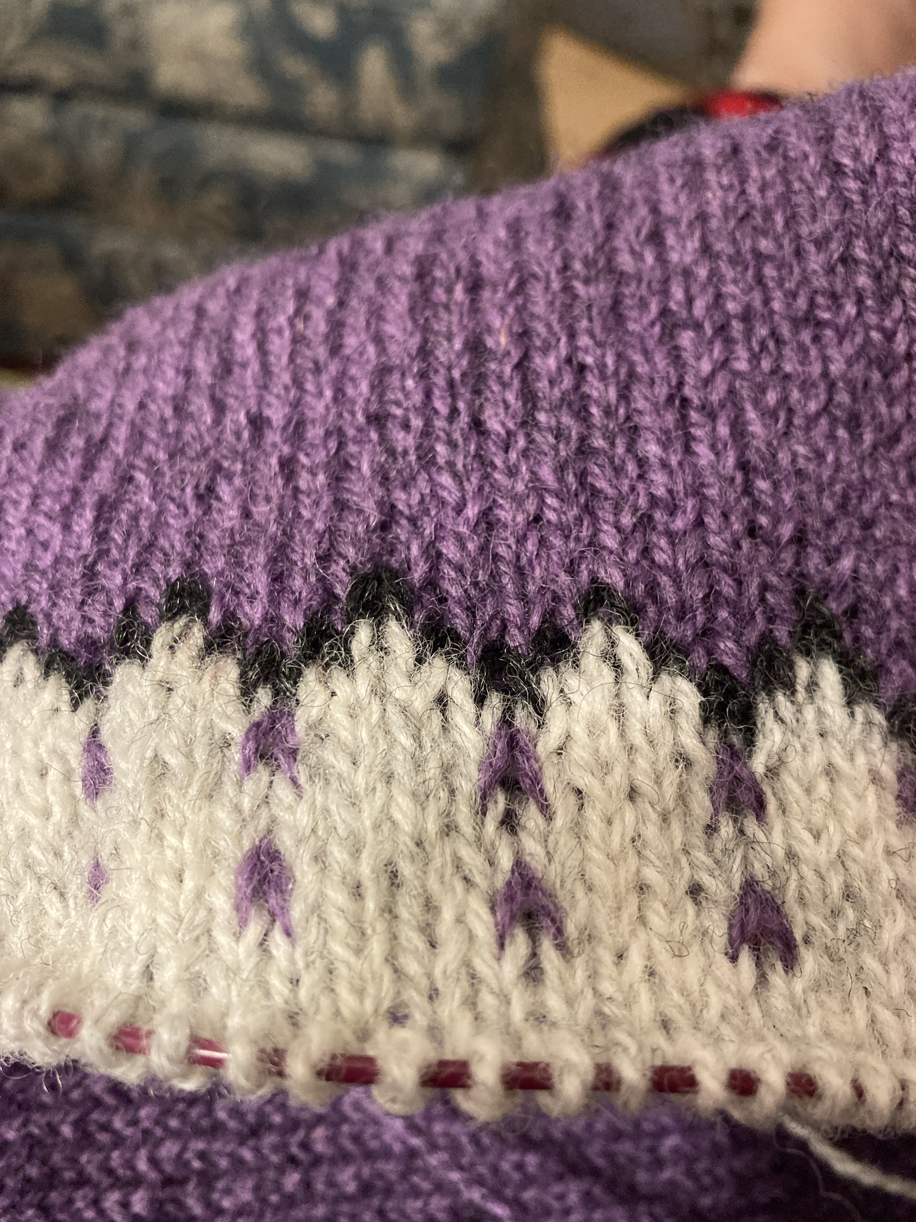 Knitting the yoke was the most fun, of course! Once the sleeves were divided, the stockinette stitch down the body and sleeves was tedious at best. It had been set aside for my Arne & Carlos Advent Mini Jumpers, and a 1-year-old’s bikini and a mermaid tail and sea shell top, among others but I brought it with us when we went to the beach in September and worked away in bits and pieces when I found a few minutes. I got most of the first sleeve finished in early October and then hit a “snag” because I had a wrong number of stitches for a colorwork pattern with an 8-stitch repeat. While I pondered the predicament, I knit a couple of pairs of Christmas socks, designed and knit a 1-year-old’s Christmas sweater and hat, and I may have started knitting a pair of pink mittens among others (again! See the theme developing here? Hit a snag, cast on another new project.)