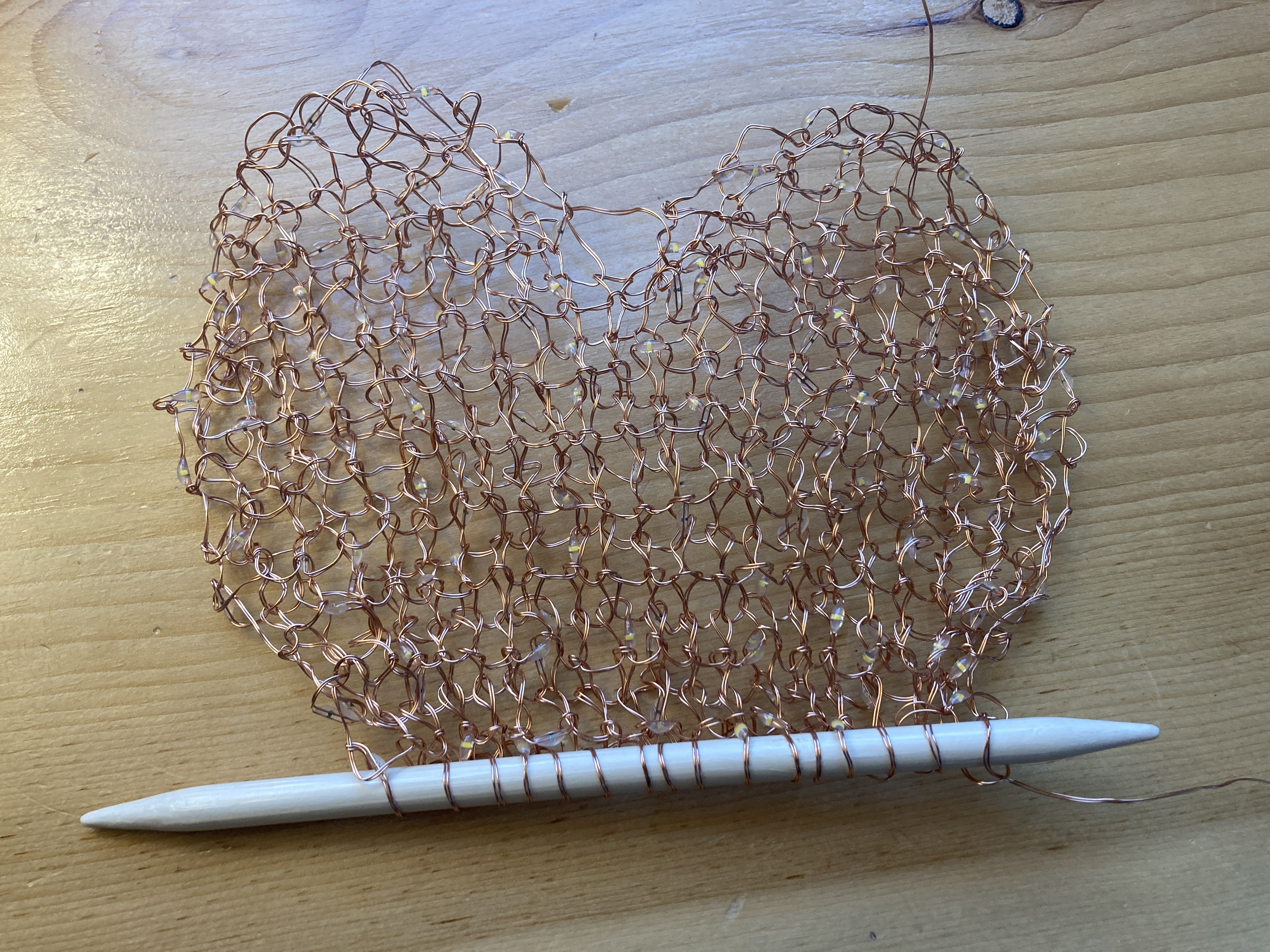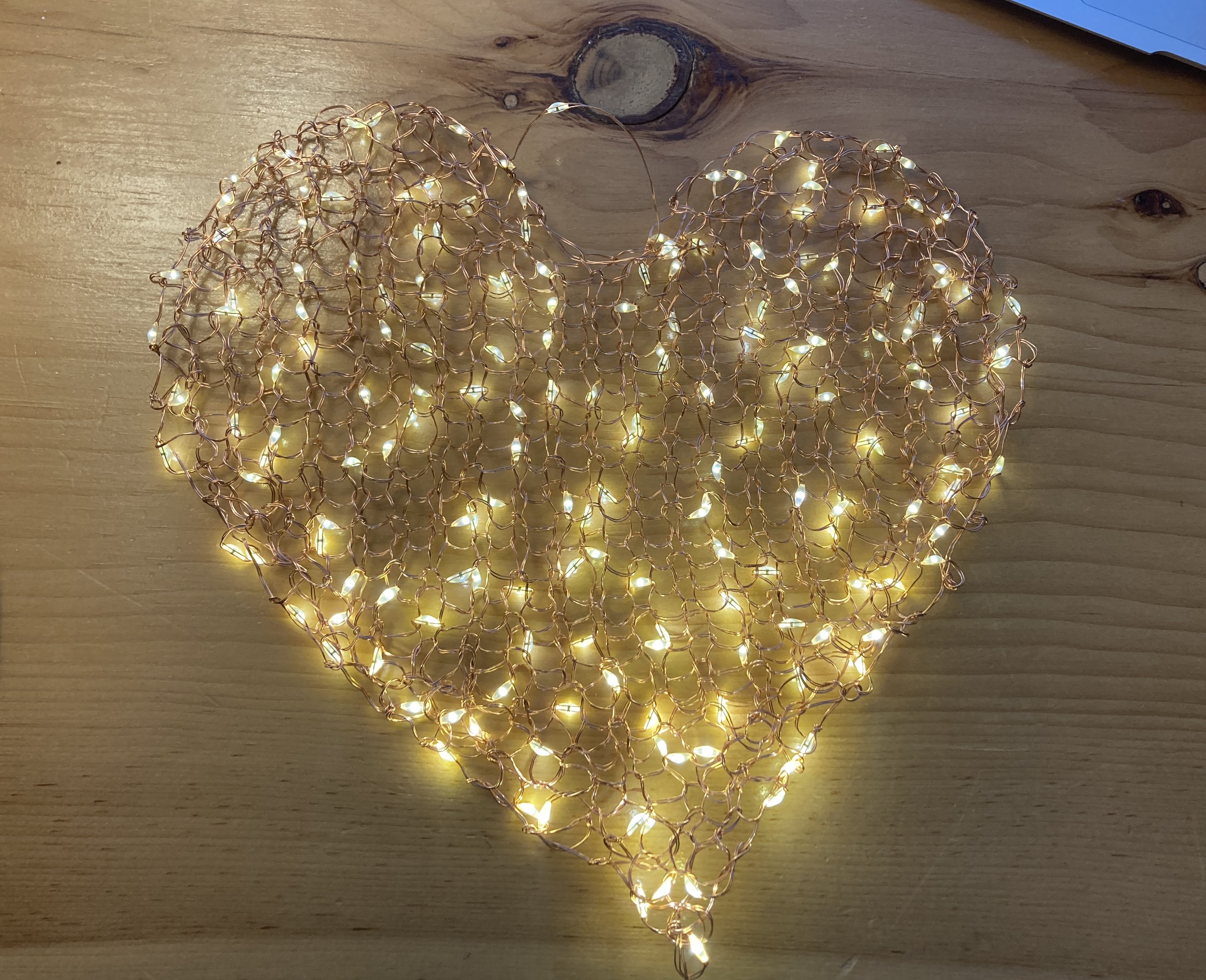 I have been pondering a little gift that I can make to give away to one of my Longest Day donors, sort of like a raffle, and I settled on a Love and Light (light up knitted fairy lights) and bought purple lights. On Friday while I was knitting for the Longest Day, I knitted up a heart in the purple lights but I had way too much left over. I brought it home and since it’s a gift, I want it to be special … and right! So I decided to knit another smaller heart below the first one and it worked! I knitted with fewer stitches and rows and have a double heart light up wall hanging to give away to one of my donors. I’ll do the drawing tomorrow. Everyone’s names have gone into a box on slips of paper and my hubby can draw for me … stay tuned.