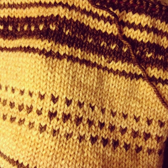 Initially, I thought I wanted to add an additional colorway to the mix but after knitting a little bit of the way, I decided that there was a reason the original design had only two colors. The addition of a third would have messed up the contrast. So, I frogged the first attempt and proceeded with the gray/yellow color palette.