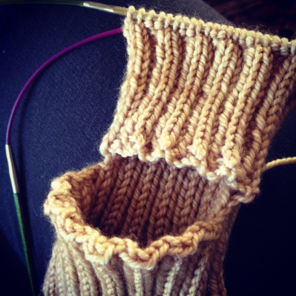 I bought the kit from Kitterly. Yellow … NEON yellow and charcoal gray. What’s not to love? They’re bee colors! Madeline Tosh (Merino Light) yarn is very soft and not plied. Sometimes it gets a little fluffy which is not always what you want. Regardless, it’s a delight to knit with and will be a delight to wear. The pattern is fun to knit. A bias-knit garter to begin and then two bands of contrasting two-color Brioche. I needed to pay a little bit of attention to the increases and decreases but it’s a relatively simple six row repeat.
