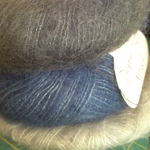My new project is another mohair cowl. It’s knitted a bit on the bias which makes it a little bit more interesting. This one is a custom order from a client in New York. After I made the first one, I thought about making one in three shades and she liked the idea, too. So we’re using a silver, a charcoal and a denim color – I think it’s going to be lovely! Kind of like the ombre garments and home furnishings that you’re seeing everywhere! The yarn that I’m using is called DK weight (but I’d say it’s more a fingering weight) and it’s Rowan’s kidsilk haze in charcoal #639, Debbie Bliss Angel in denim #15008 and kid seta Madil in a silver (#408) colorway. I will start with the charcoal, then head into denim and last, add the silver. I’m pretty excited to see what it looks like – I’m sure we’ll all be delighted at the results!