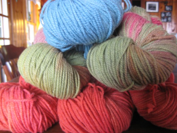 My yarn is String Theory’s 100% domestic super wash Merino. Each of the three skeins has a generous 425 yards of squishy yumminess. Which should be more than enough – the pattern calls for 333 (of two colors) and 301 yards respectively. I bought three colors: charcoal gray, blue and green. I chose these three because they were exactly the colors of the sample that I saw. Little did I know that two of my students in my Friday knitting class are also working on this shawl. They’re all lovely. (I’ll try to remember to take pictures!)