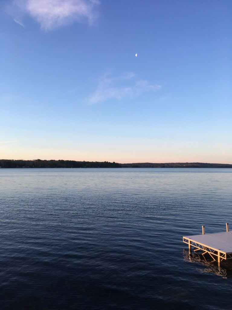 5/13/2020 Messalonskee Morning with Moon and Merganser