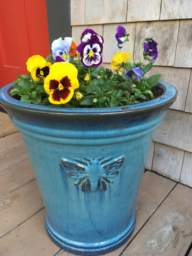 Yesterday was a beautiful, albeit windy and chilly, day and we went to the nearest garden center, a small family business in the next town to get some vegetable plants to put into our garden. I wanted to start some greens (they’re supposed to be hardy enough for this time of year) and get a leg up on growing our own food this spring/summer and into the fall. We have a very short growing season and last year we had a garden fail. I hope we are more successful this year. We bought a few pansies to decorate our front dooryard, too. Pansies are such bright and happy plants and we will enjoy these well into the summer!
