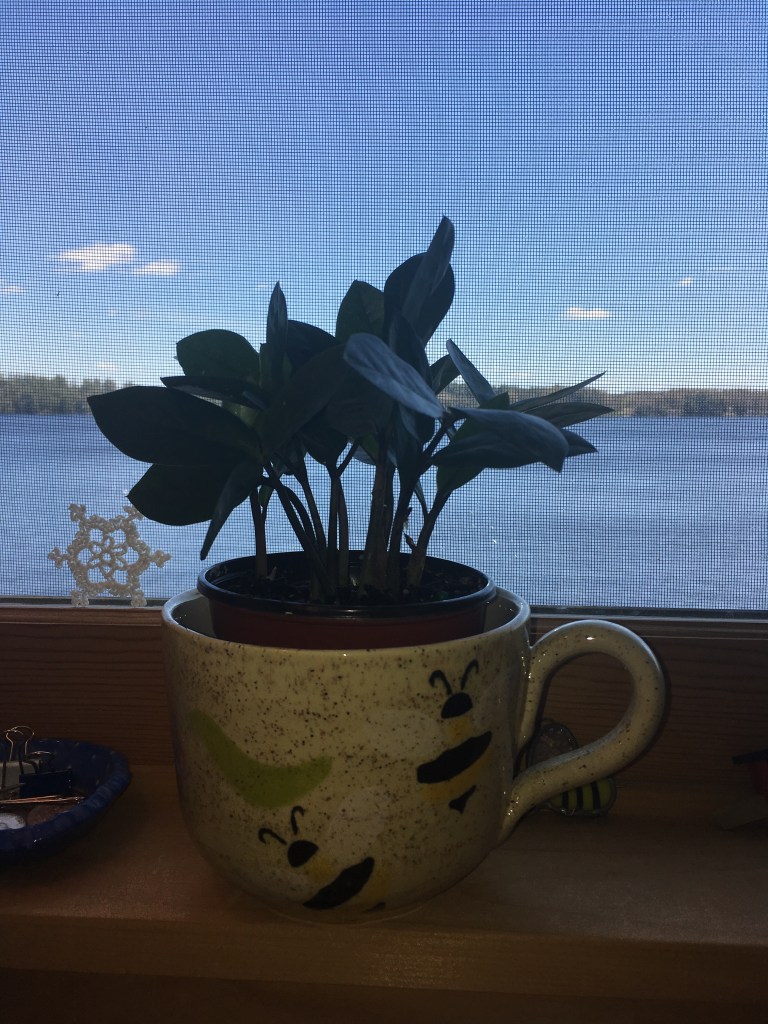 I have a new plant baby, a ZZ plant, in my atelier! I bought this for my hubby back in the wintertime thinking he’d like a plant in his studio space which is on our third floor. He was concerned that it would die up there because he’d forget to water it. So, since then, it’s been living in our living room with all the other plants and I’ve been taking care of it. This morning, I decided to take it up to my studio where I can enjoy it and it’s something green and alive.