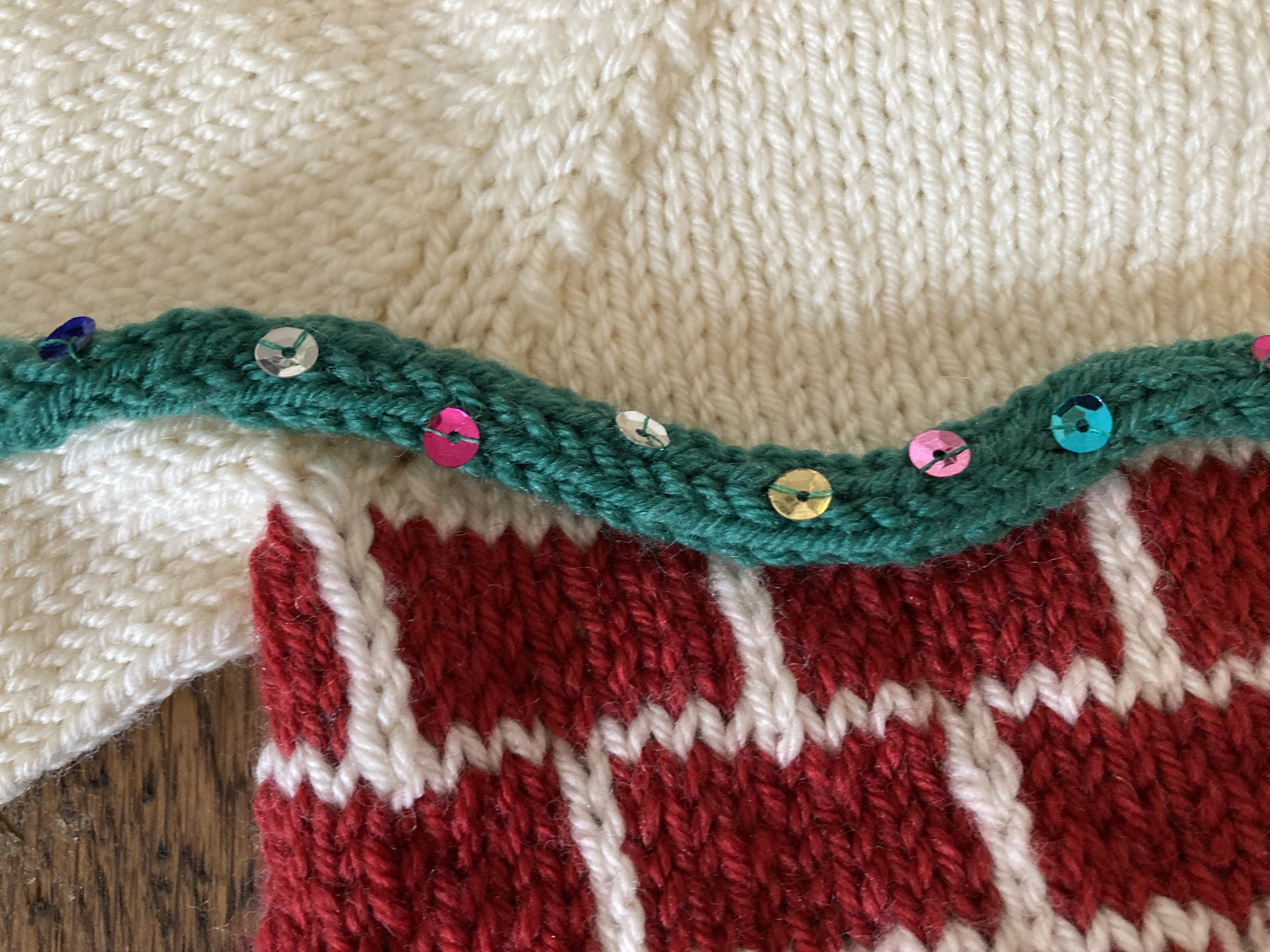 I’ve also frogged back the collar and chest of my granddaughter’s Christmas sweater so that I could make it a little bit longer because it was too difficult to get her little arms/hands into the sleeves. I frogged back until I reached where I had attached the “garland” which was a round or two from where the brick pattern ended. I decreased every third round until I had 80 stitches (I think. I have to go back and count the collar stitches.) It looks much better to me and, once again, I will have my answer when I get to New York for Christmas and try it on the baby. I hope I have time to make her a little Santa hat, too. My idea was to have her little face look like she’s Santa with her head sticking up out of the chimney. Ha! Ha! I’m not quite there but I think it’ll do.