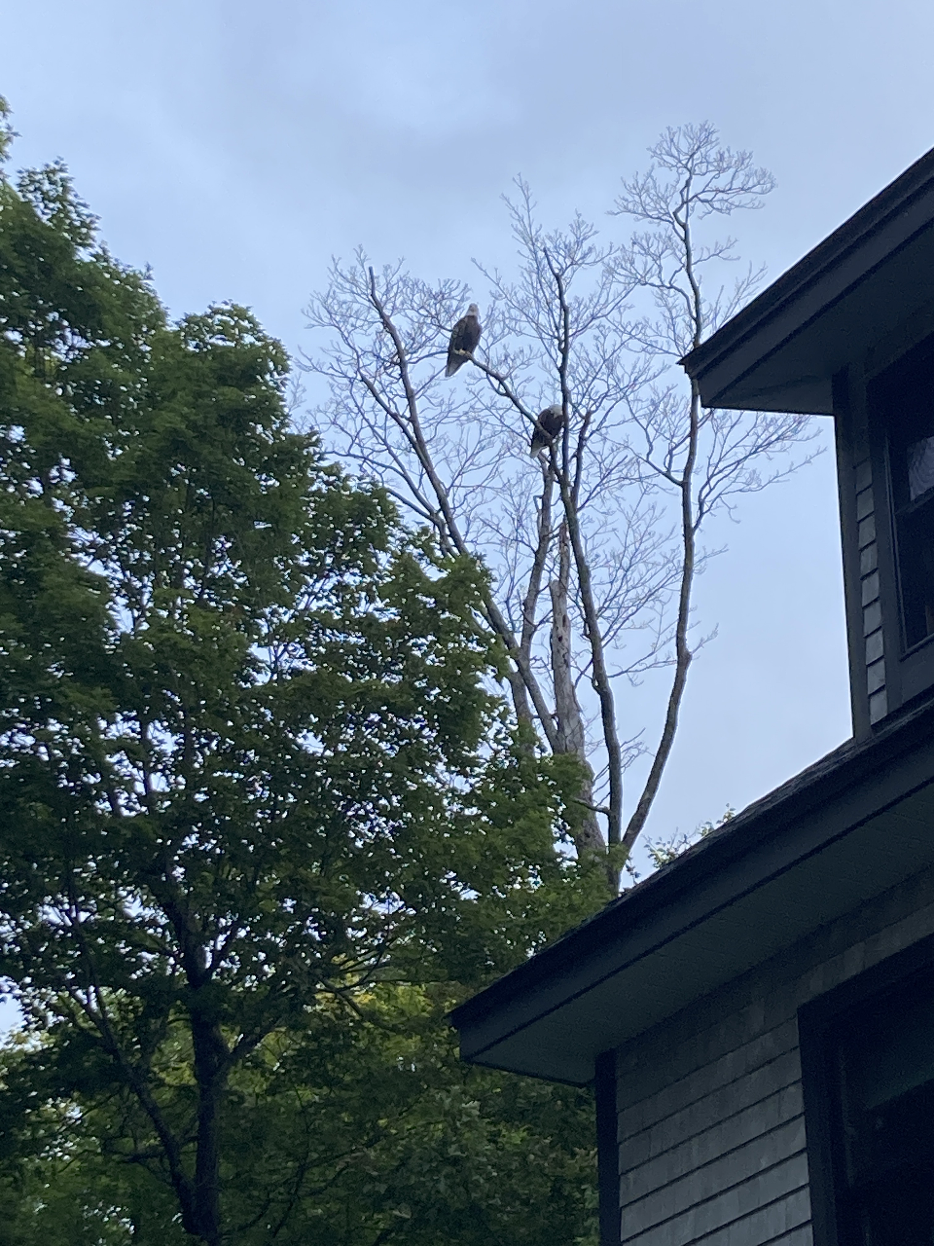 Our Messalonskee “TV” station has been providing so much entertainment in the last few days. We heard these two chirping at each other before we found them – it took a minute or two to figure out they were sitting in the tree at the corner of our shared driveway. And there they sat until my DH (dear hubby) had to chase down our naughty, wandering dog. We’ve seen a “critter” swimming by a couple of times and once it dove with a slap of its tail (a beaver). I’ve heard the owls in the evenings again which tells me they’re coming back out of the deep woods. And until this morning we had a couple of female hummingbirds. There’s been a lot of activity on and around the water with cormorants, gulls, loons, ducks and even a dead pike.