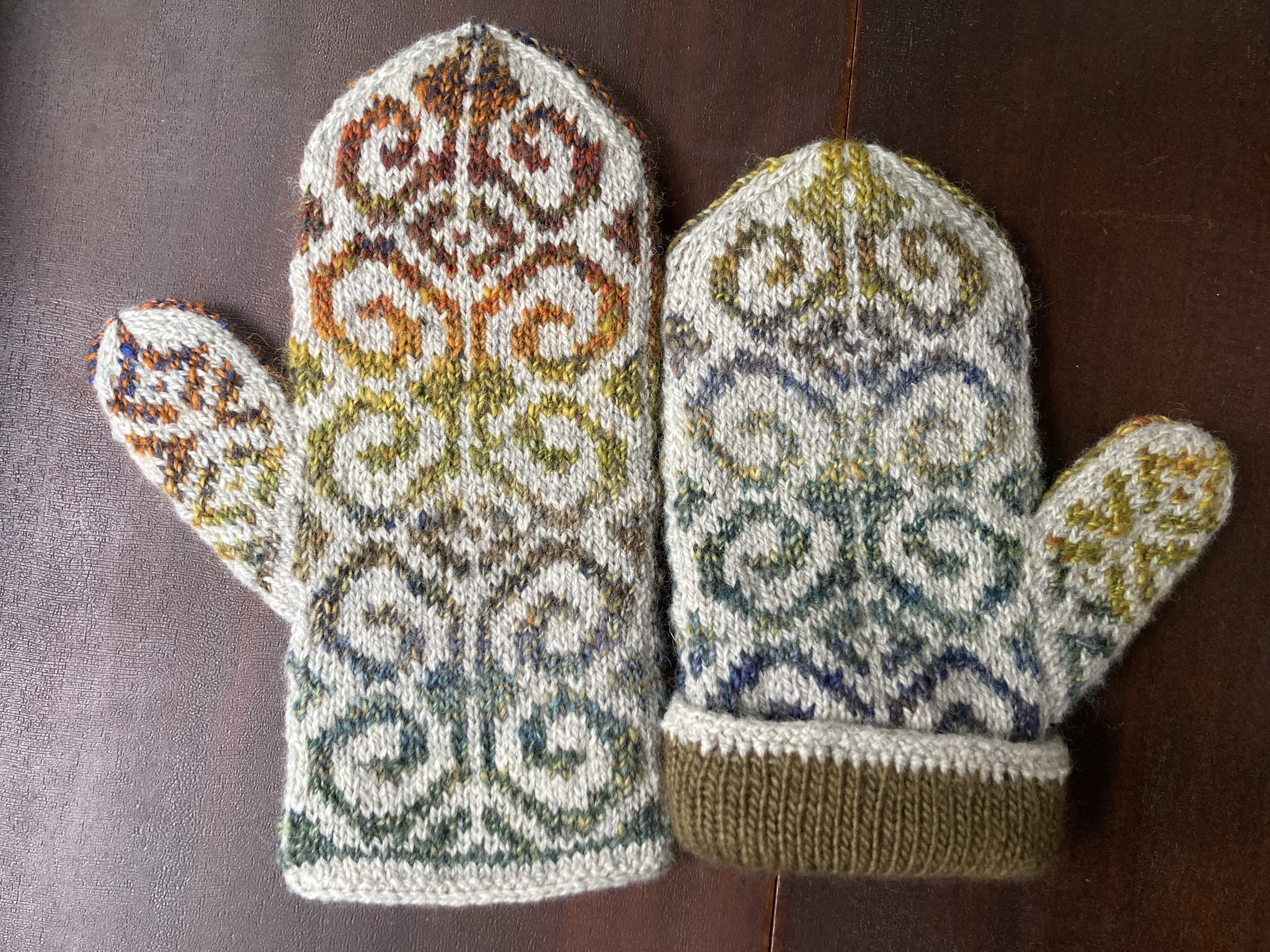 I’ve spoken about the baby hats and matching thumbless mittens. I’ve shown you the French Macaroon and cabled toddler mittens for my great-nephew’s birthday. And today I blocked my Fiddlehead Mittens and I’m tickled pink with them. They turned out beautifully if I do say so. I knit them with a partial skein of Patagonia organic merino by Juniper Moon Farm and a skein of handspun by Clarion Call Fiber Arts that my daughter gifted to me several years ago. I finally found the perfect project for it. The lining is knitted using a hank of yarn that I must have bought at Mardens years ago it’s Classic Elite Yarns, Escape. The Classic Elite company has closed. Despite the fact that these aren’t “my” colors, I love them.