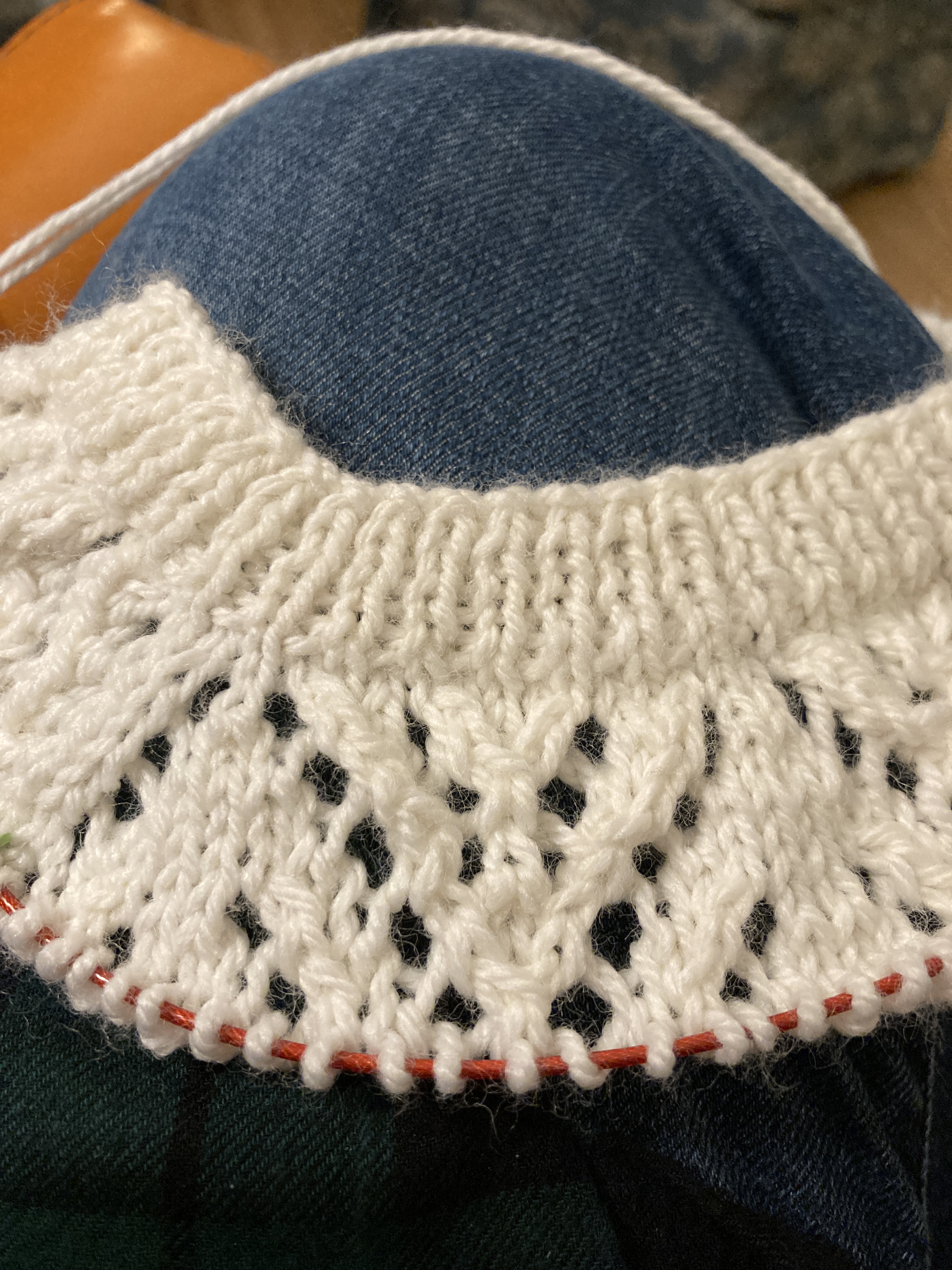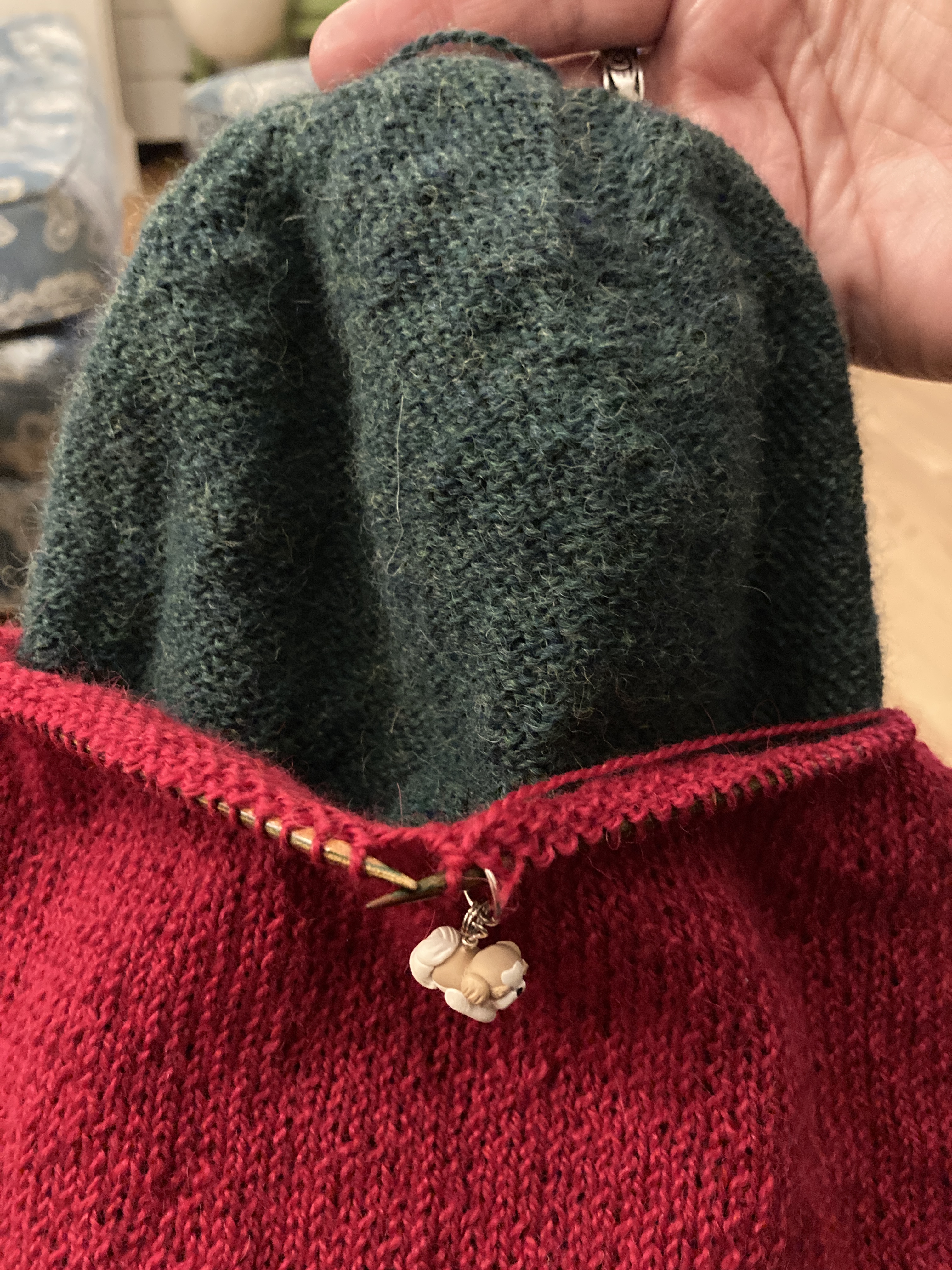 I’ve been working on two knitting projects this week so far. My Musselburgh hat for my future daughter-in-love in Herriot Fine in red and green. I’m almost to the decreases which means that it’ll be finished soon. Lots and lots of little stitches around and around on US3 needles with fingering weight alpaca yarn. The yarn is SO soft, though, it’s really a pleasure to work with.