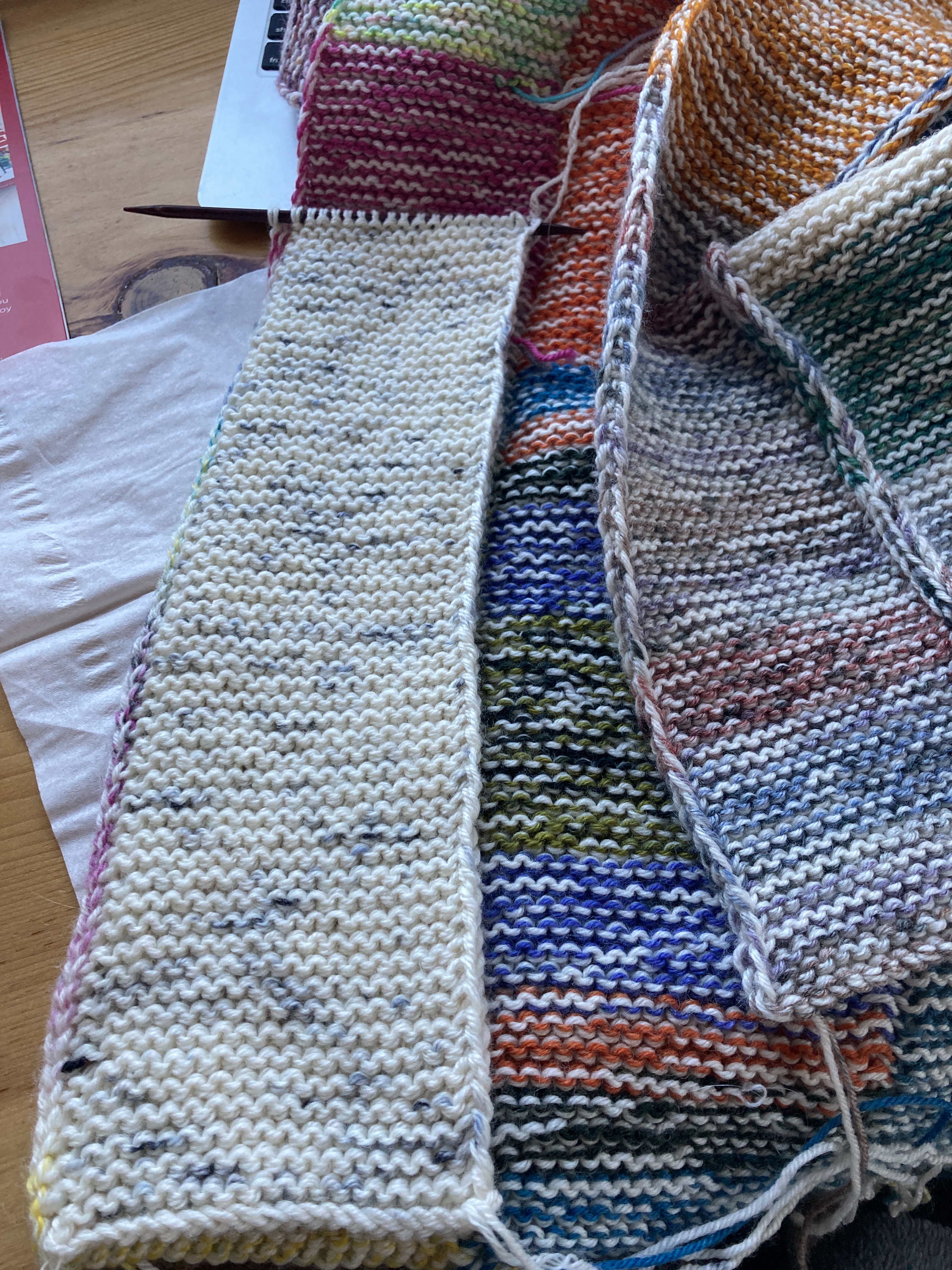 I’ve had to attend several zoom/google meets meetings online over the past week or so and I’ve been trying to catch up with a few of the podcasts and YouTube channels that I follow. My Jelly Roll Blanket is perfect for knitting while otherwise engaged and I’ve made some good progress on the blanket. I’ve finished one tiny ball of yarn scraps and one larger ball of yarn scraps and have moved on to a third. This blanket is all bits of yarn that I’ve used in other projects, mostly socks, held with a strand of cream colored sock yarn. I think I’ve said before that I bought a bag of sock yarn thinking that I would dye some yarn. Ha! That didn’t happen. This is a good use for that bag of yarn AND it helps to unify all the scrappiness of the blanket. I am about half-way through the fourth strip. This will be a long-term project.